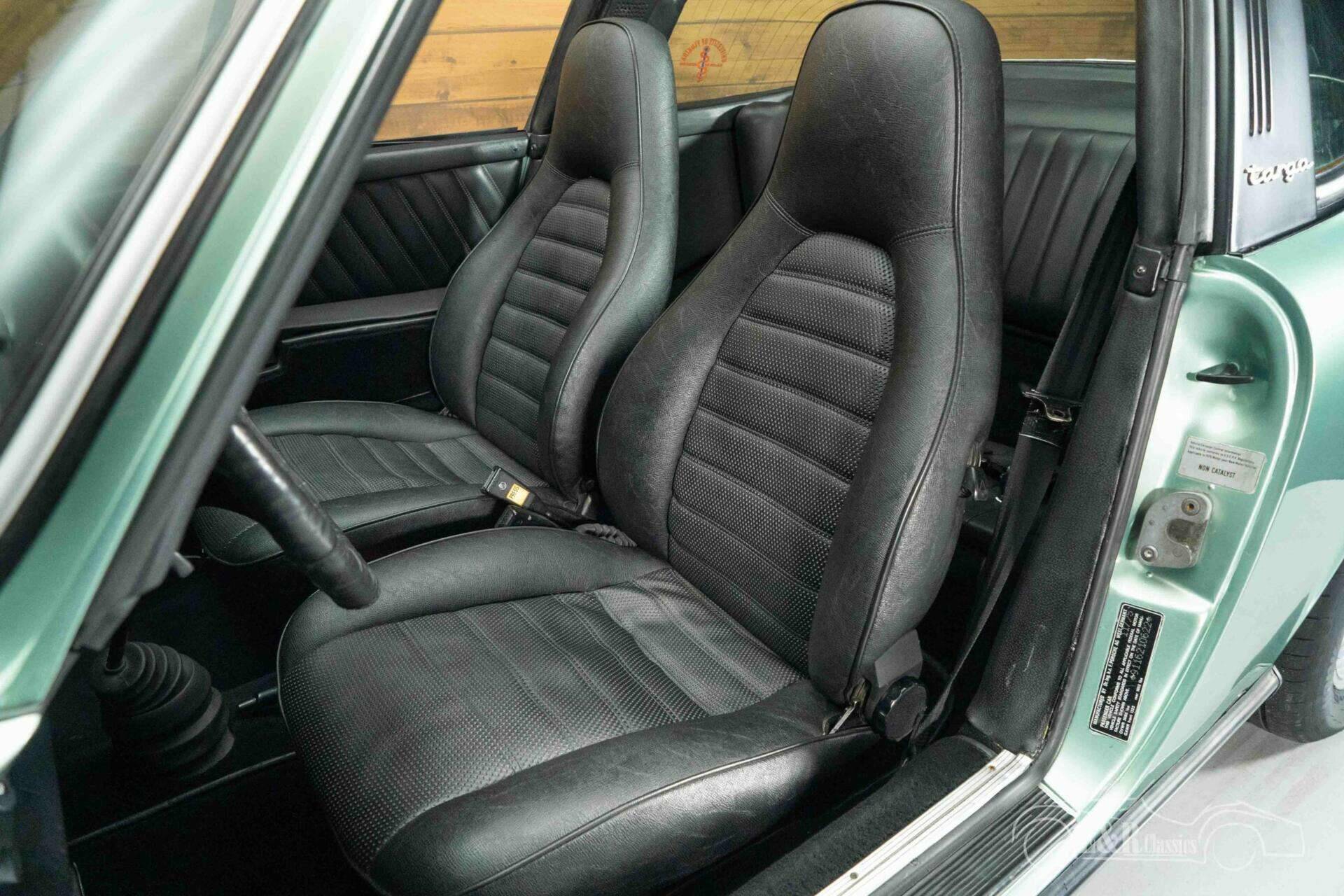 The exterior features the rare Ice Green Metallic paintwork, a color that perfectly complements the elegant lines of the 911 and contrasts beautifully with the black Targa roll bar. The classic Fuchs wheels underscore the car's sporty and authentic character. Inside, this Porsche boasts a black interior that exudes class and functionality, with signature sports seats and the familiar five-dial dashboard. The interplay between the fresh paintwork and the dark interior creates a timeless, stylish look that makes this 911 S Targa a true eye-catcher.