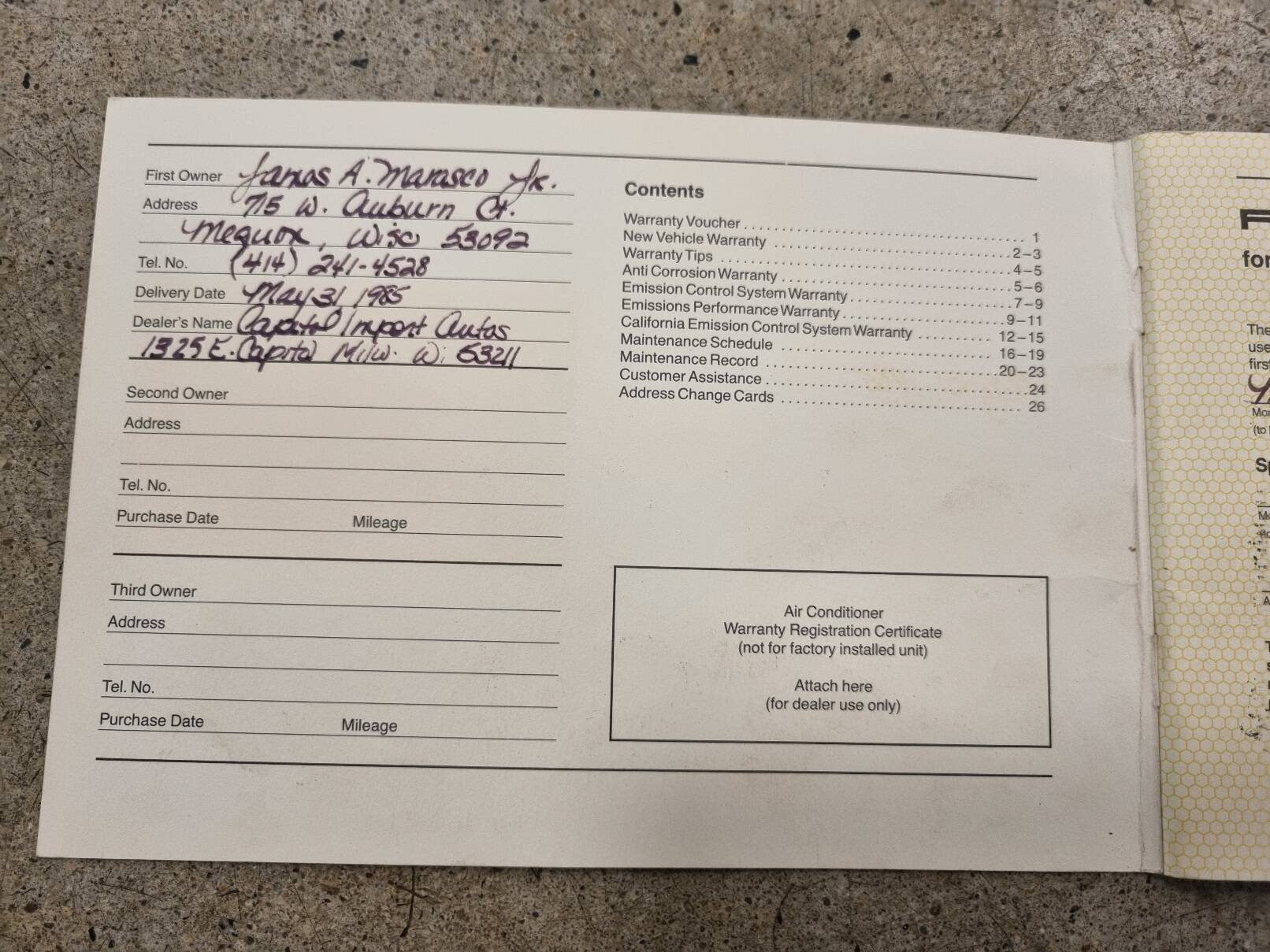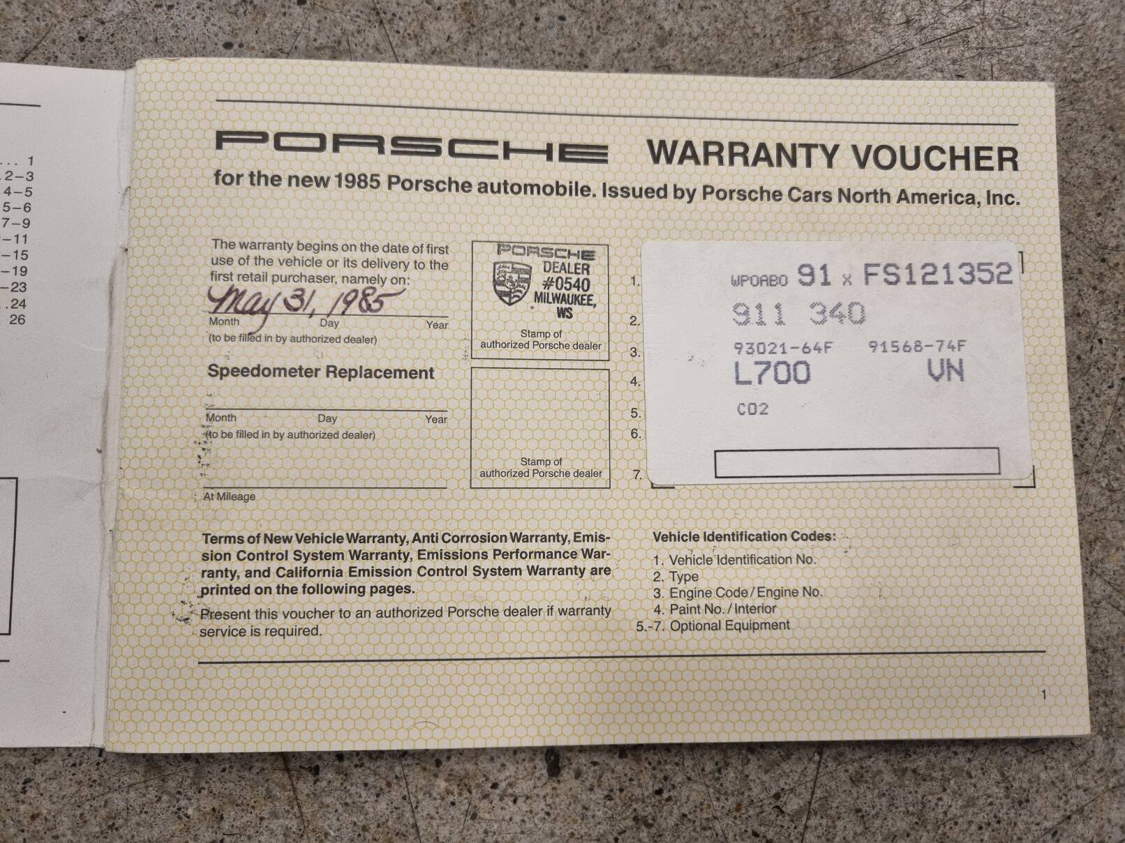Ursprünglich am 31. Mai 1985 zugelassen, wurde das Fahrzeug an Mr. James A. Marasco Jr. aus Milwaukee, Wisconsin (USA) ausgeliefert. Das Porsche Garantie- und Wartungsheft ist ein besonderer Stolz: es sind elf offizielle Porsche-Händlerstempel (Händler Nr. 0540) enthalten, die die sorgfältige Wartung bis November 1993 und knapp unter 50.000 Meilen dokumentieren.
