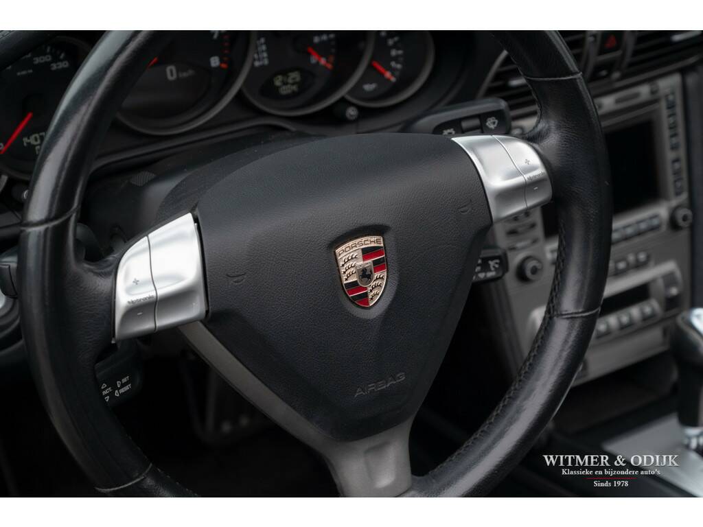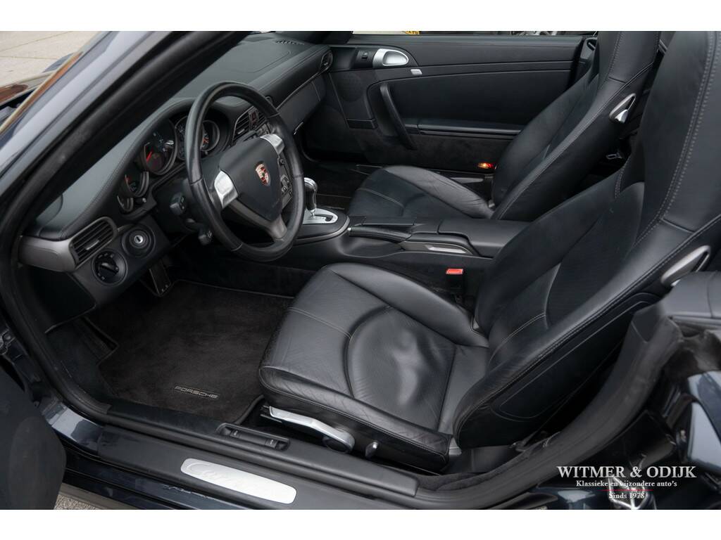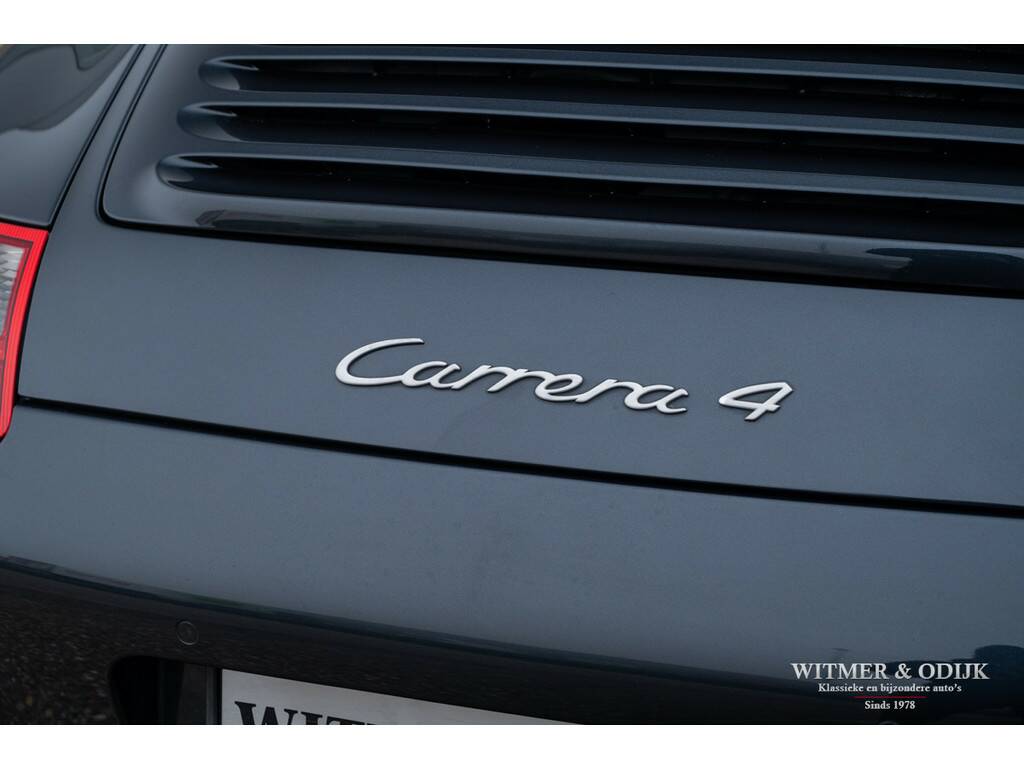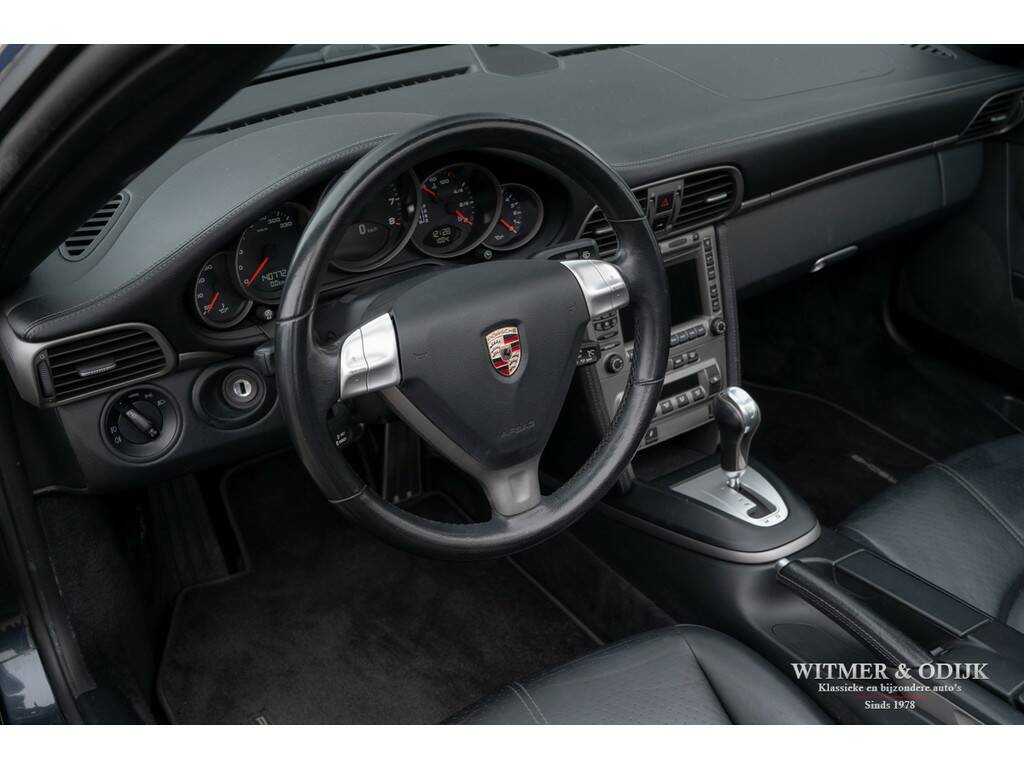Voor wie veiligheid en comfort in een Porsche minstens zo belangrijk zijn als sportiviteit en schoonheid is de 911 Carrera 4 Tiptronic Cabriolet een zeer goed optie. Immers dankzij de permanente vierwielaandrijving, zes airbags, Porsche Stability Management (een electronische combinatie van ABS en Traction Control) en elektronisch instelbare schokdempers moet u echt extreme handelingen verrichten om de auto van de weg te krijgen. Tegelijkertijd heeft Porsche die prachtige vierwiel-techniek ondergebracht in de Turbo-brede carrosserie die wordt gezien als de mooiste in de serie. Bovendien zijn er dan nog zaken als bijvoorbeeld automatische overroll bescherming, en het opklapbare windscherm, die maken dat zelfs uw kapper deze auto een goed idee vindt. Niet iedere Porsche koper had destijds de forse meerprijs voor de brede Carrera 4 uitvoering over, of ter beschikking, dus ze zijn behoorlijk zeldzaam. Zeker wanneer het een origineel Nederlands geleverde auto is, zo mooi dat er zelfs geen steenslag of andere gebruikssporen op de lak zichtbaar zijn. Uitgevoerd in een zeer fraaie en zeldzame kleurstelling Atlas Grey Metallic is deze 997 Carrera 4 in alle opzichten een heerlijke auto. Zeer compleet uitgerust met o.a. automatische climat control, cruise control, boordcomputer, elektrisch verstelbare stoelen, Porsche Communication Management met CD speler en DVD navigatie, Porsche Active Suspension Management, Porsche Stability Control, Parc Distance Control, automatische Tiptronic-S versnellingsbak met stuurbediening, xenon verlichting, een volledig in leer uitgevoerd interieur, opklapbaar windscherm, 19 inch Porsche Classic Design velgen, etc. In de bijzondere kleur Atlas Grey Metallic uitgevoerd. Geheel schadevrij en perfect in de fraaie lak. Dankzij garage-stalling heeft de lak ook een mooi diepe glans. Er zijn geen vermeldenswaardige gebruikssporen, ook niet op de bumpers of steenslag. Het cabriodak is mooi donker van kleur en zonder sporen van gebruik. De autoverkoper zou schrijven 'nieuwstaat'. Prachtig origineel interieur zonder gebruikssporen. Als optie werd het geheel in leer uitgevoerd. Dus ook de deurpanelen en het dashboard zijn evenals de stoelen met leer bekleed. Geen instapsporen op de stoelen. Op de vloer originele en keurig schone Porsche matten. Alle schakelaars, knopjes, klokken en het met leer beklede stuur zijn fris en onbeschadigd. Uiteraard is er niet in de auto gerookt. Velgen, motor- en kofferruimte zijn allen als nieuw. De Michelin Pilot Sport banden waren aan de voorzijde toe aan vernieuwing hetgeen wij gedaan hebben. De velgen zijn volledig onbeschadigd. Nieuw verkocht door een Nederlandse Porsche dealer in 2006. De auto is altijd keurig dealer onderhouden geweest, het originele onderhoudsboekje laat dit ook zien. Bij de auto zijn alle originele boekjes en sleutels. U krijgt de auto afgeleverd inclusief nieuwe APK, garantie en onderhoudsbeurt. Klaar voor een mooie heerlijke zomer.