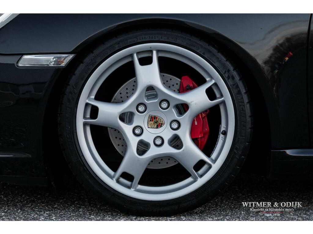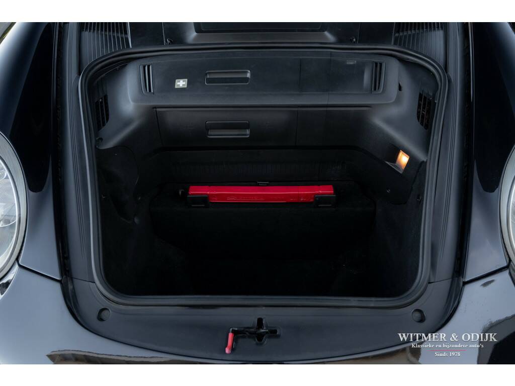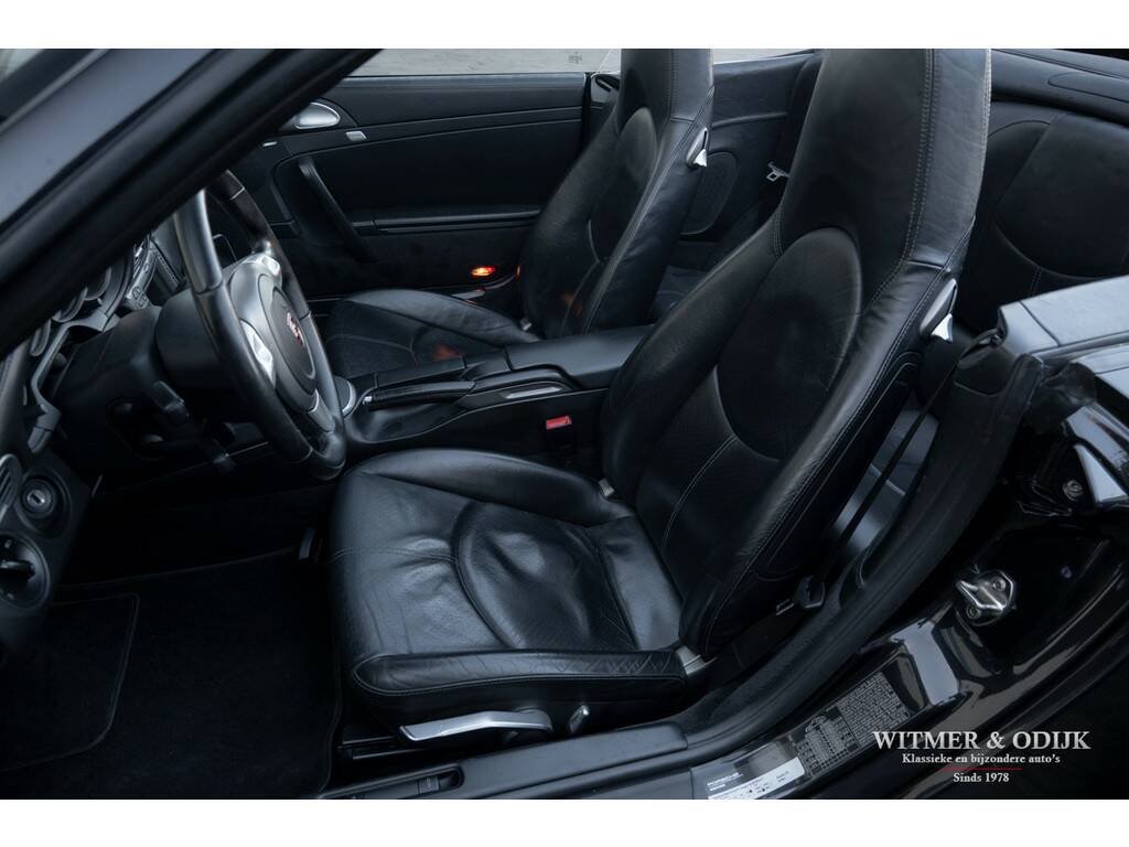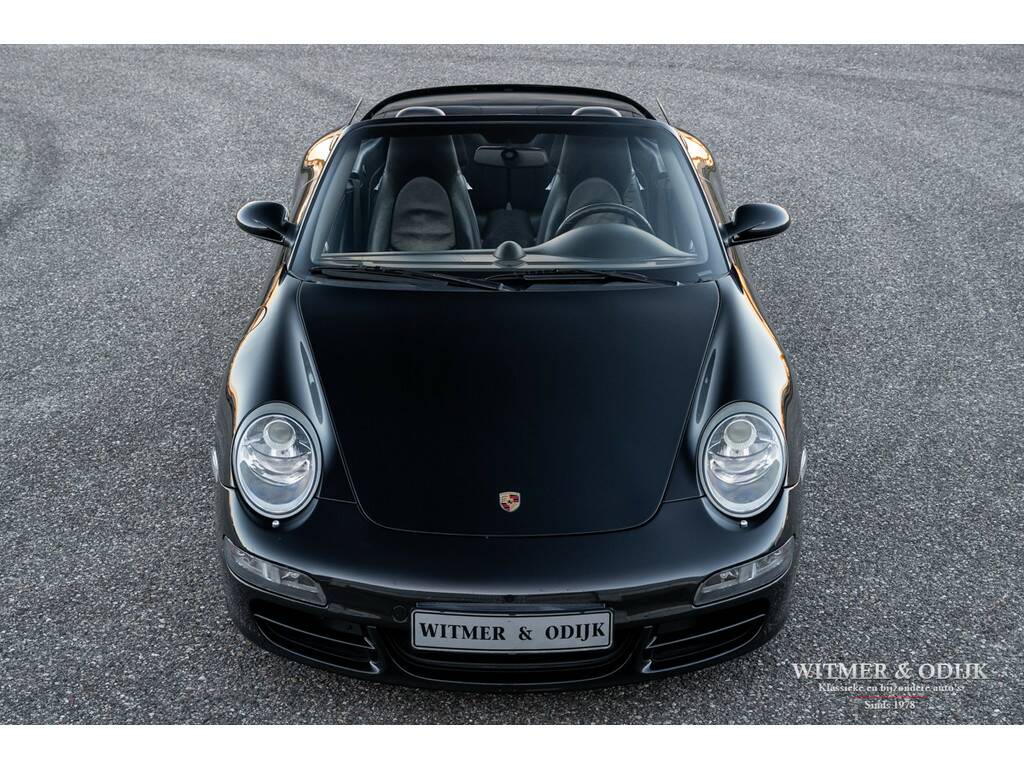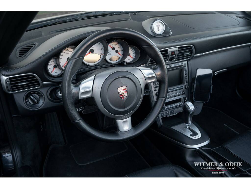 In de 997 herkennen de meeste Porsche liefhebbers weer de looks die men in een 911 zoekt. Anno nu dan. Een lekkere brede achterpartij en aan de voorzijde de vermaarde ronde koplampen. Dit in combinatie met de moderne versie van Porsche's watergekoelde zescylinder boxer. In de Carrera S uitvoering levert deze 3,8ltr. motor maar liefst 355pk. Dat lijkt met het dak open dan wel een motorfiets zonder helm... in 5,2 sec. flitst u naar de 100km/u en daat gaat dan pijlsnel door naar 293km/u. Even naar Albert Heijn kan in alle rust overigens. De 997 wordt ook geroemd om zijn allround inzetbaarheid. Deze Carrera S Cabriolet is een prachtige diep zwarte stijlvolle verschijning, voorzien van een flinke lijst interessante en goed bij de configuratie van de auto passende opties. Het hier aangeboden exemplaar is voorzien van de comfortabele Tiptronic-S automatische versnellingsbak die desgewenst ook handmatig vanaf het stuur sportief schakelbaar is. De automaat ziet immers niet wanneer er een leuke bocht aankomt of u haalt 'even' iemand in. De Carrera S versie kreeg ter herkenning van de fabriek rode remklauwen, dubbele uitlaten en 19 inch Carrera velgen mee. De Porsche 997 is een cabriolet die met het dak erop óók mooi is. Het zwarte charmante stoffen cabriodak laat de brede carrosserie extra goed tot zijn recht komen. De auto heeft een iets verlaagd onderstel, dit komt het sportieve weggedrag ten goede. Voor wie meer comfort wenst kunnen desgewenst originele veerpoten geplaatst worden. Zeer compleet te noemen; automatische climat control, electrische stoelverstelling, boordcomputer, Porsche Communication Management met DVD navigatie en CD wisselaar, stoelverwarming, Parc Distance Control, Porsche Active Suspension Management, xenon verlichting, Porsche Stability Management, Sport Chrono Package, verstelbaar stuur, opvouwbaar windscherm, een volledig in leer uitgevoerd interieur, Bose luidsprekers met subwoofer, automatische Tiptronic-S versnelling met desgewenst handmatige bediening op het stuur, cruise control, etc. In strak zwart metallic uitgevoerde originele schadevrije carrosserie. Er is geen steenslag zichtbaar en zonder er zijn nauwelijks gebruikssporen. Ook de bumpers zijn vrij van parkeervegen of beschadigingen. Het zwarte cabriodak is in mooie onbeschadigde conditie en voorzien van een verwarmde glazen achterruit. Het interieur is volledig in zwart leer uitgevoerd. Dus ook op dashboard en deurpanelen treft u leer, afgewerkt met dubbele stiksels. Het interieur heeft geen vermeldenswaardige gebruikssporen en er is nooit gerookt in de auto. Vloerbekleding onbeschadigd, originele foutloze mattenset aanwezig. Alle hendels en schakelaars mooi schoon en zonder slijtage. Bij ongeveer 120.000km werd de motor van deze 997 Carrera S Cabriolet geheel gereviseerd, deze motor heeft dus slechts 65.000km gedraaid! Verder is alles in de motorruimte origineel en schoon. Alle fabrieksstickers op de originele plaats. De kofferruimte fris en ongebruikt, hier treft u tevens de DVD navigatie leesapparatuur en het originele boordgereedschap. De 19 inch Carrera S velgen zijn vrijwel onbeschadigd en voorzien van uitstekende Pirelli P-zero banden met Porsche N-codering. Nieuw geleverd als 'Werksauslieferung' door de Porsche fabriek in 2006. Afkomstig van de derde eigenaar, een vaste klant die zijn volgende 911 bij ons kocht. Altijd netjes onderhouden door de Porsche dealer of een specialist. Uit het originele onderhoudsboekje valt op te maken dat dit keurig conform het Porsche schema werd uitgevoerd. Deze 997 Carrera S Cabriolet is altijd schadevrij gebleven en de carrosserie is optisch zelfs 'zo goed als nieuw'. Ook deze Porsche wordt door ons afgeleverd inclusief onze bekende garantie, nieuwe APK en onderhoudsbeurt. Geheel rijklaar zonder bijkomende kosten.