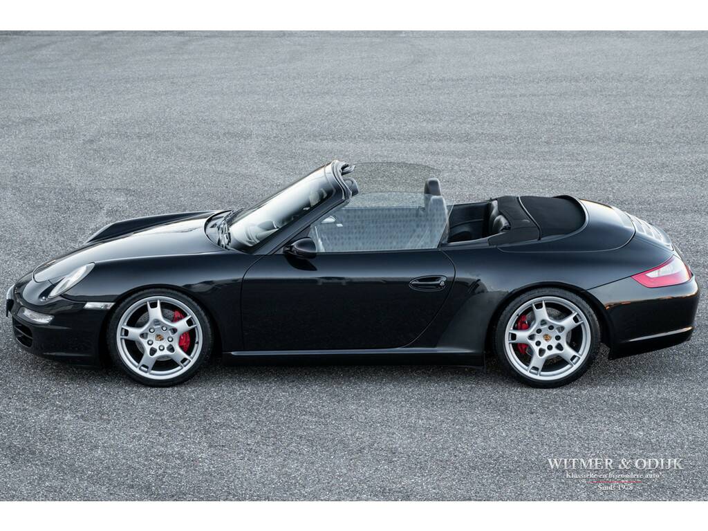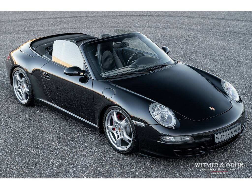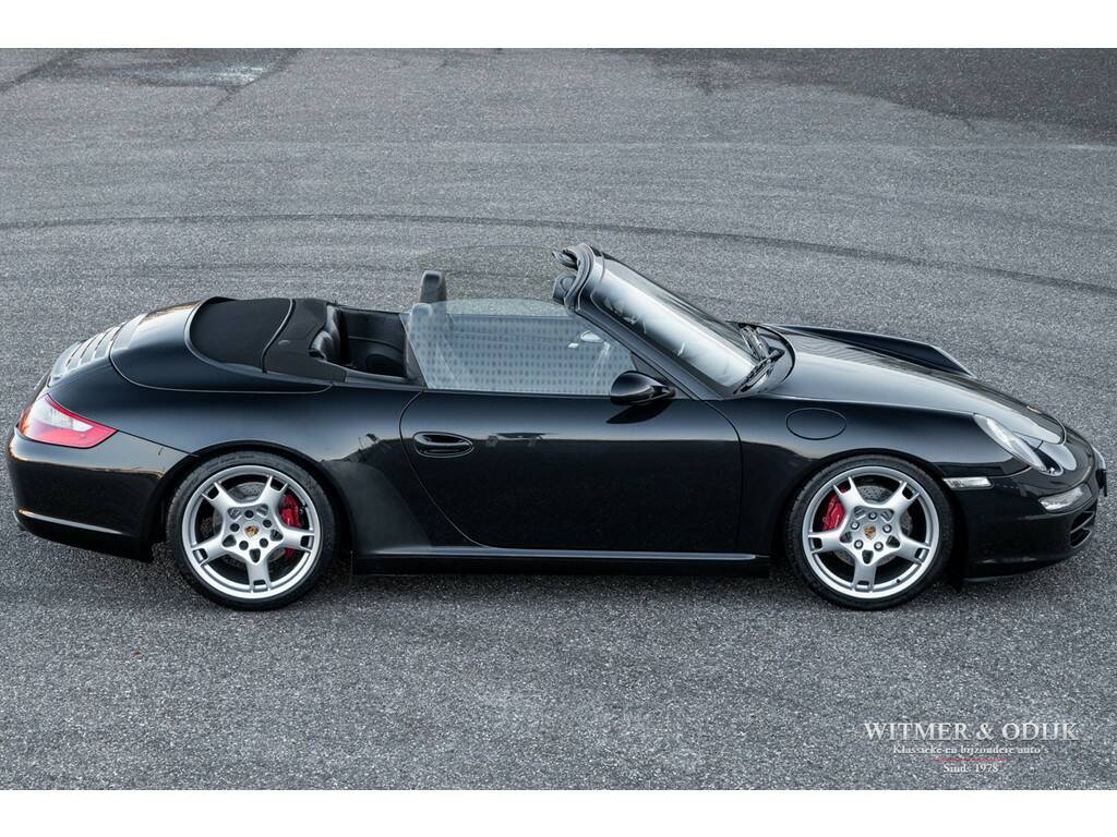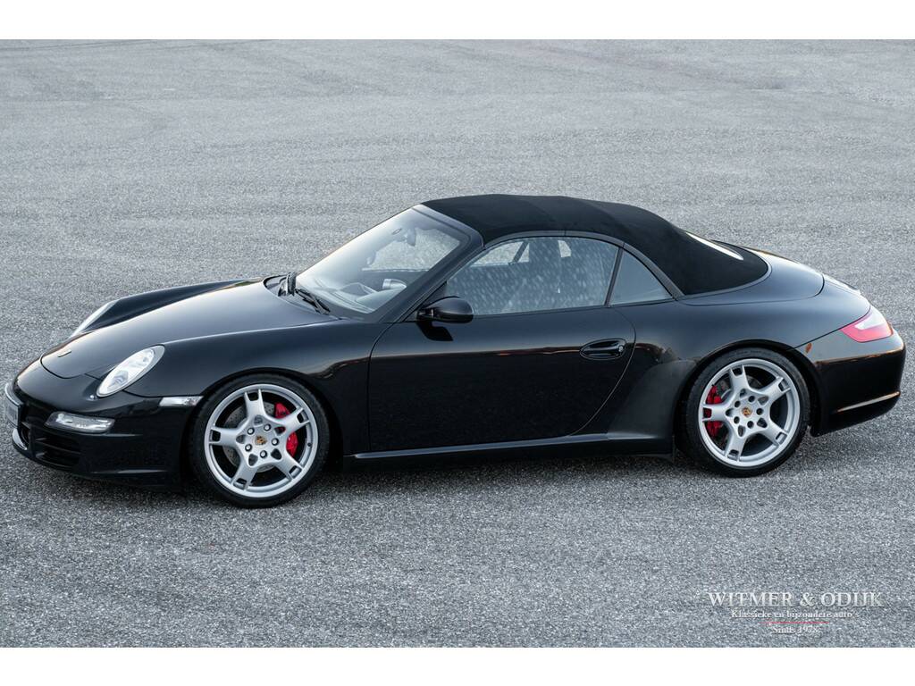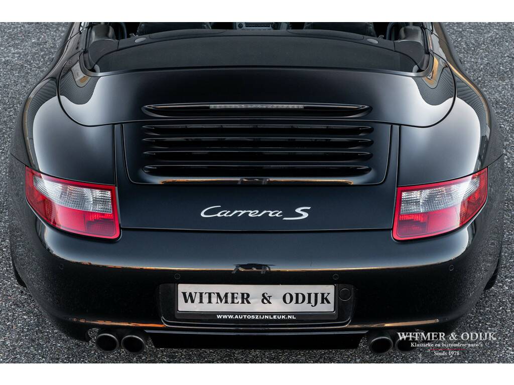 In de 997 herkennen de meeste Porsche liefhebbers weer de looks die men in een 911 zoekt. Anno nu dan. Een lekkere brede achterpartij en aan de voorzijde de vermaarde ronde koplampen. Dit in combinatie met de moderne versie van Porsche's watergekoelde zescylinder boxer. In de Carrera S uitvoering levert deze 3,8ltr. motor maar liefst 355pk. Dat lijkt met het dak open dan wel een motorfiets zonder helm... in 5,2 sec. flitst u naar de 100km/u en daat gaat dan pijlsnel door naar 293km/u. Even naar Albert Heijn kan in alle rust overigens. De 997 wordt ook geroemd om zijn allround inzetbaarheid. Deze Carrera S Cabriolet is een prachtige diep zwarte stijlvolle verschijning, voorzien van een flinke lijst interessante en goed bij de configuratie van de auto passende opties. Het hier aangeboden exemplaar is voorzien van de comfortabele Tiptronic-S automatische versnellingsbak die desgewenst ook handmatig vanaf het stuur sportief schakelbaar is. De automaat ziet immers niet wanneer er een leuke bocht aankomt of u haalt 'even' iemand in. De Carrera S versie kreeg ter herkenning van de fabriek rode remklauwen, dubbele uitlaten en 19 inch Carrera velgen mee. De Porsche 997 is een cabriolet die met het dak erop óók mooi is. Het zwarte charmante stoffen cabriodak laat de brede carrosserie extra goed tot zijn recht komen. De auto heeft een iets verlaagd onderstel, dit komt het sportieve weggedrag ten goede. Voor wie meer comfort wenst kunnen desgewenst originele veerpoten geplaatst worden. Zeer compleet te noemen; automatische climat control, electrische stoelverstelling, boordcomputer, Porsche Communication Management met DVD navigatie en CD wisselaar, stoelverwarming, Parc Distance Control, Porsche Active Suspension Management, xenon verlichting, Porsche Stability Management, Sport Chrono Package, verstelbaar stuur, opvouwbaar windscherm, een volledig in leer uitgevoerd interieur, Bose luidsprekers met subwoofer, automatische Tiptronic-S versnelling met desgewenst handmatige bediening op het stuur, cruise control, etc. In strak zwart metallic uitgevoerde originele schadevrije carrosserie. Er is geen steenslag zichtbaar en zonder er zijn nauwelijks gebruikssporen. Ook de bumpers zijn vrij van parkeervegen of beschadigingen. Het zwarte cabriodak is in mooie onbeschadigde conditie en voorzien van een verwarmde glazen achterruit. Het interieur is volledig in zwart leer uitgevoerd. Dus ook op dashboard en deurpanelen treft u leer, afgewerkt met dubbele stiksels. Het interieur heeft geen vermeldenswaardige gebruikssporen en er is nooit gerookt in de auto. Vloerbekleding onbeschadigd, originele foutloze mattenset aanwezig. Alle hendels en schakelaars mooi schoon en zonder slijtage. Bij ongeveer 120.000km werd de motor van deze 997 Carrera S Cabriolet geheel gereviseerd, deze motor heeft dus slechts 65.000km gedraaid! Verder is alles in de motorruimte origineel en schoon. Alle fabrieksstickers op de originele plaats. De kofferruimte fris en ongebruikt, hier treft u tevens de DVD navigatie leesapparatuur en het originele boordgereedschap. De 19 inch Carrera S velgen zijn vrijwel onbeschadigd en voorzien van uitstekende Pirelli P-zero banden met Porsche N-codering. Nieuw geleverd als 'Werksauslieferung' door de Porsche fabriek in 2006. Afkomstig van de derde eigenaar, een vaste klant die zijn volgende 911 bij ons kocht. Altijd netjes onderhouden door de Porsche dealer of een specialist. Uit het originele onderhoudsboekje valt op te maken dat dit keurig conform het Porsche schema werd uitgevoerd. Deze 997 Carrera S Cabriolet is altijd schadevrij gebleven en de carrosserie is optisch zelfs 'zo goed als nieuw'. Ook deze Porsche wordt door ons afgeleverd inclusief onze bekende garantie, nieuwe APK en onderhoudsbeurt. Geheel rijklaar zonder bijkomende kosten.