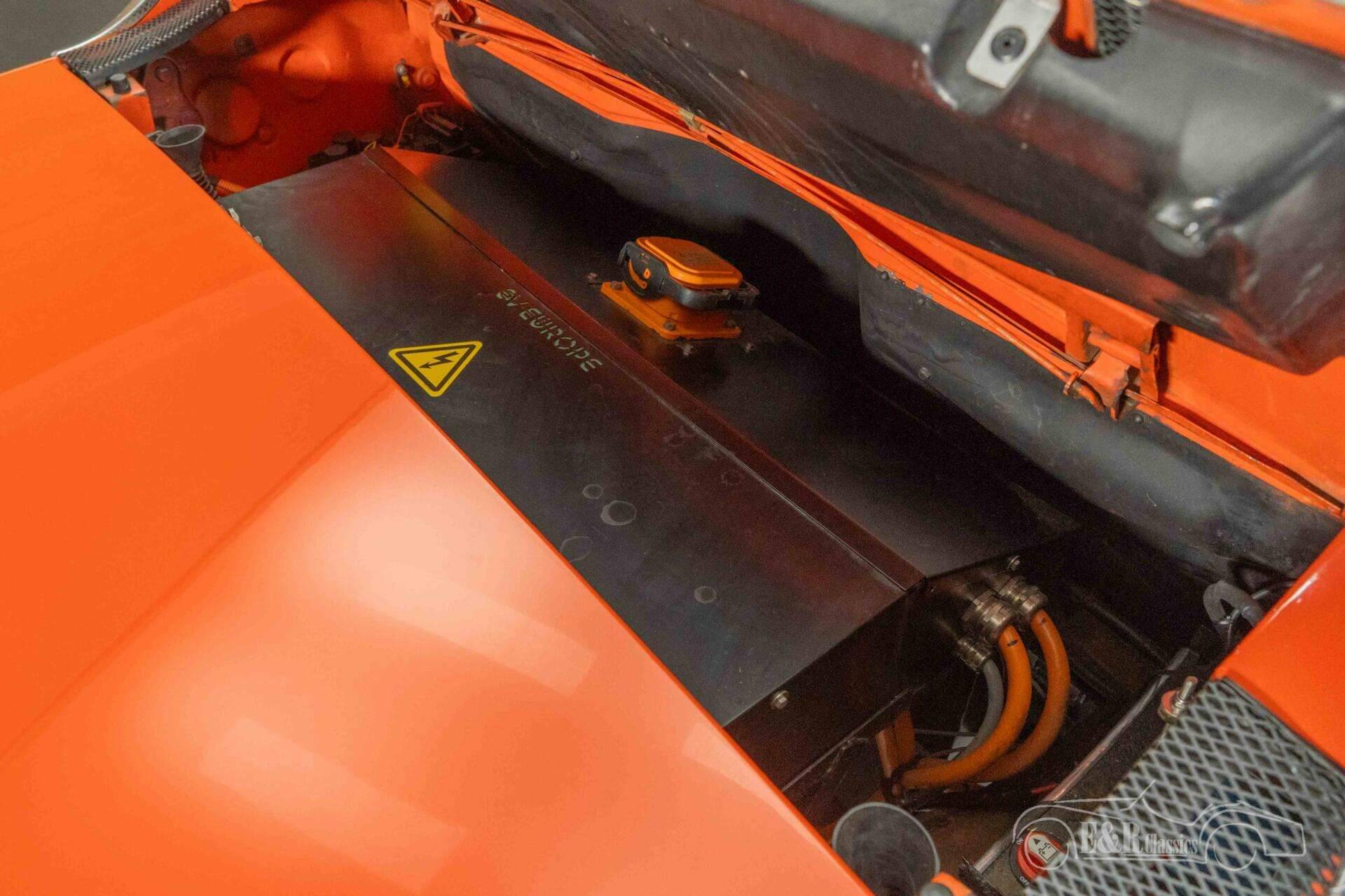 De Porsche 914 Electric uit 1971 is een uniek voorbeeld van klassiek design gecombineerd met moderne techniek. Deze auto werd oorspronkelijk nieuw geleverd in Italië en is tussen 2017 en 2020 uitvoerig gerestaureerd voordat hij door EV-Europe werd omgebouwd tot volledig elektrische sportwagen. De Hiper 9 elektromotor met Tesla-accupakket levert circa 125 pk, waarbij de originele 5-versnellingsbak behouden bleef voor een authentieke rijervaring. Sinds de elektrische conversie heeft de auto slechts 1.000 kilometer gereden – een bewijs van zijn uitstekende staat.
