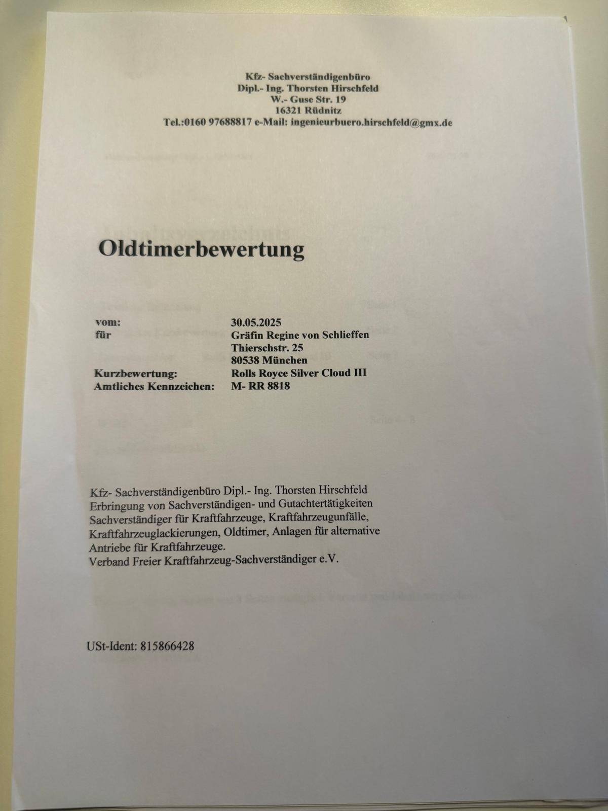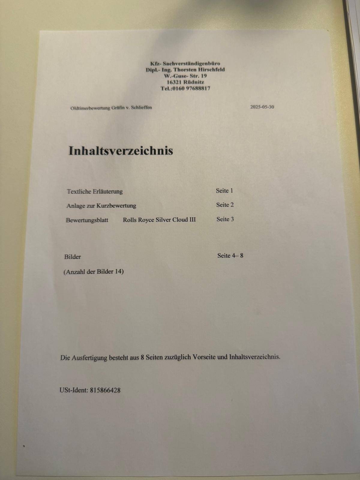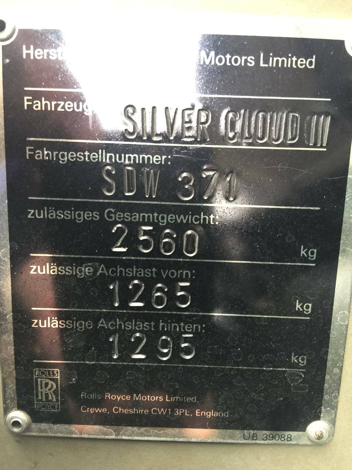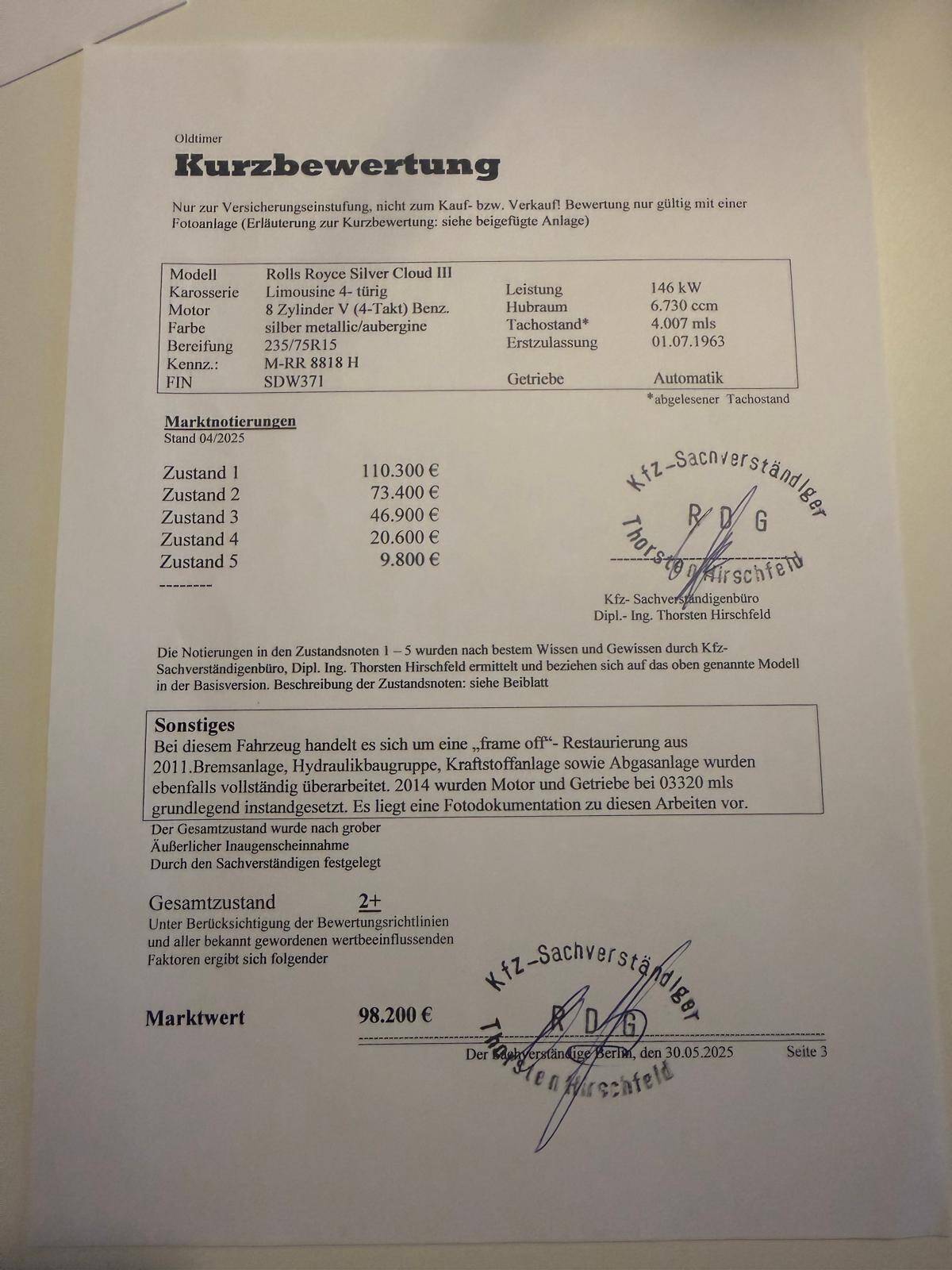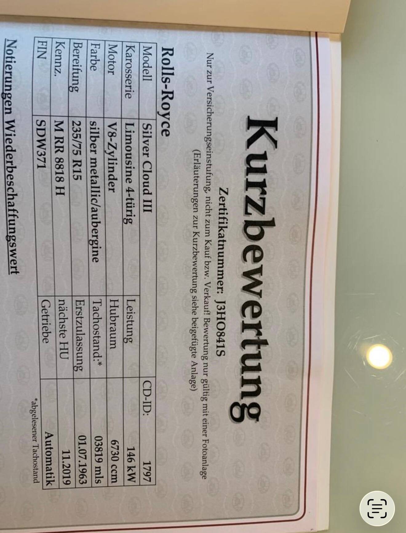 Ich verkaufe Roll Royce Silver Cloud III in einem fast perfekten Zustand( Classic-Data-Gutachten 2++) , der seit 40 Jahren in Familiären Besitzt ist und über ein lückenloses CheckHeft verfügt. Der Wagen wurde 2011 Frame Off restauriert ( Motor, Getriebe, Bremsen, usw.) und ist seither 1600km gelaufen. Der Wagen ist mit 100.000€ für den Verkauf bewertet, da ich aber aus persönlichen Gründen den Wagen schnellstmöglich verkaufen möchte, setze ich den Preis bei 68.000 € an.