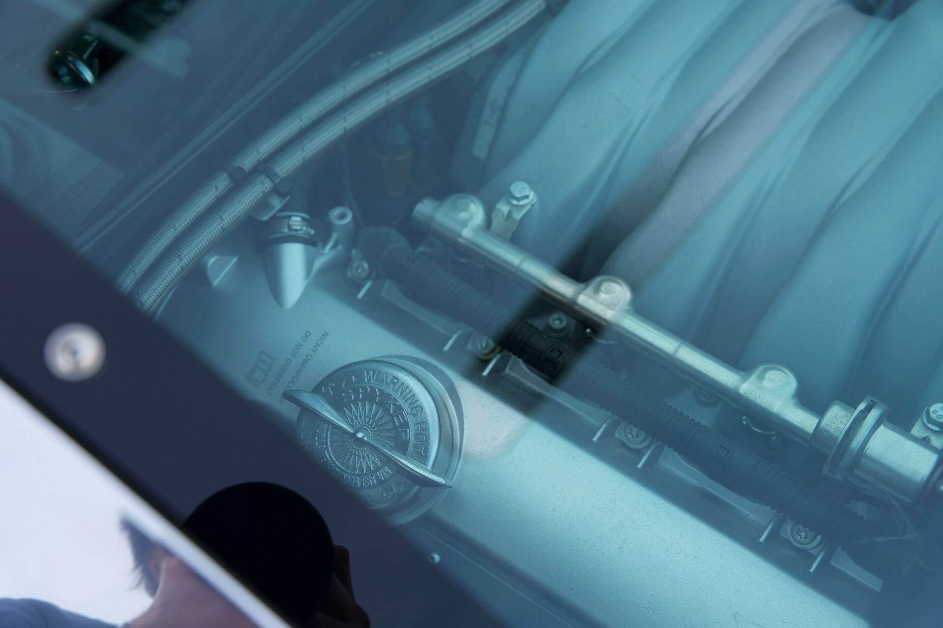 Natürlich ist dieser Spyker C8 Laviolette LM85 vollkommen schadenfrei. Seit 2009 wurden mit dem Auto nur 7.651 Kilometer gefahren. Das Autos befindet sich ohne Zweifel in einem tadellosen Zustand. Das Auto ist natürlich zu 100 Prozent original und befindet sich auch komplett im Erstlack. Beim Öffnen einer der nach oben aufklappbaren Türen fällt sofort auf, dass der Spyker seinerzeit sehr hochwertig gebaut wurde. Die Türen gehen sehr präzise und fast ohne Kraftaufwand hoch. Auch die Front des Wagens lässt sich leicht nach vorne klappen, um eine schöne Aluminium-Vorderradaufhängung freizugeben, die auch diverse Anbauteile aus dem Audi-Stall beherbergt. Der Spyker LM85 steht auf wunderschönen 19 Zoll „Aeroblade“ Rädern mit Zentralverschluss. Die Räder werden wunderschön von einem Paar extrem leistungsstarker AP-Bremsen mit 6 Kolben vorne und 4 Kolben hinten gefüllt.