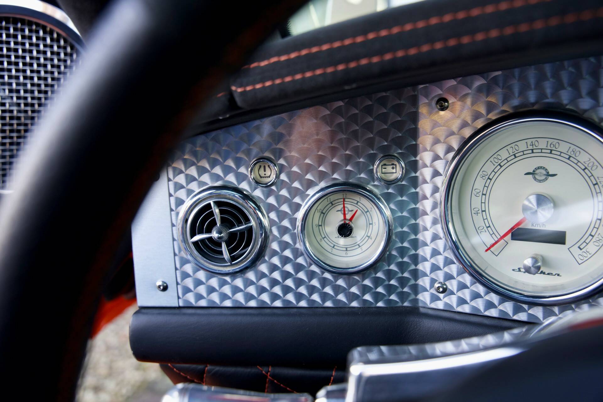 Auch das Interieur ist ein Kunstwerk und befindet sich natürlich in einem fast neuwertigen Zustand. Das Lenkrad ist mit einem Airbag ausgestattet und stammt von Lamborghini, da Spyker aufgrund von Typgenehmigungen das schöne Airbag-lose Lenkrad mit den charakteristischen vier Speichen nicht mehr montieren durfte. Die Instrumente haben alle einen schönen Spyker-Schriftzug und informieren Sie während der Fahrt über die lebenswichtigen Funktionen des Autos, die Instrumente sind schön grün beleuchtet. Die Sitze sind richtig bequem und sind mit schwarzem Leder an den Seiten und grauem Alcantara in der Mitte mit Diamant-Kedern bezogen. Das Armaturenbrett ist mit gebürstetem Aluminium ausgestattet. Am auffälligsten ist der sichtbare Schaltmechanismus. Als neuer Autohersteller war Spyker dank der Verwendung dieser wunderschön gestalteten Getriebesteuerung sofort so berühmt wie Ferrari. Es sieht nicht nur gut aus, sondern es funktioniert auch einwandfrei. Bei einem reinen Sportwagen nicht unwichtig.