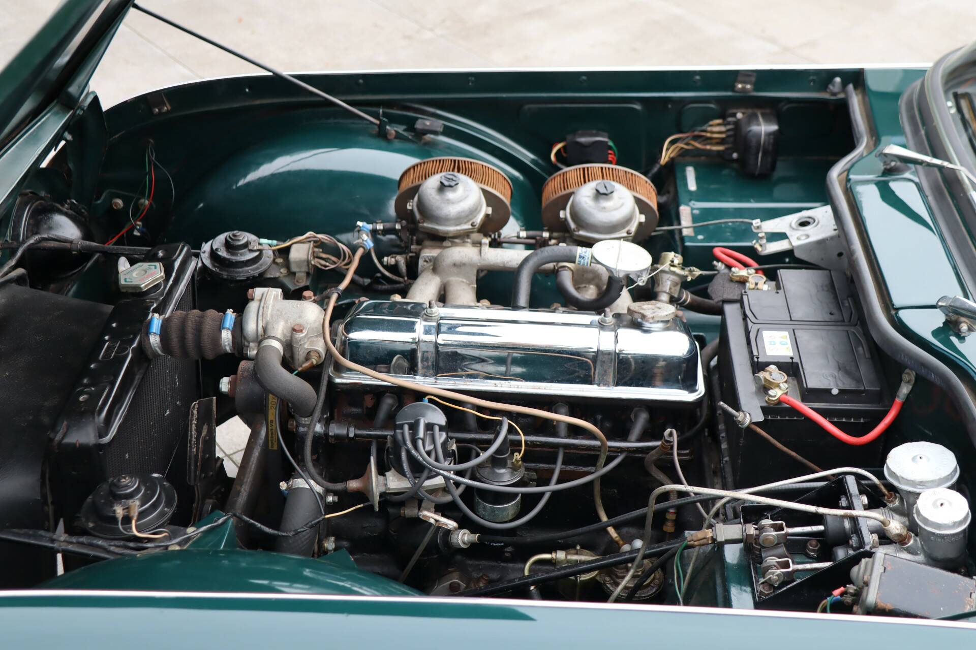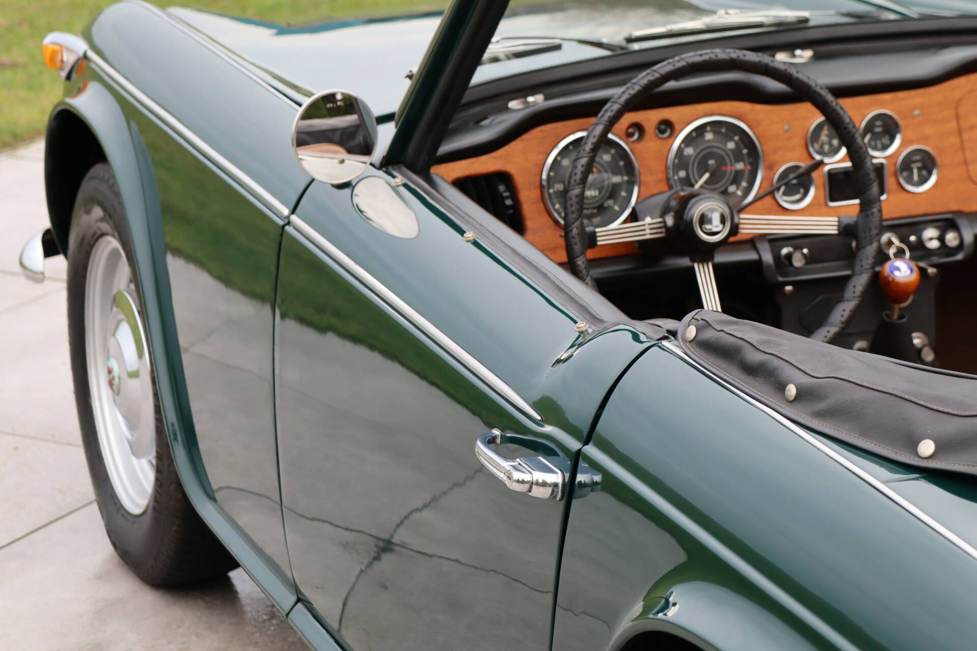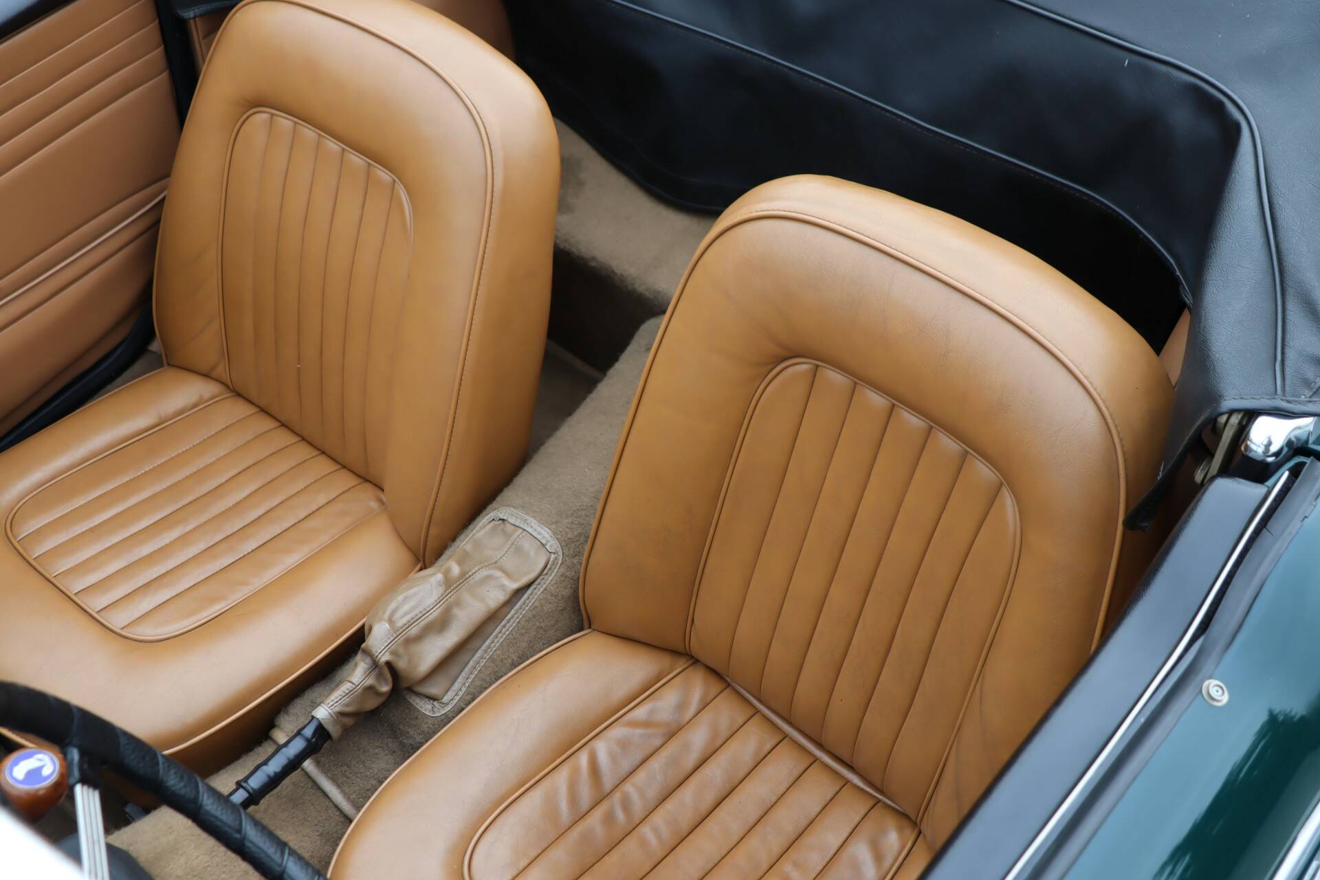 Ein echter Blickfang, insbesondere das von uns angebotene Exemplar in einer wunderschönen Farbkombination: British Racing Green (Farbcode 75) mit einer beigen Lederausstattung. Der Lack wurde in den 90er Jahren neu aufgetragen. Natürlich weist das Fahrzeug einige Gebrauchsspuren auf, aber die Karosserie wurde nicht geschweißt und es handelt sich um ein unfallfreies und sehr robustes Fahrzeug. Die Chromteile und die Beleuchtung sind in einem guten Zustand. Die Gummis weisen Gebrauchsspuren auf. Das schwarze Verdeck ist in einem guten Zustand ohne Risse. Um sich ein gutes Bild zu machen, sehen Sie sich unsere umfangreiche Fotoreportage an, einschließlich Fotos der Unterseite des Autos.