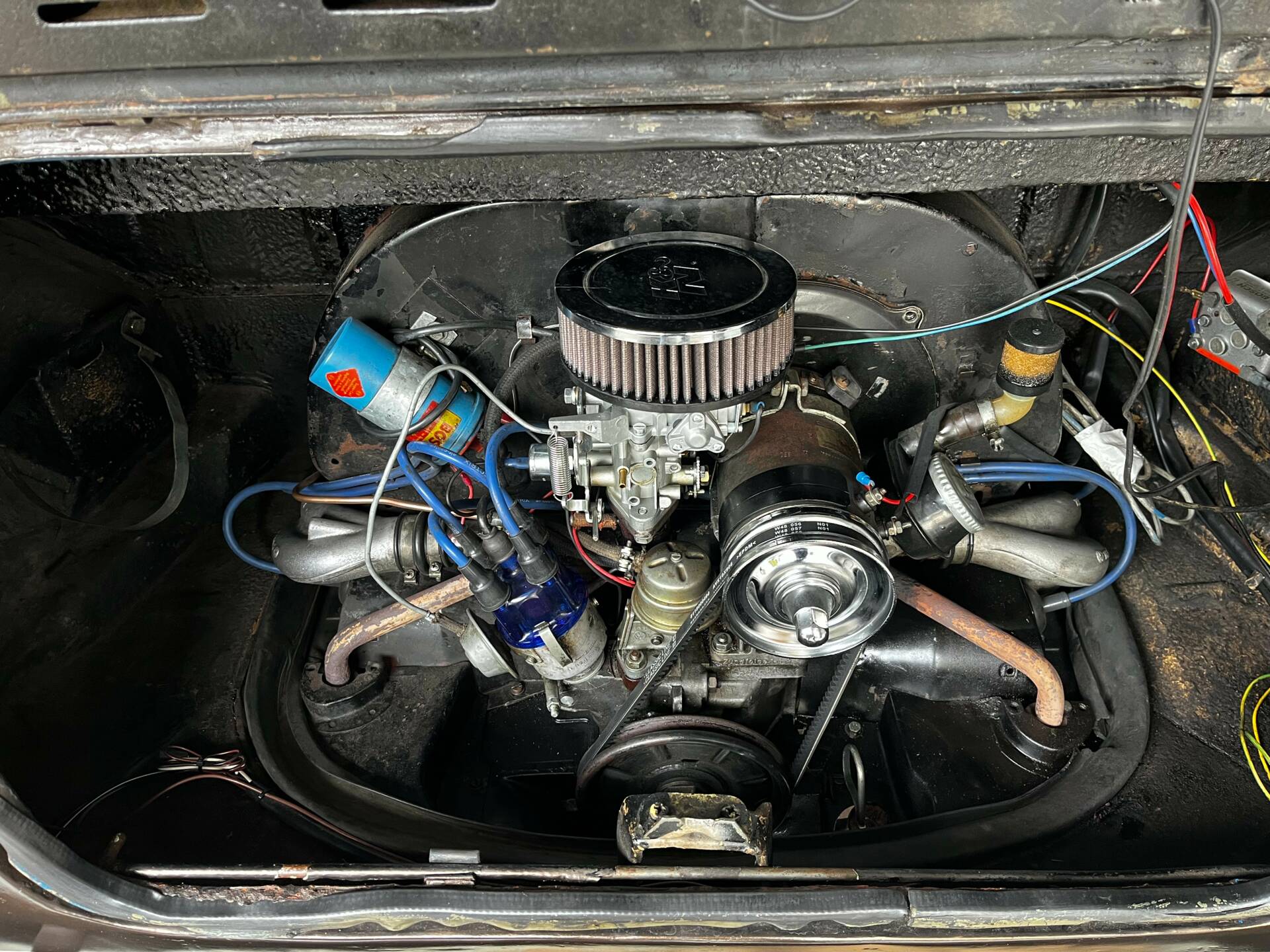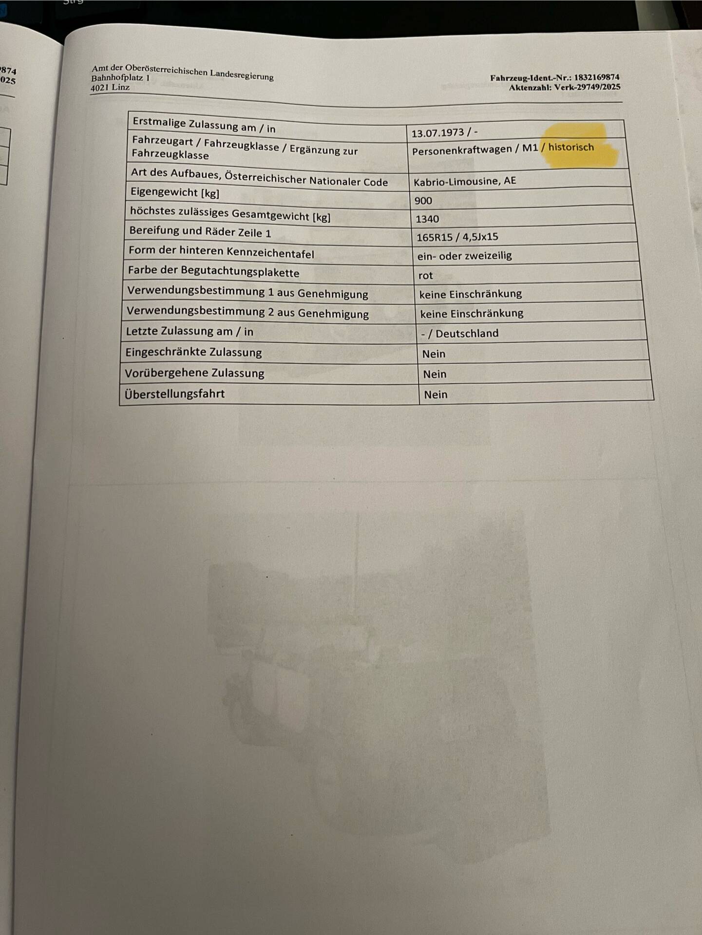 Der Motor ist voll funktionsfähig. Die Bremsen wurden 2017 erneuert. Ein Oldtimer-Style-Radio mit Soundsystem wurde nachgerüstet. Die Rücksitzpolster wurden ebenfalls erneuert. Das Verdeck ist voll funktionsfähig und nutzbar. Fenster können bei Bedarf eingebaut werden. Am Unterboden befinden sich einige Kratzer und vereinzelt Roststellen. Das Fahrzeug besitzt eine Einzelgenehmigung der österreichischen Behörden und ist als “Historisch“ zugelassen. Die österreichischen Straßenverkehrssicherheitsbescheinigungen (Pickerl) sind bis Mai 2026 gültig. Es wurde 2024 von Deutschland nach Österreich importiert und legte eine vergnügliche Fahrt von Frankfurt ins Salzburg in nur 7 Stunden zurück!