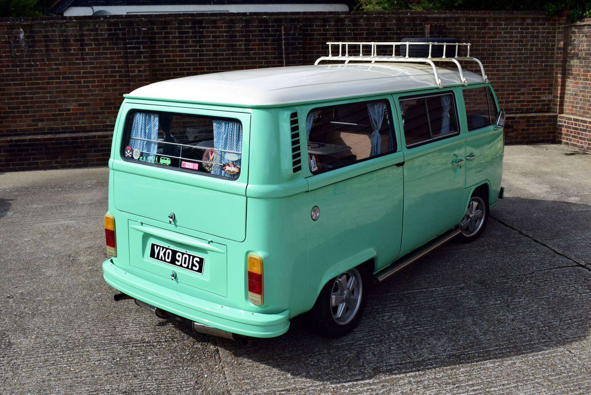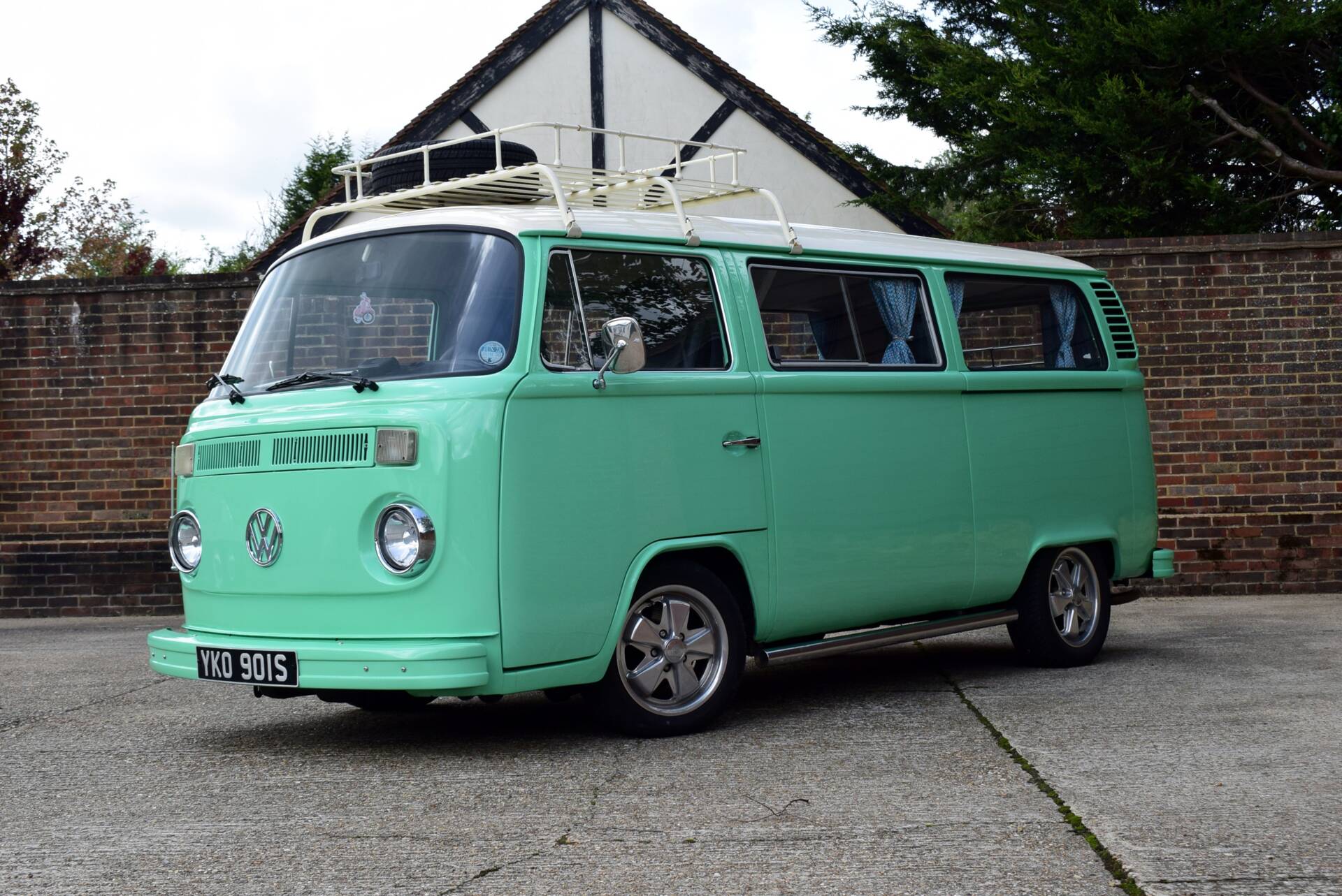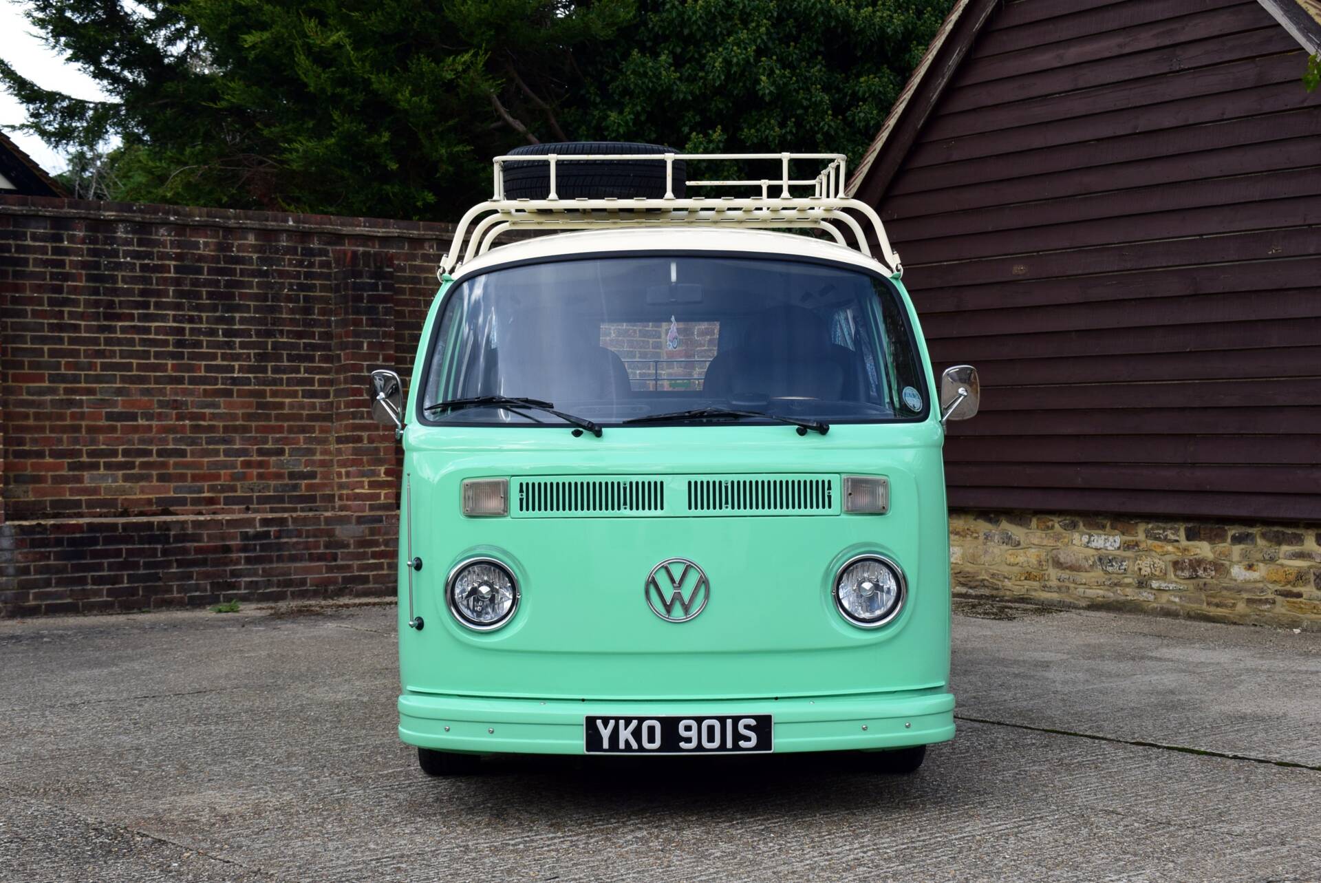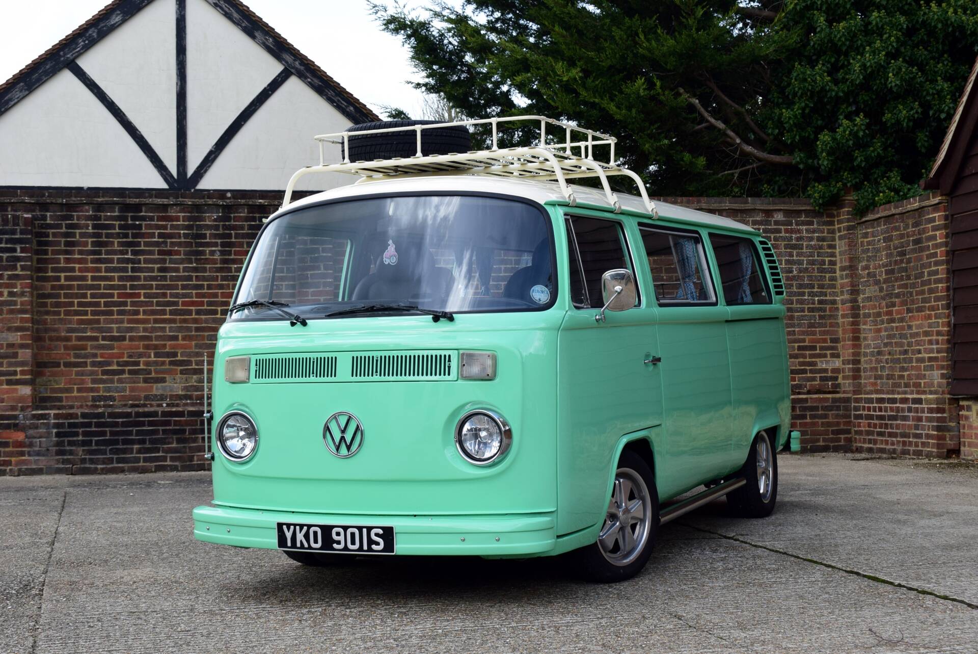 This classic 1978 manufactured Volkswagen T2 Camper Van is finished in Peppermint Green with a contrasting ivory roof and is fitted with 15" Fuchs style Porsche alloy wheels on lowered suspension, it comes with a large, as new, framed tent extension for extra sleeping arrangements and covered entertainment area (would easily accommodate 4/6 people). It has had only two owners since 2009, both Volkswagen enthusiasts, the first of whom set about a complete restoration after purchasing the car, which had been stolen and recovered and consequently was registered as a Cat D total loss, which is purely considered not to be economically viable to repair even though there was no damage! During the rebuild, the 2.0 litre engine was overhauled along with many other modification and upgrades in order to make the Camper more up to date for today's roads along with a bare metal body refurbishment in its Volkswagen classic colour scheme. It is fitted with black leather front seats, a new rock and roll bed, removeable table and a quirky vespa seat in which the stereo and sub- woofer is fitted, wooden sports steering wheel, curtains all round, side chrome sill bars and front cage roof rack to house your luggage, spare wheel and fitted tent etc. This vehicle features on the front cover of the February 2015 VW Vibe magazine with a four page write up. There has been too much work carried out on the vehicle to list here and would have cost far more than the asking price to achieve such a great Camper van as this. It is registered as a historic vehicle, so no road tax or MoT needed and it is ULEZ compliant. This surely is one of the most reasonably priced classic Camper Vans available and in lovely condition. Consigned by James Good