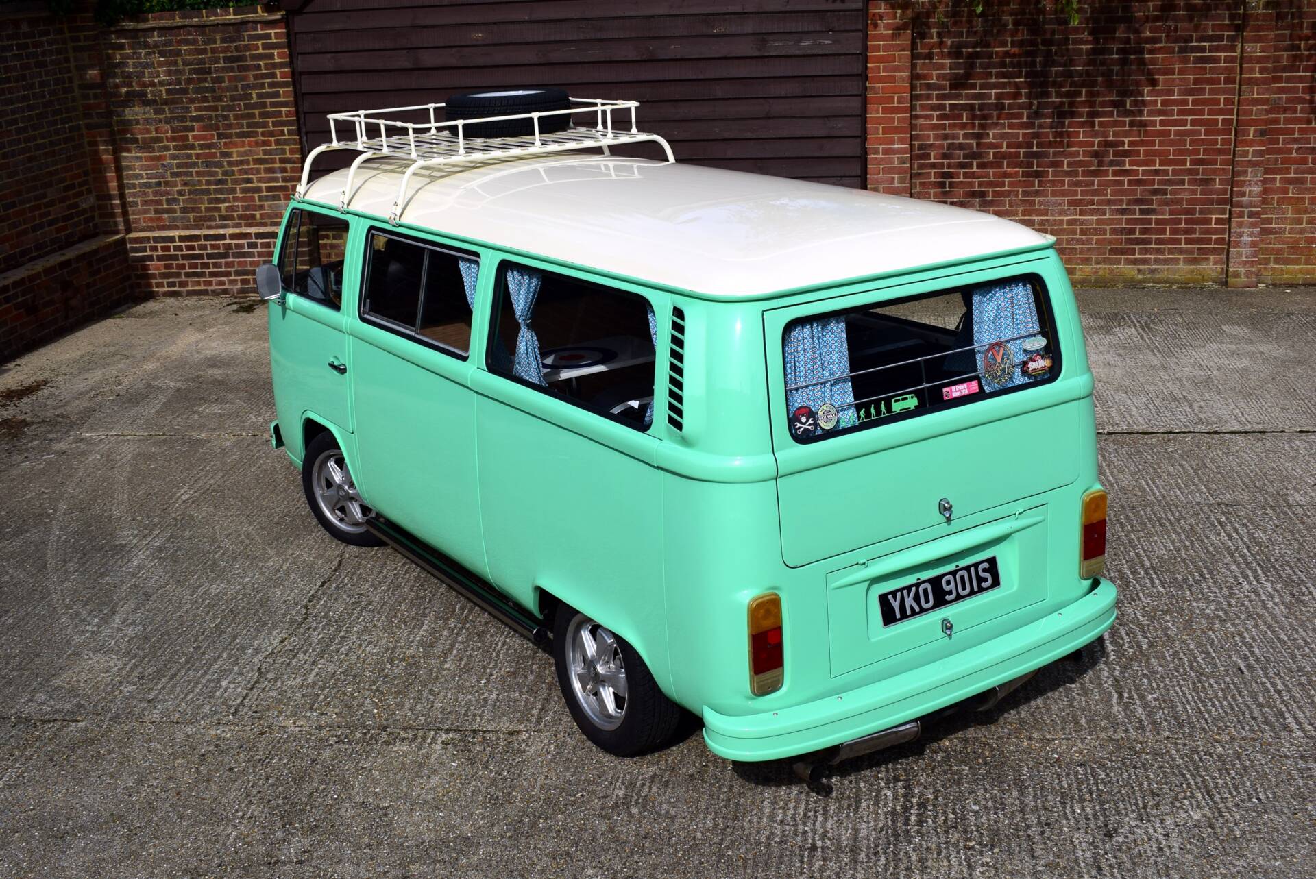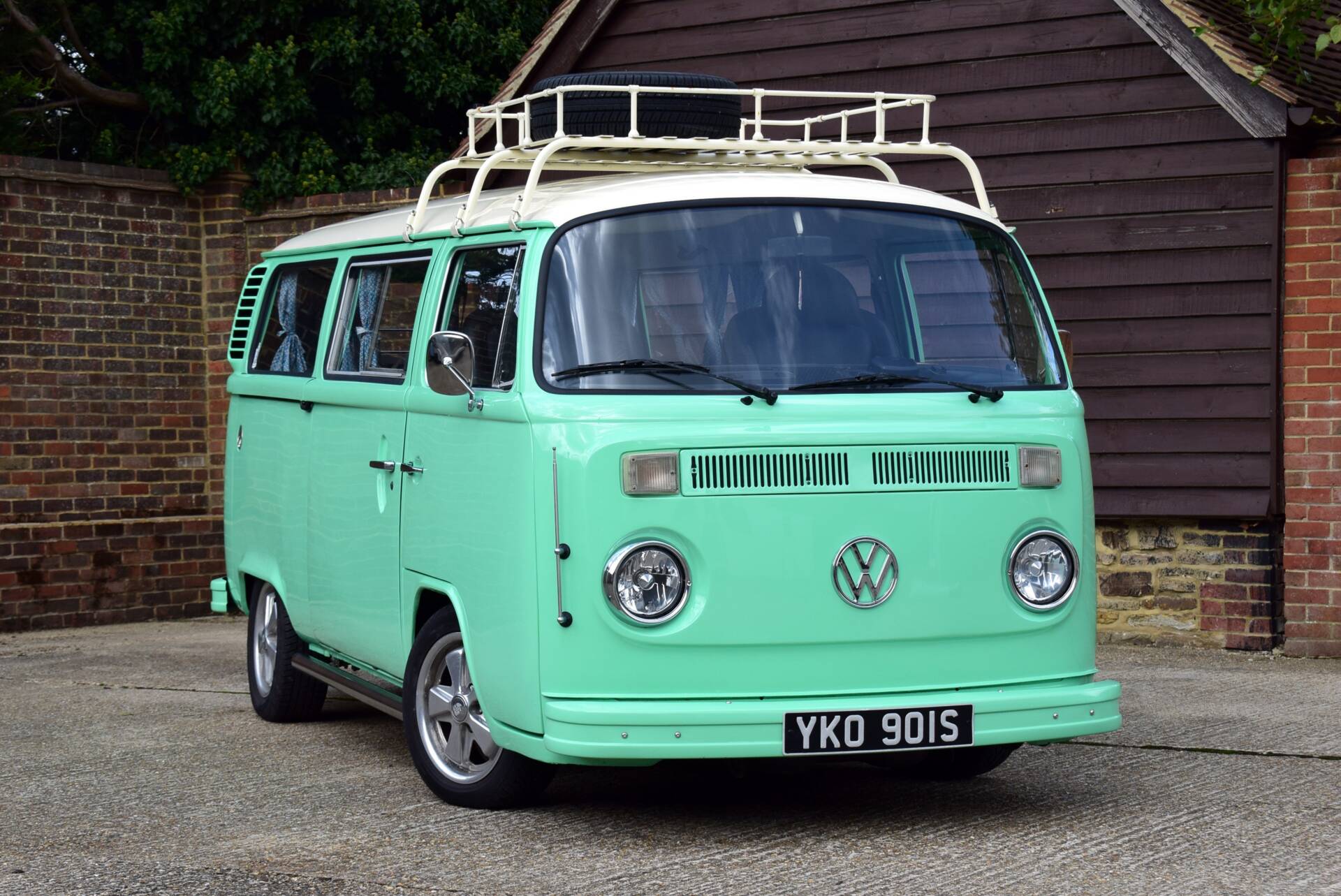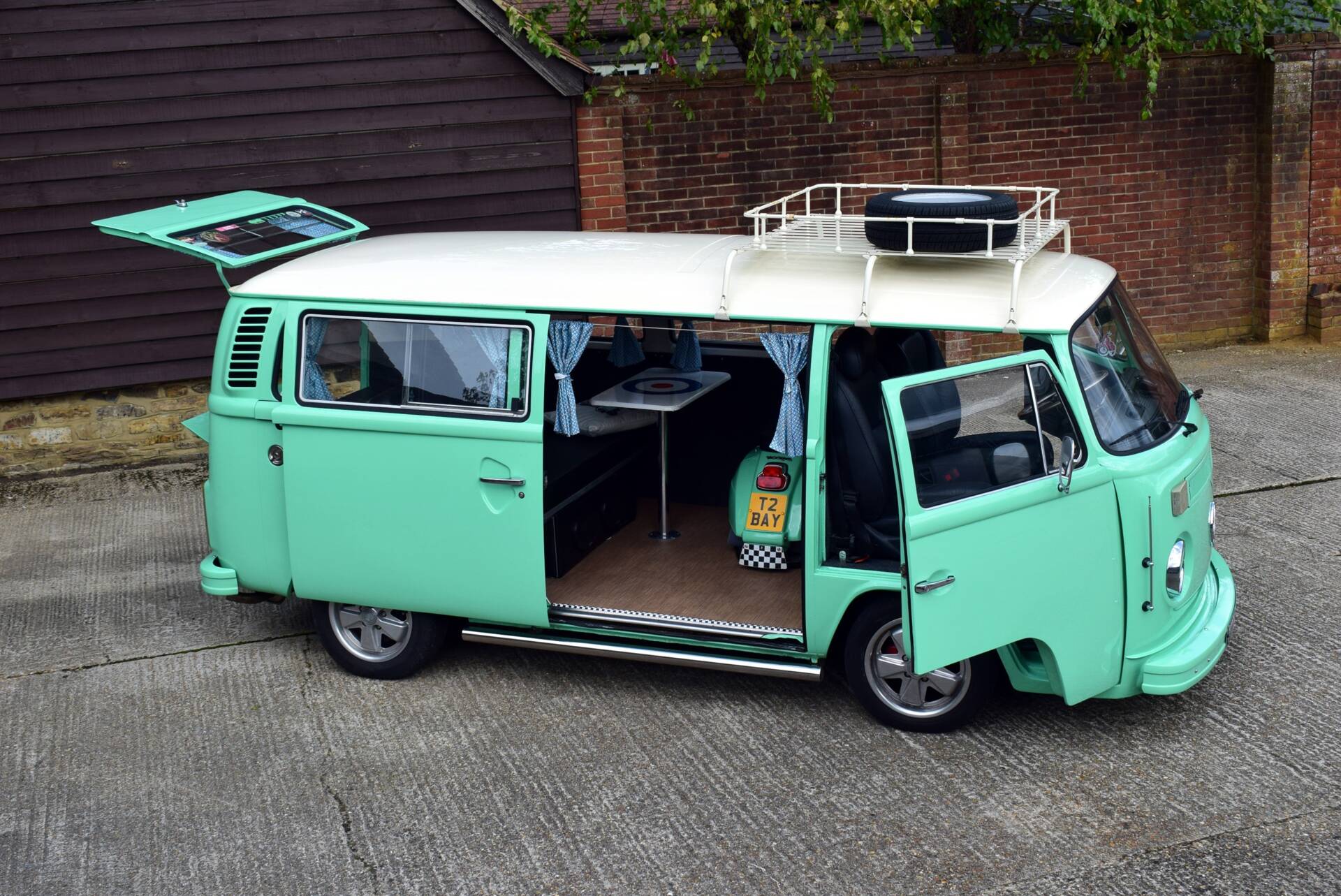 This classic 1978 manufactured Volkswagen T2 Camper Van is finished in Peppermint Green with a contrasting ivory roof and is fitted with 15" Fuchs style Porsche alloy wheels on lowered suspension, it comes with a large, as new, framed tent extension for extra sleeping arrangements and covered entertainment area (would easily accommodate 4/6 people). It has had only two owners since 2009, both Volkswagen enthusiasts, the first of whom set about a complete restoration after purchasing the car, which had been stolen and recovered and consequently was registered as a Cat D total loss, which is purely considered not to be economically viable to repair even though there was no damage! During the rebuild, the 2.0 litre engine was overhauled along with many other modification and upgrades in order to make the Camper more up to date for today's roads along with a bare metal body refurbishment in its Volkswagen classic colour scheme. It is fitted with black leather front seats, a new rock and roll bed, removeable table and a quirky vespa seat in which the stereo and sub- woofer is fitted, wooden sports steering wheel, curtains all round, side chrome sill bars and front cage roof rack to house your luggage, spare wheel and fitted tent etc. This vehicle features on the front cover of the February 2015 VW Vibe magazine with a four page write up. There has been too much work carried out on the vehicle to list here and would have cost far more than the asking price to achieve such a great Camper van as this. It is registered as a historic vehicle, so no road tax or MoT needed and it is ULEZ compliant. This surely is one of the most reasonably priced classic Camper Vans available and in lovely condition. Consigned by James Good