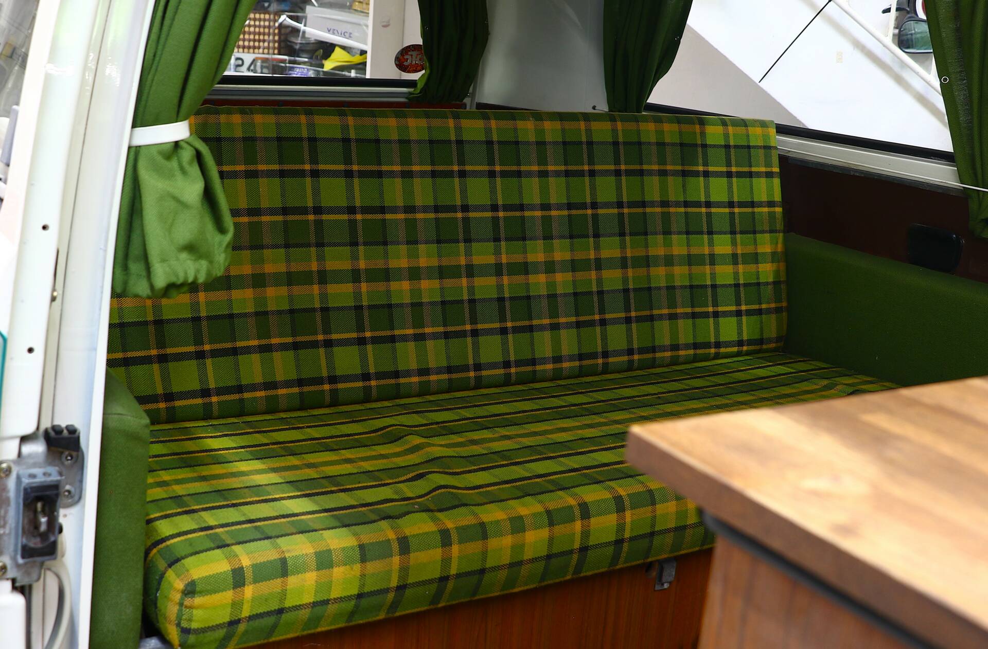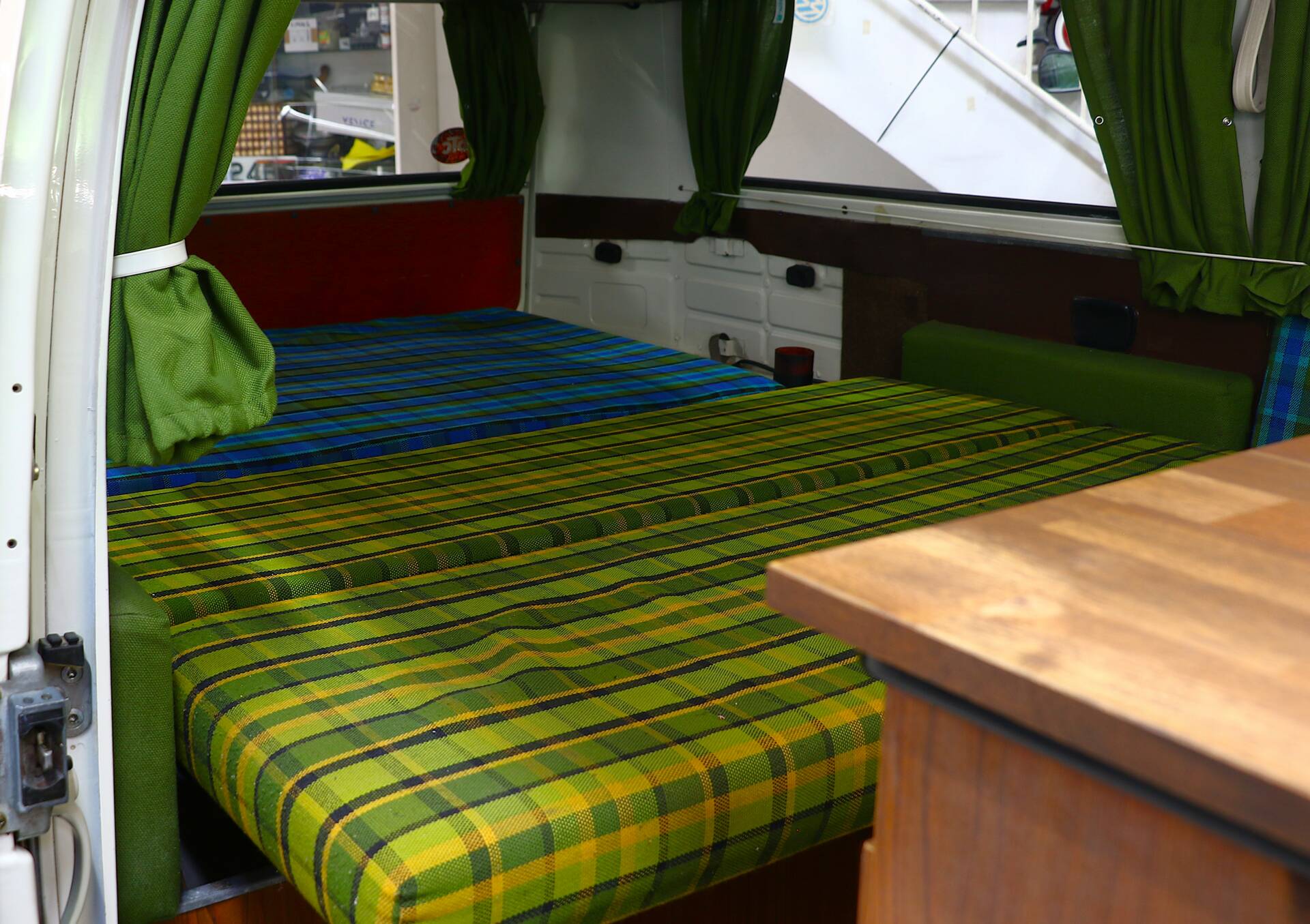 Im Küchenteil an der Schiebetür befindet sich ein Kühlschrank. Im Schrank hinter dem Fahrer ist ein ausklappbares, zweiflammiges Gaskochfeld, darunter ist ein Staufach. Unter der seitlichen Sitzbank befinden sich weitere Staukästen. Im Durchgang zum Fahrer-/Beifahrersitz befindet sich eine Gasheizung. Die große Sitzbank geht über die komplette Fahrzeuginnenbreite und kann mit einem Handgriff zur einer großzügigen und bequemen Liegefläche für zwei Personen umgebaut werden. Unter der Sitzbank sind weitere Staumöglichkeiten. Also ausreichend Platz für Camping- und Sportequipment. Das Aufstelldach bietet auch für große Menschen Stehhöhe. Die gesamte Innenausstattung ist gepflegt und appetitlich.
