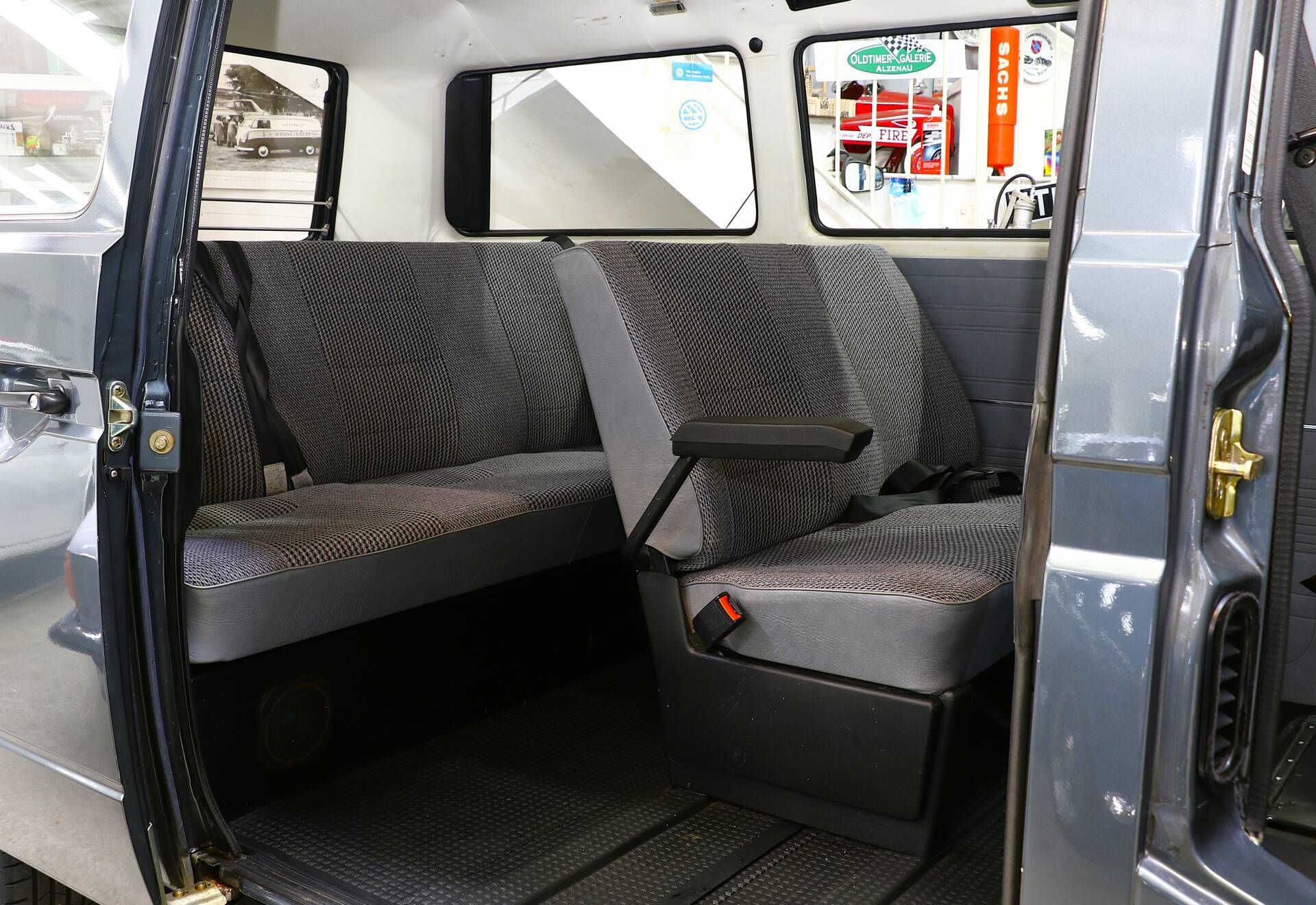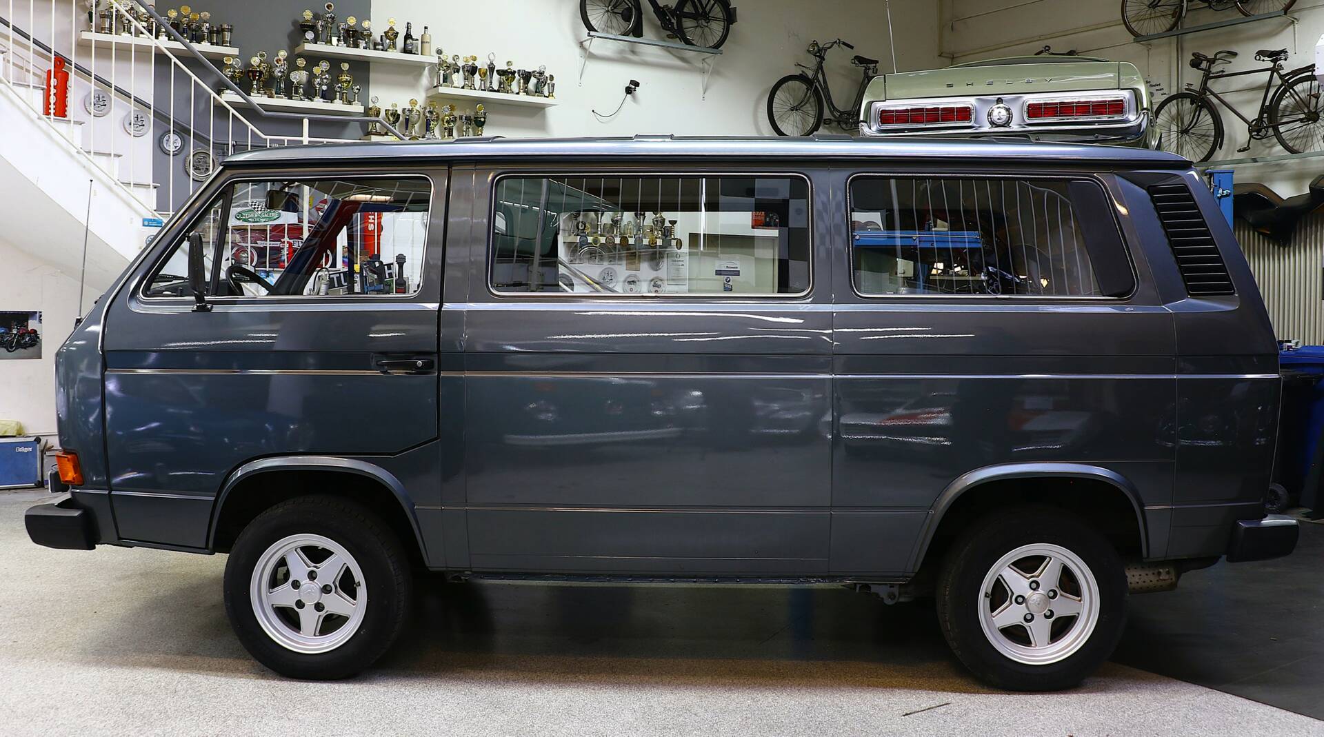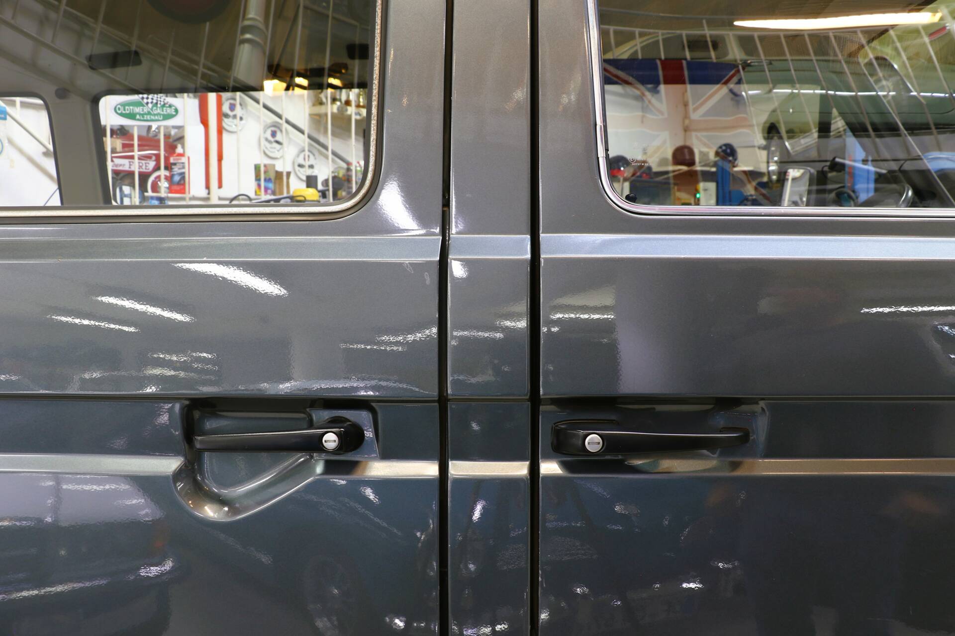 Die Karosserie unseres T3 ist der Historie entsprechend. Die Lackierung in Wolframgrau-Metallic ist weitgehend im Originallack und auch die beim T3 kritischen Karrosserienähte um die hinteren Radläufe befinden sich in guter Verfassung. Die Spaltmaße rundum sind einwandfrei und alle Türen inklusive der Schiebetüre öffnen und schließen perfekt.