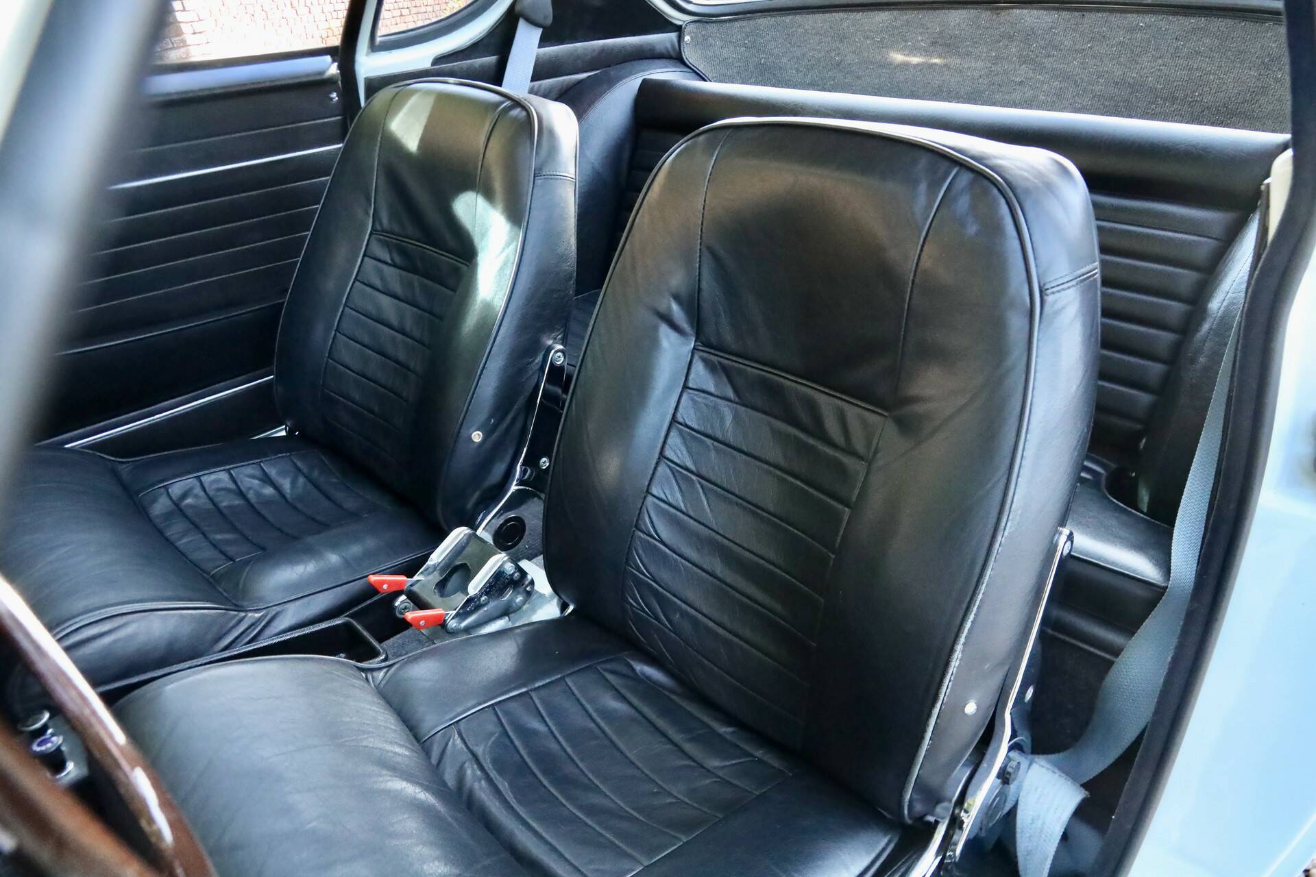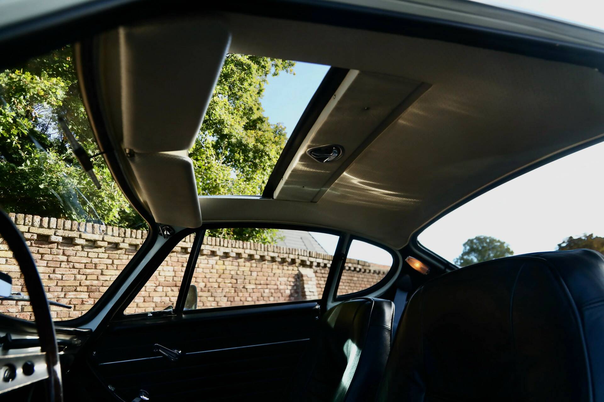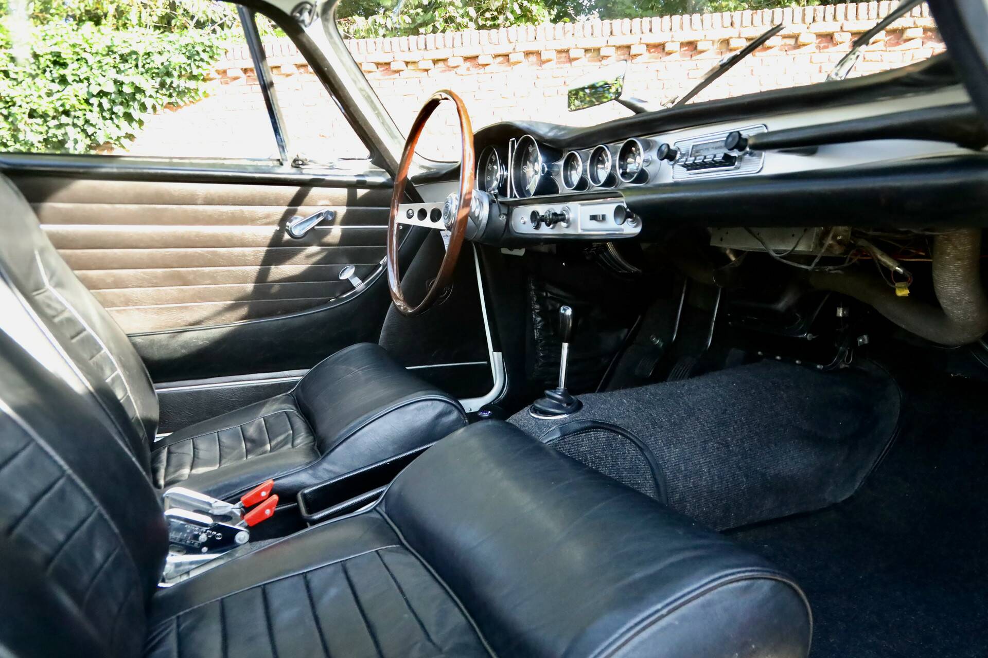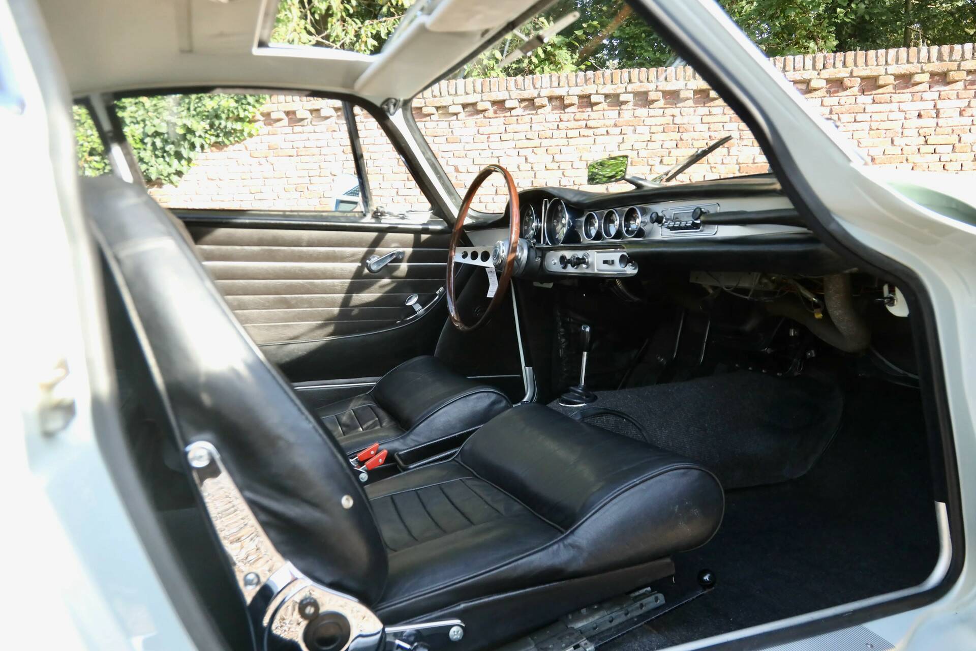 Der Lack, in der korrekten Originalfarbe ausgeführt, befindet sich in hervorragendem Zustand und überzeugt mit tiefem Glanz ohne nennenswerte Makel. Die Chromteile wie die Stoßstangen präsentieren sich wunderschön – glücklicherweise nicht „überrestauriert“, wie es leider häufig vorkommt. Im Interieur begeistern feine Details, elegante Teppiche und straffes Leder. Das Holzlenkrad rundet das Bild stilvoll ab.