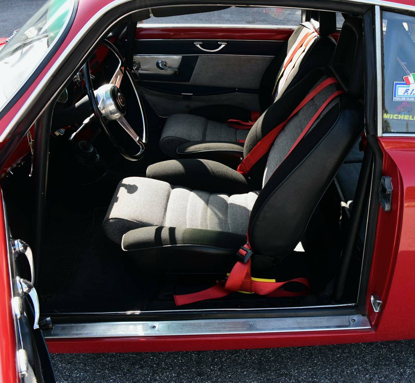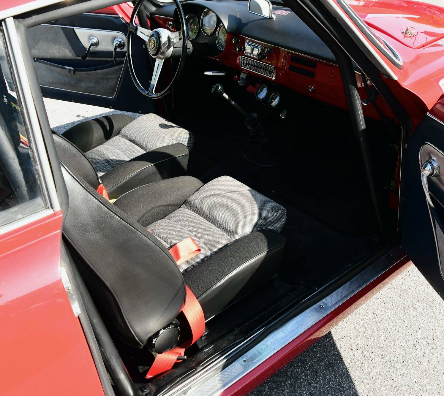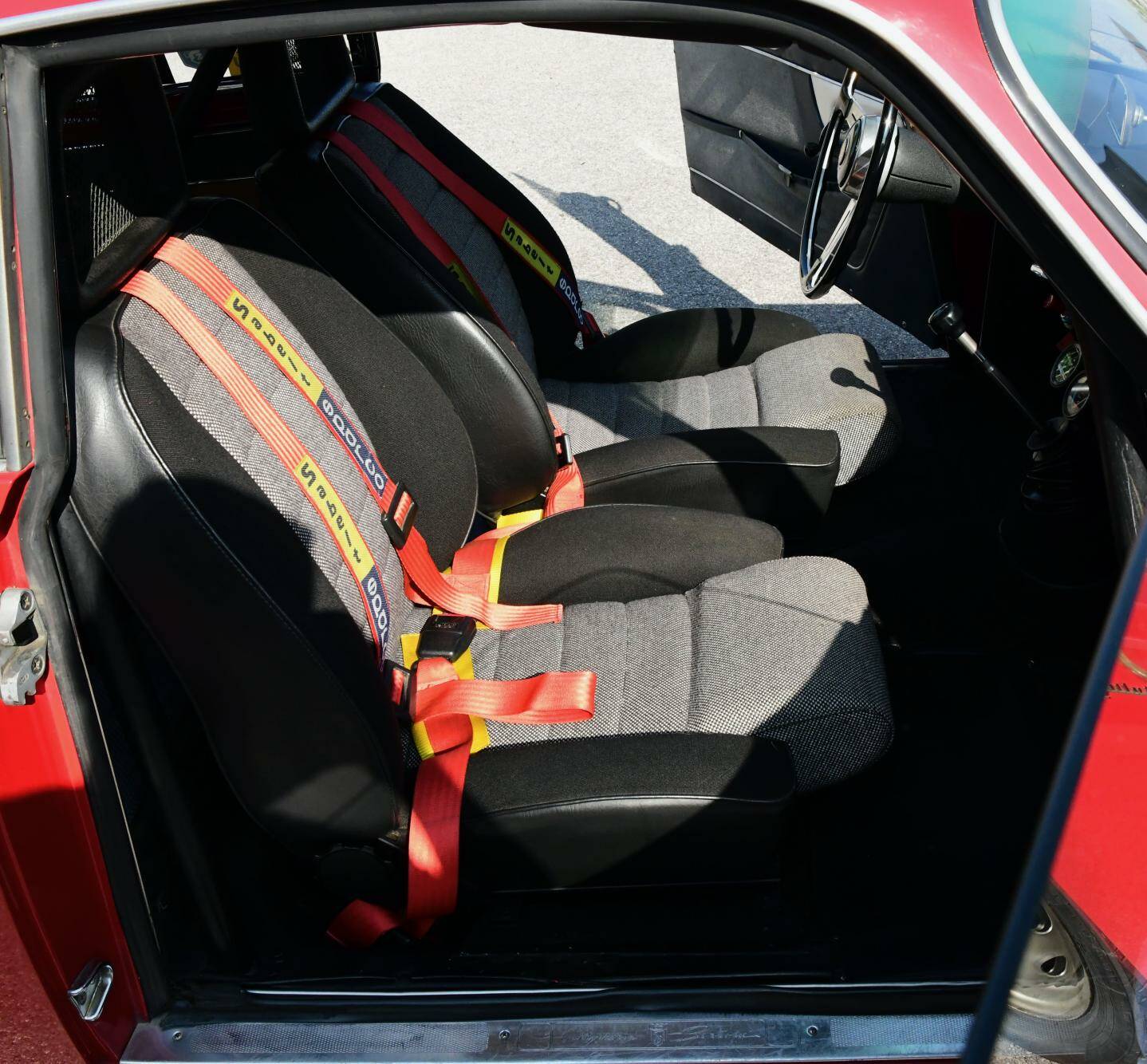 This Alfa Romeo presents itself in a gleaming Rosso Corsa exterior and two-tone black and grey fabric interior; inside you will also find a roll cage, fire extinguisher, extra gauges and Sabelt 4-point seatbelts. The car is, simply put, ready to be put on the road and track. Bosch extra fog lights have been fitted to the front.