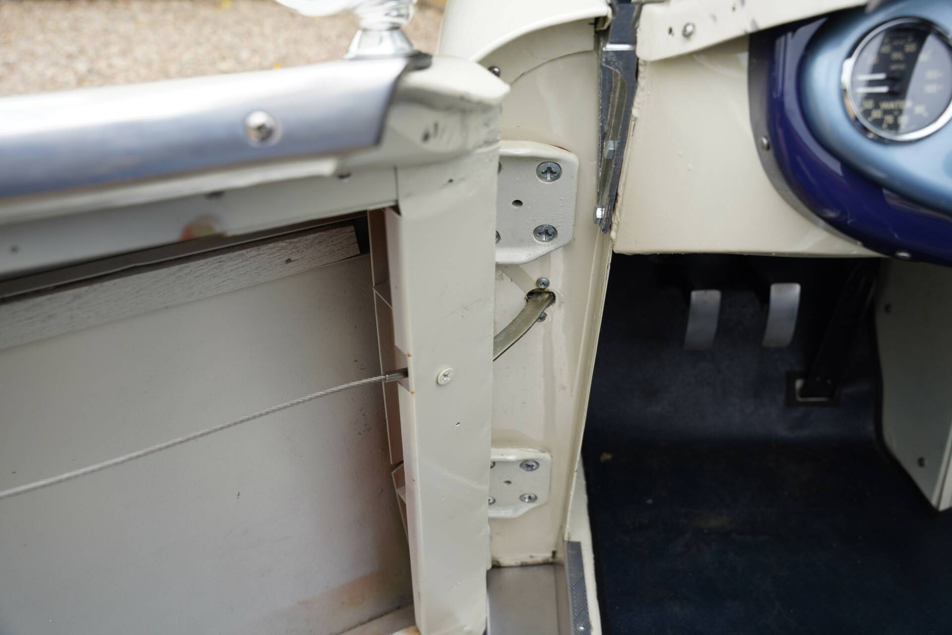 The restoration was carried out by a Healey specialist, with a focus on period-correct components like the rare Alfin aluminum brake drums, which were fitted back in the day specifically for racing. The rest of the braking system was also lightened, as every pound made a difference on the track.