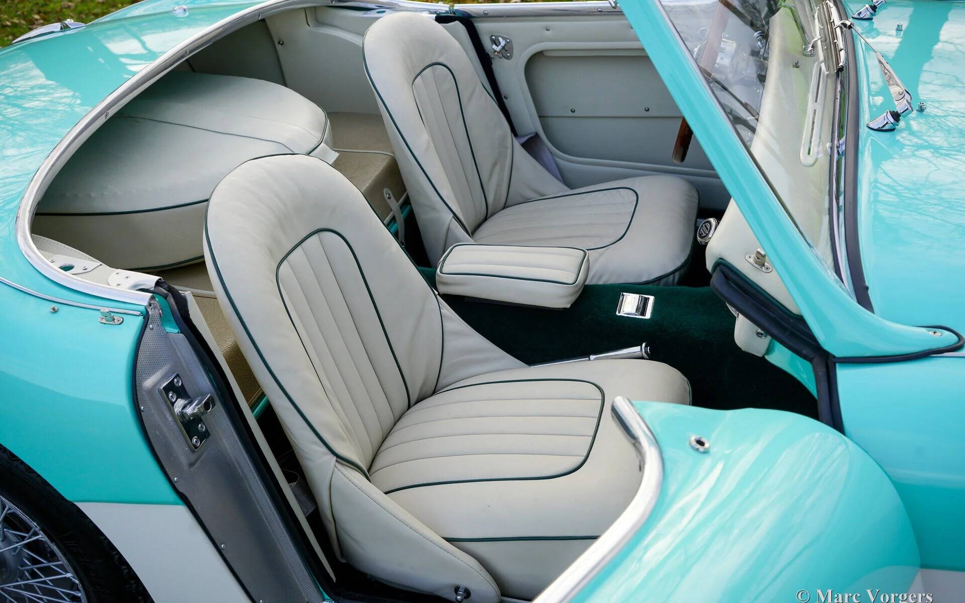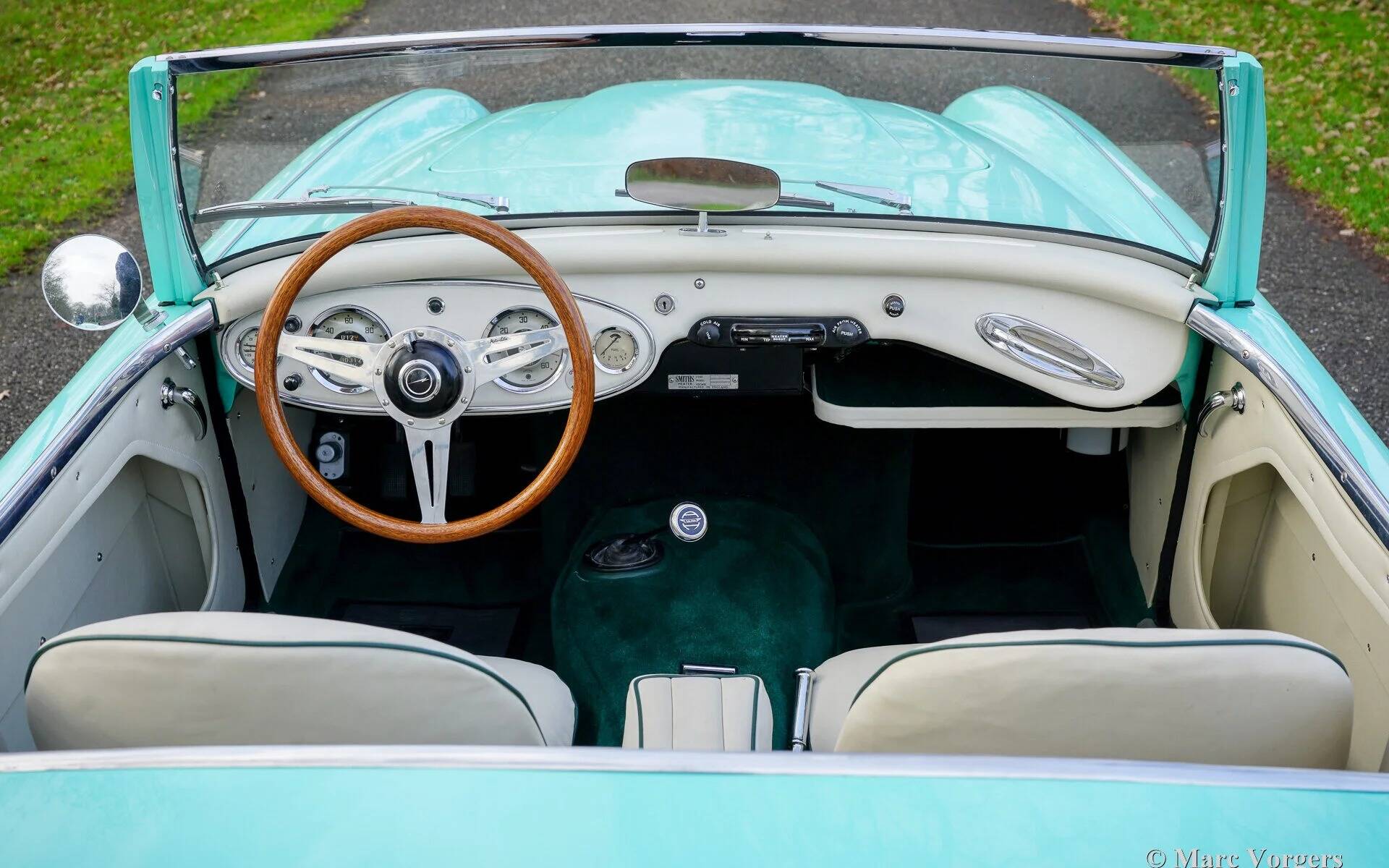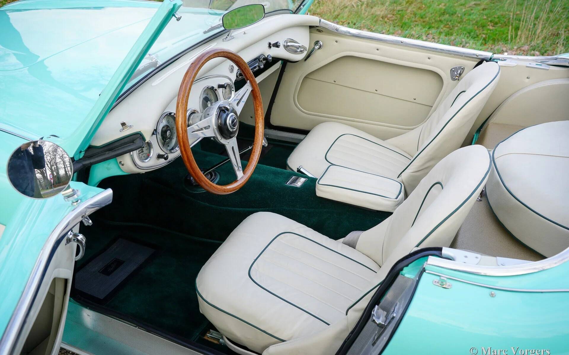 This beautiful "Big Healey" is finished in Florida Green over cream white and features a light beige (Magnolia) leather interior with teal piping and teal carpet. Only 355 examples of the Austin Healey MK II BN7 were built between April 1961 and June 1962, making it the rarest Healey 3000 production model. This stunning example was imported from Texas, USA, to the Netherlands in 2020 and subsequently extensively restored to original factory specifications. The work was completed in 2023.