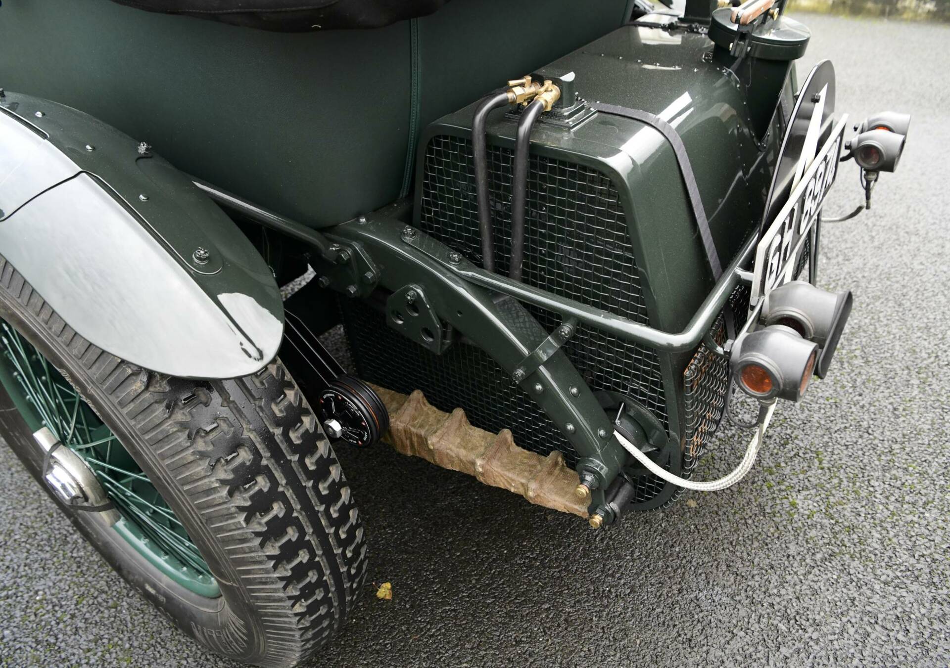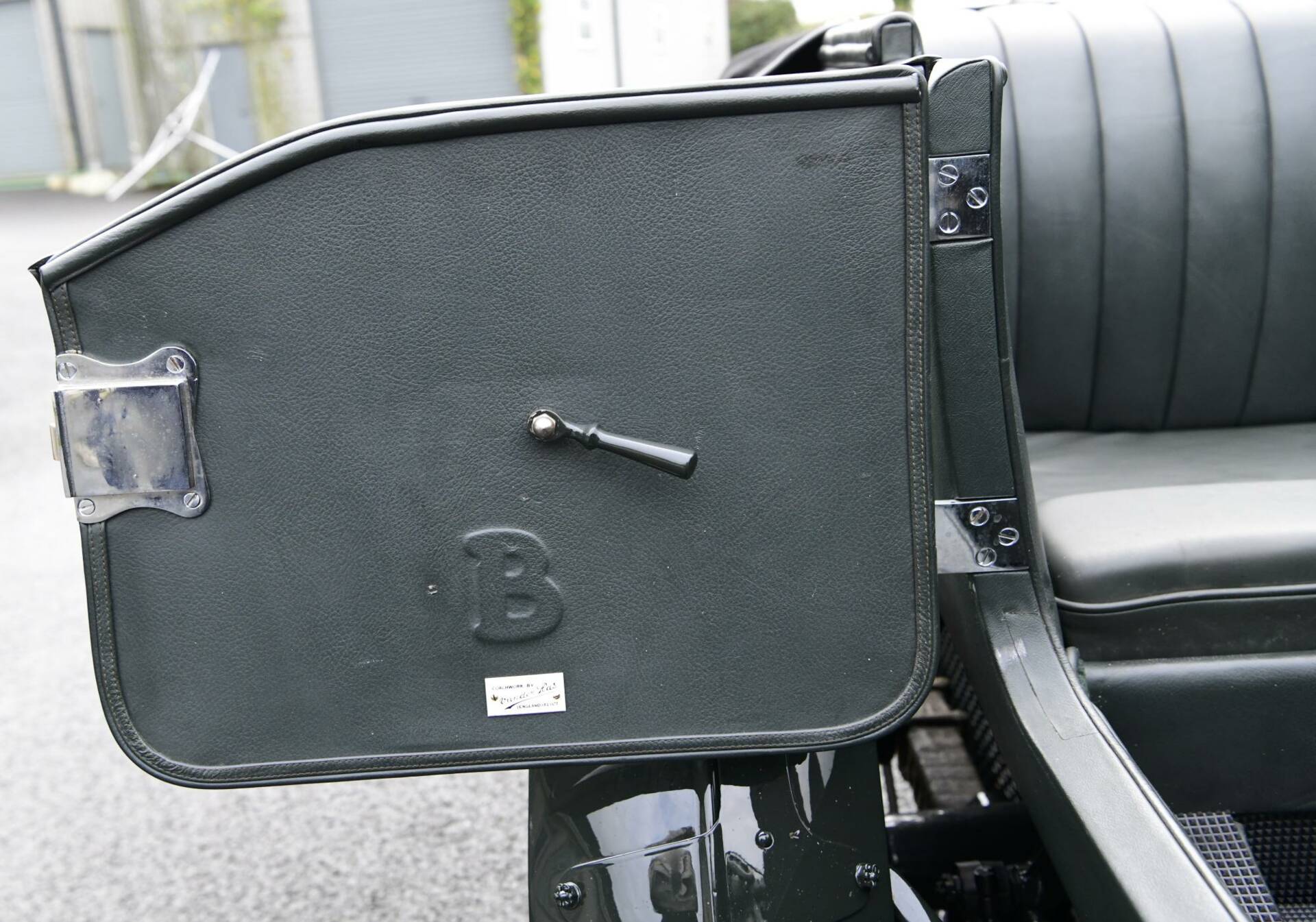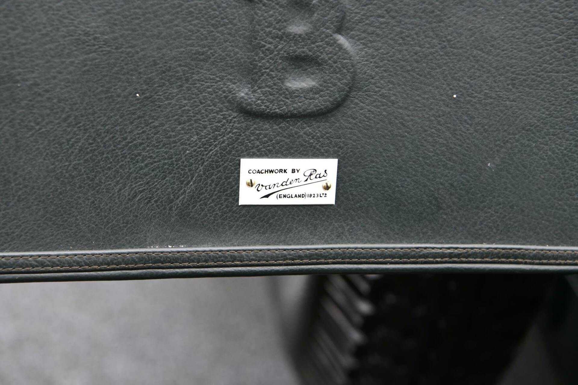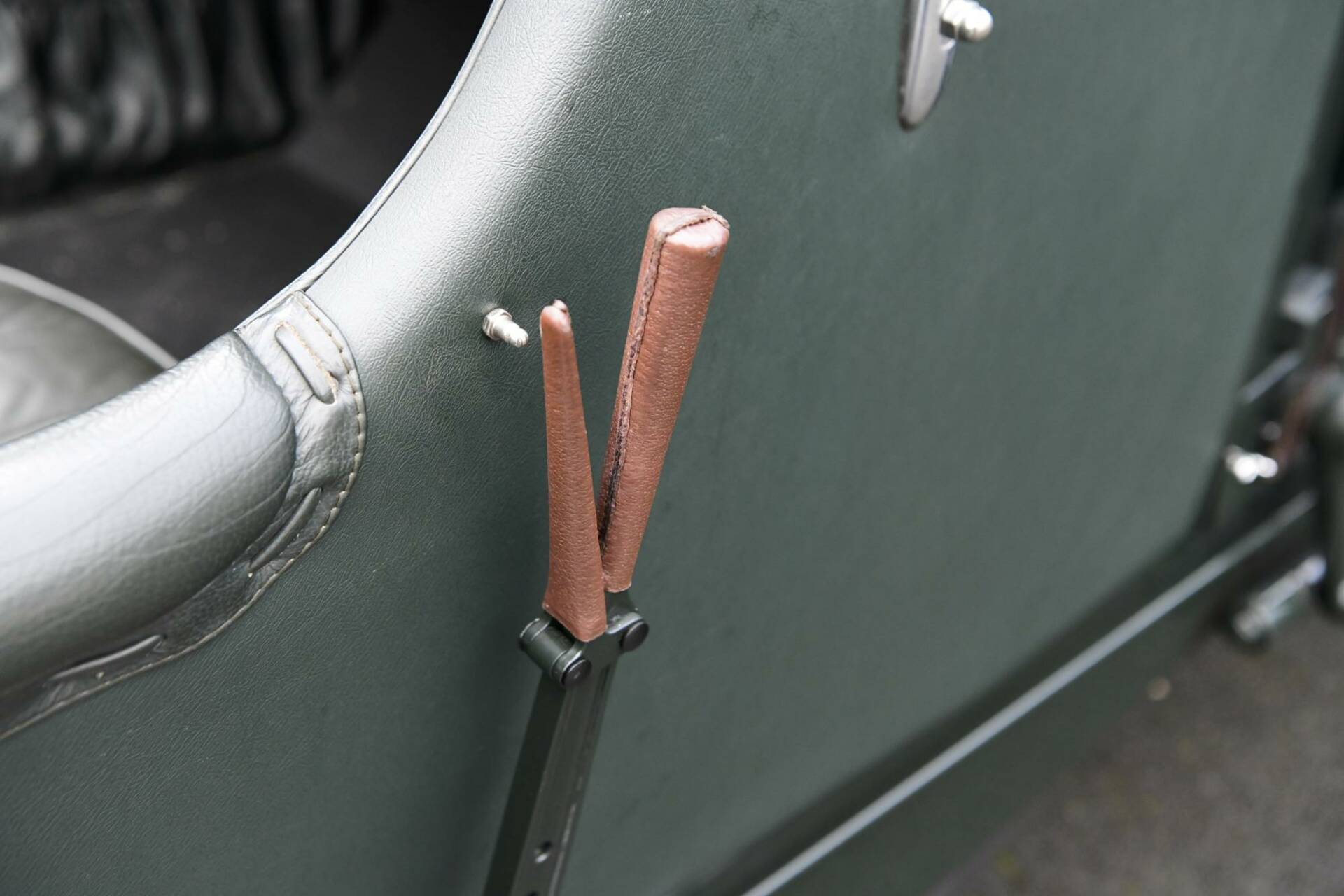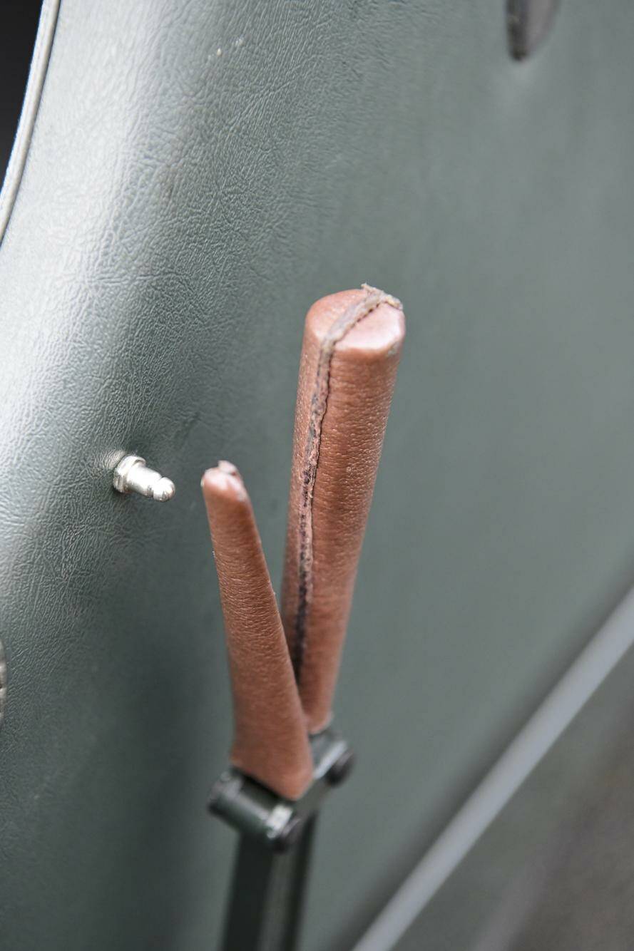 Lovely Marechal lamps are fitted up front & the leaf springs are painstakingly wrapped in cord. Bucket style light weight seats are installed up front upholstered in new green leather.