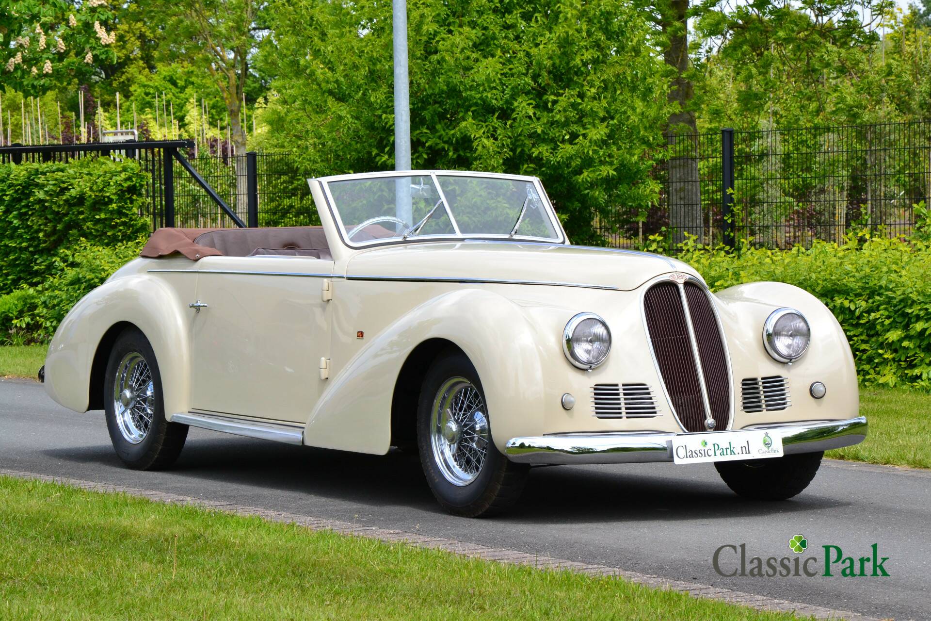 This Delahaye 135 MS Worblaufen convertible has an exceptional appearance. It is not only the sporty body lines and sloping grille, but also the art deco shapes, the color choice of the paint, the interior, the remarkable dashboard with the transparent three-spoke steering wheel and the transparently designed buttons that draws all the attention. In total, only six copies of the Delahaye 135 MS convertible were made by Worblaufen. The nose of this car has a design that does not appear on any of the other five Worblaufen convertibles built and that gives the car an extremely balanced appearance. This example is considered the most beautiful of the six. The 135 MS has a side-hinged bonnet, under which a 3557 cc inline 6-cylinder engine with overhead camshaft and three carburettors is installed. The engine is connected to a Cotal gearbox and delivers 132 hp of power.