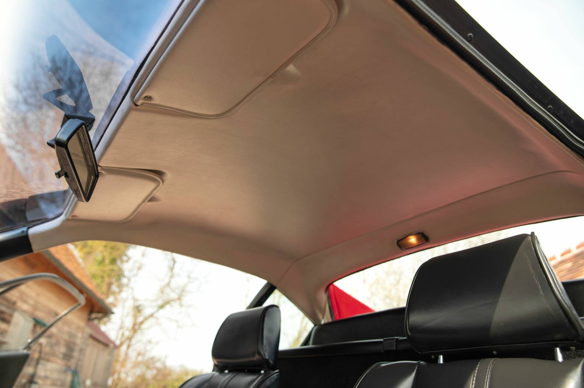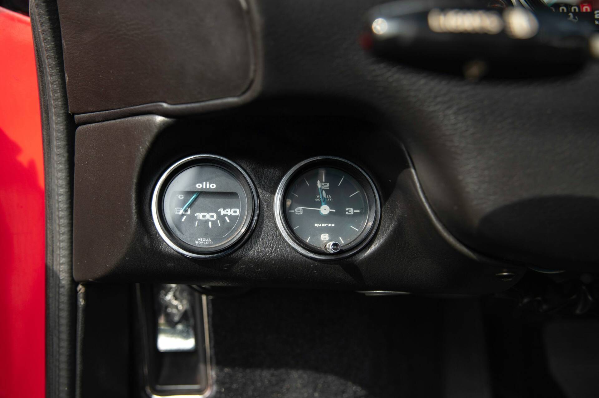 L’habitacle, habillé de cuir noir, se présente dans un très bel état de conservation. Les sièges présentent une patine homogène sans altération majeure. La planche de bord et les différents éléments de sellerie sont bien conservés et témoignent d’un entretien suivi. On retrouve un volant trois branches au design emblématique et un combiné d’instrumentation complet signé Veglia Borletti. Le ciel de toit est en bon état.