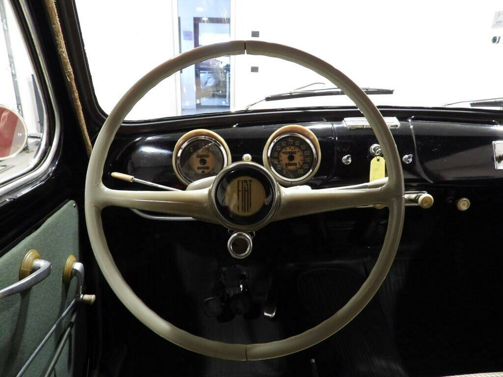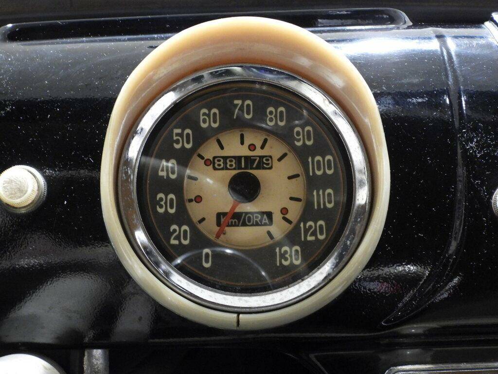 Sedili in tessuto a quadri e vipla verde, Pannelli in panno verde, Cambio al volante, Autoradio Telefunken dell’epoca, Cerchi in ferro con calotta cromata e pneumatici 5.20-14 con fascia bianca, Specchio esterno lato guida cromato