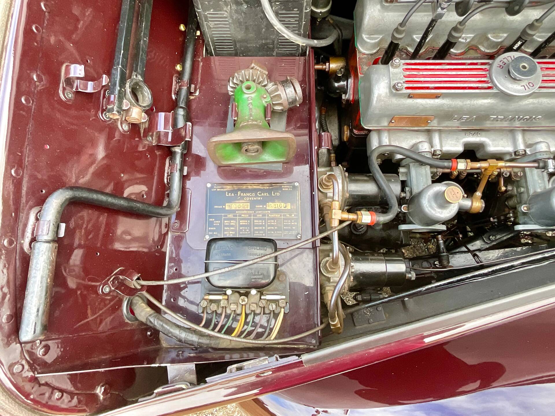 Finished in its original stunning colour scheme of Dark Red with Red Leather Interior. This Lea Francis was restored some years ago, and has also been converted to run on unleaded petrol for modern convenience. At the time of restoration, a new Hood, Side Windows and full length Tonneau Cover were supplied. Other features also include period correct Starting Handle and Jack, Folding Windscreen, Spare Wheel and more.
