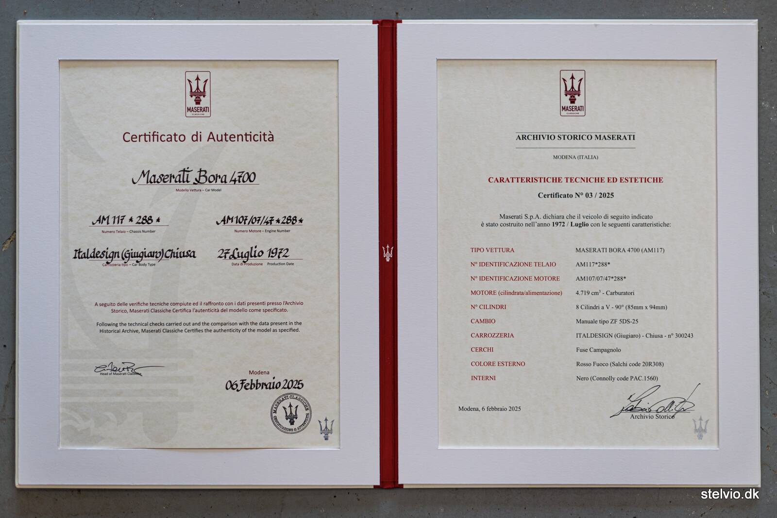 This example is no. 288 and thus the second to last 4.7 produced. This is a real time warp with only 10,600 km originally driven. The car appears completely original and unspoiled, also documented by the “Certificato di Autenticità” issued by Maserati Classiche. In connection with the certification, we visited the factory in Modena and were just a little bit proud when they let us understand that this is probably the finest Bora in existence. They just wish it was part of their own collection. A car is only original once…..