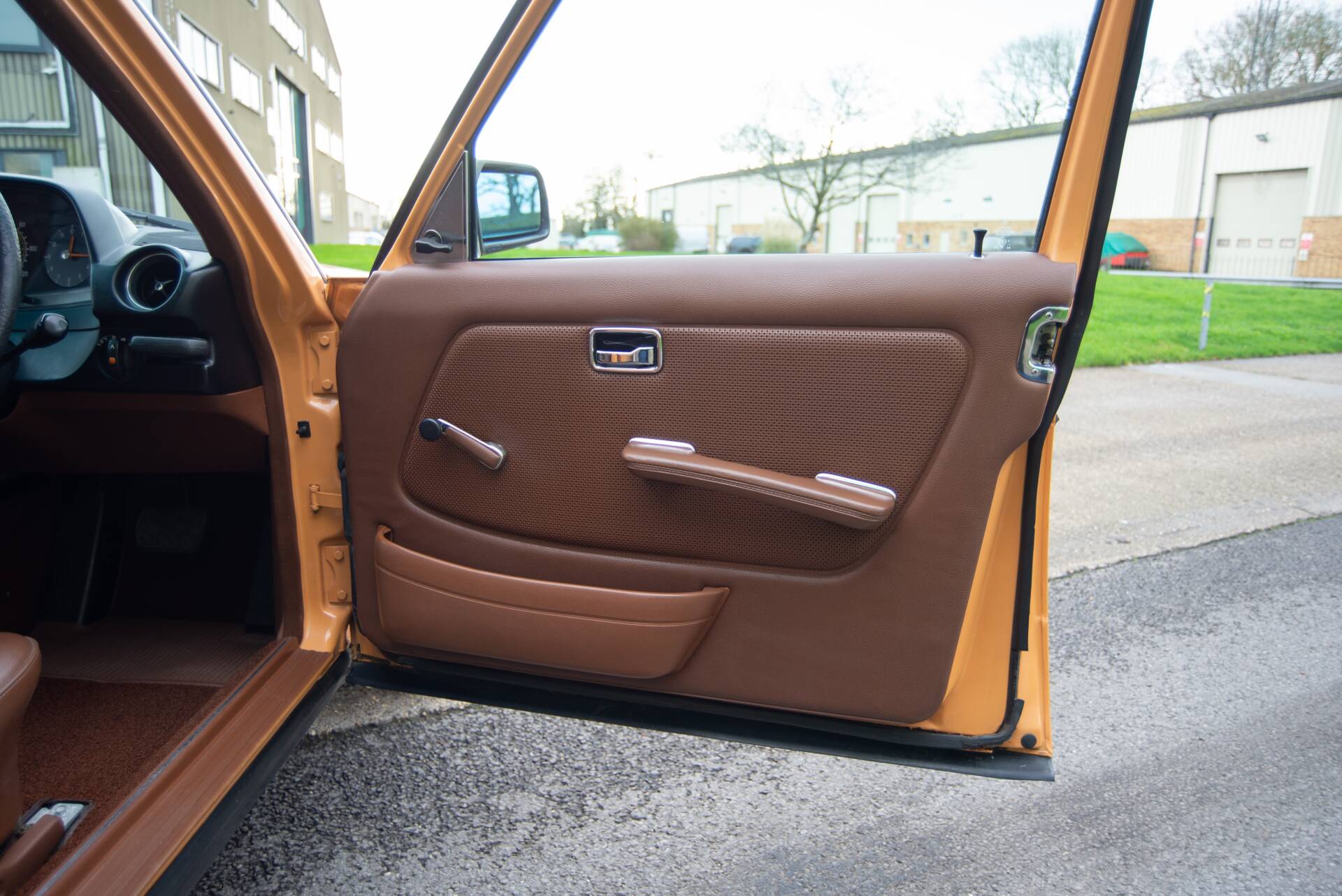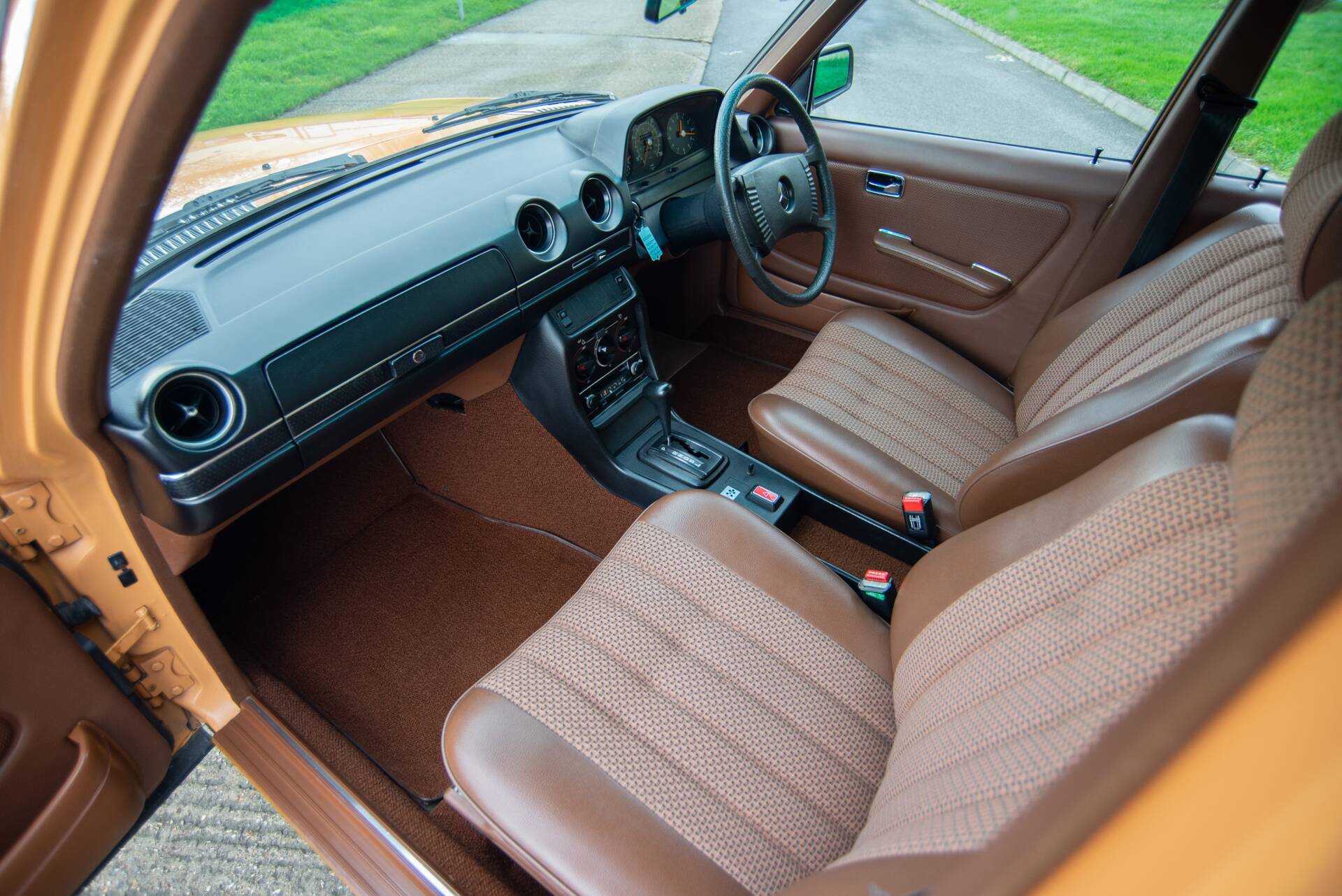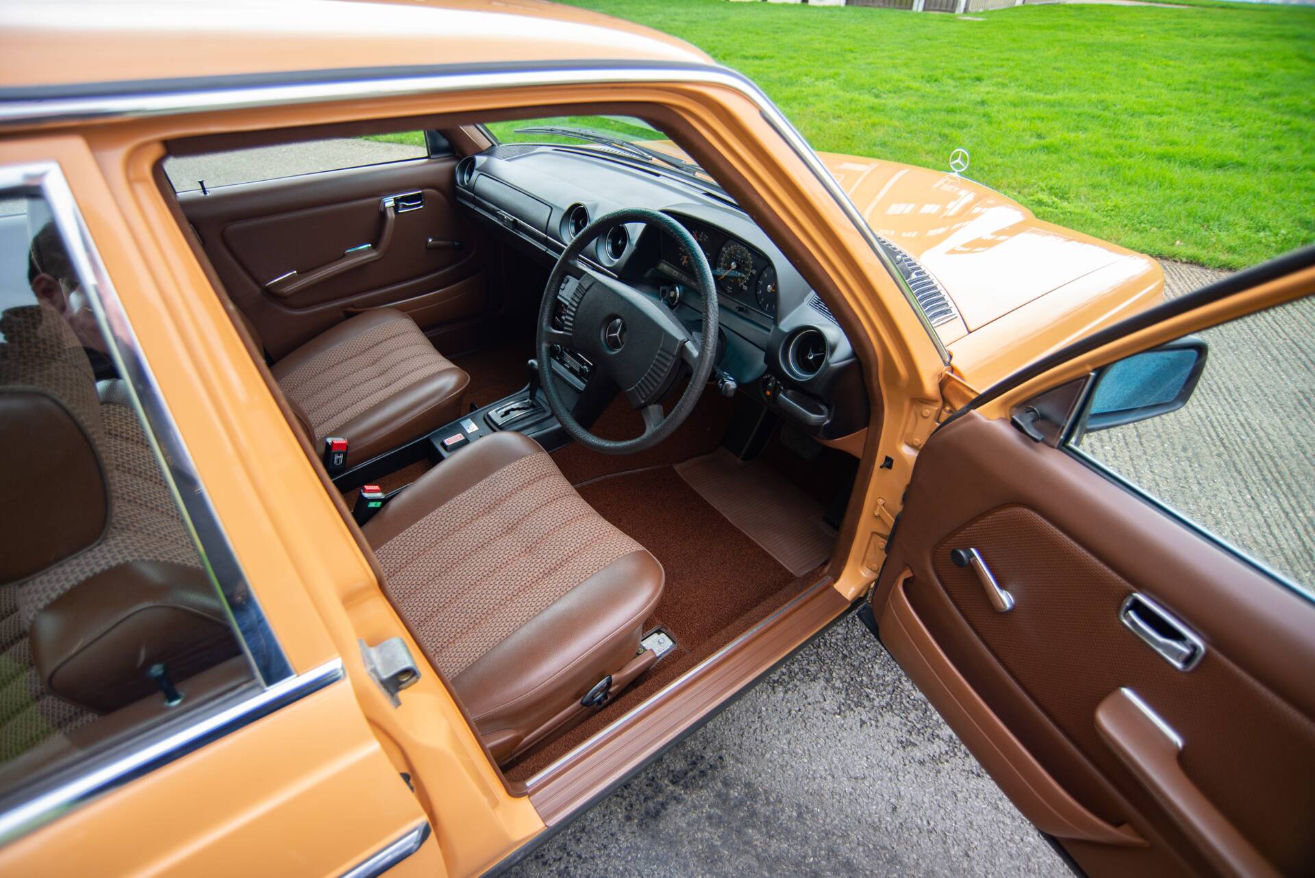 The colour is of course the first thing that grabs you on this car. Cayenne Orange is not commonly seen but it is a wonderfully period colour that suits this late 70s W123 so well. Particularly as it is combined with a reddish-brown cloth and vinyl trim.