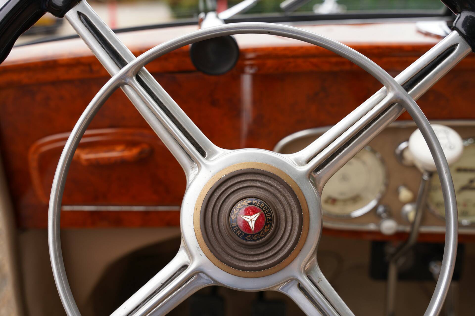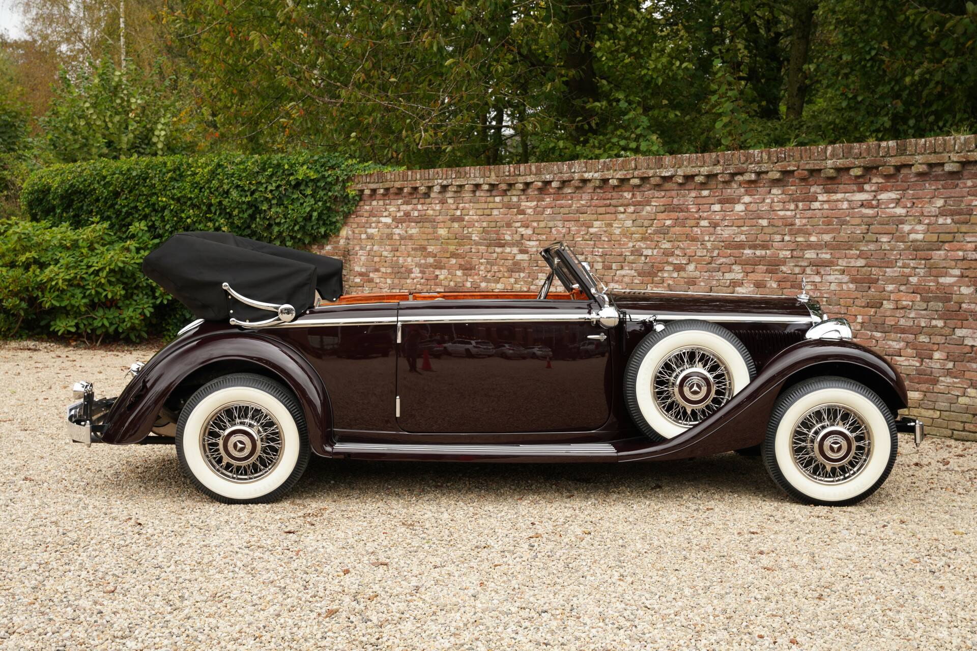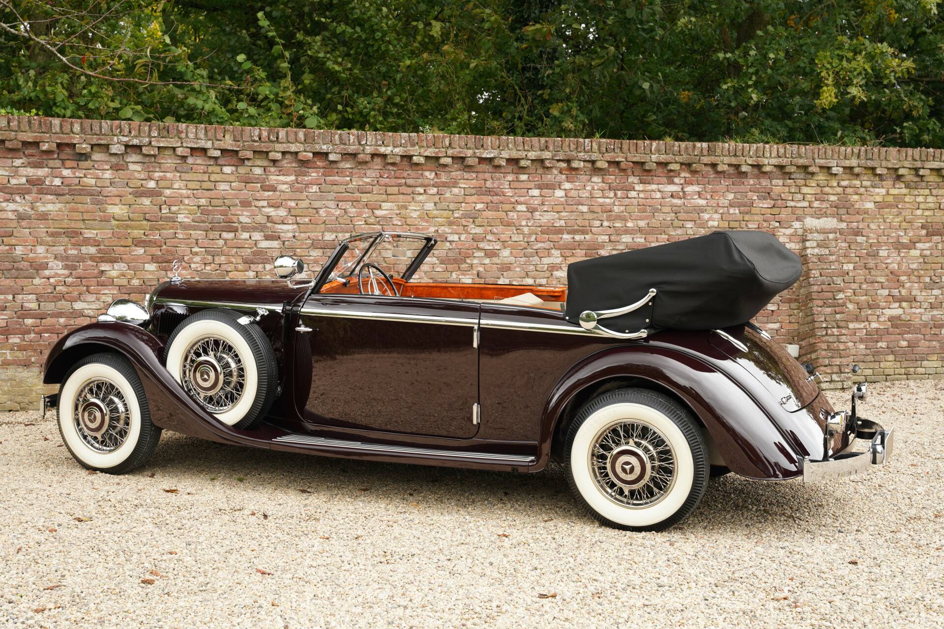 No detail was overlooked in restoring this Mercedes-Benz to its former glory. The extensive restoration and mechanical overhaul, spanning several years, included a complete renewal of the woodwork. The engine has been fully rebuilt, and the entire vehicle has been brought to fantastic condition. The restoration was executed by leading specialists, evident in the exceptional quality of workmanship. An extensive photo album documenting the restoration process is available, showcasing the meticulous care and attention lavished on this automobile. The car is now in absolute top condition and ready to dazzle at any concours event.