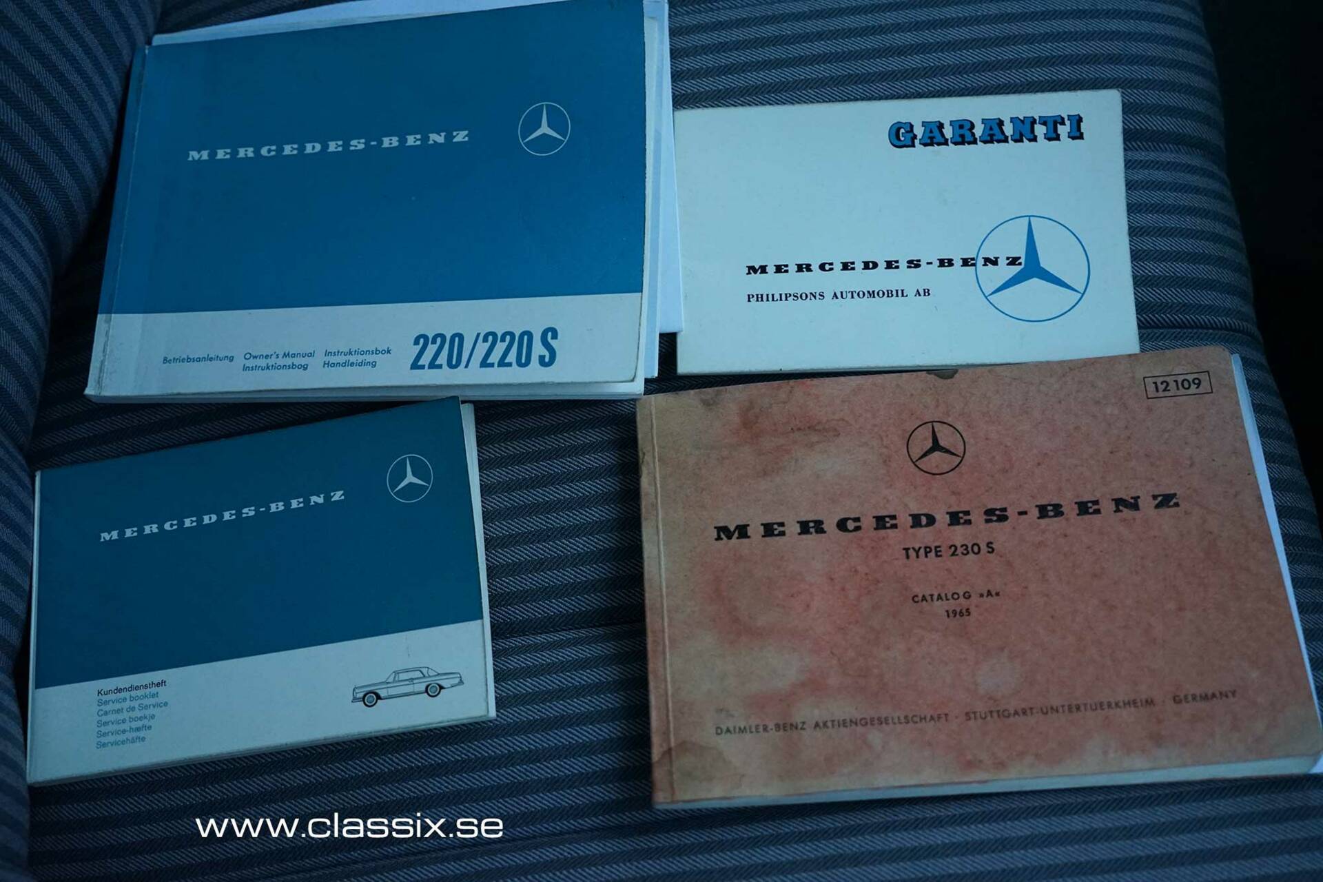 History: This Mercedes 220 Sb was sold new here in Sweden on the 30th of November 1965 to Bengt Gunnarsson (born 1907) It was then past on to his daughter that had the W111 until 1990 and the final owner had the car until 2025. This is a car that has been garage kept pretty much its entire life. And that is the reason for this truly exceptional condition. In 1992 the car received two new front wings and then a full professional repaint. It comes with a binder of invoices for parts and work carried out over the years. Also, many of the Swedish test certificates to verify the low km reading of the car. Original books and tools. Also a very nice original prospect from Mercedes.
