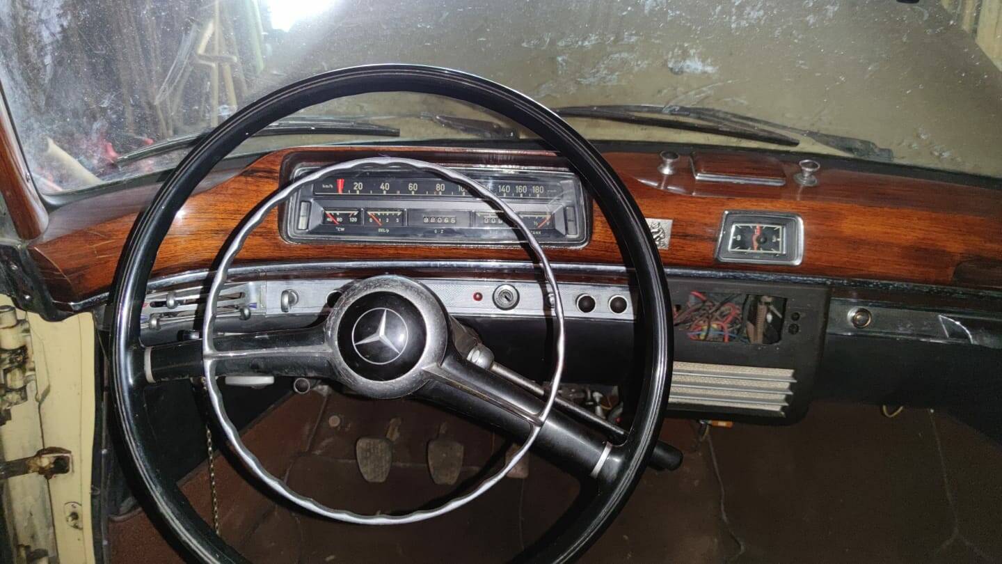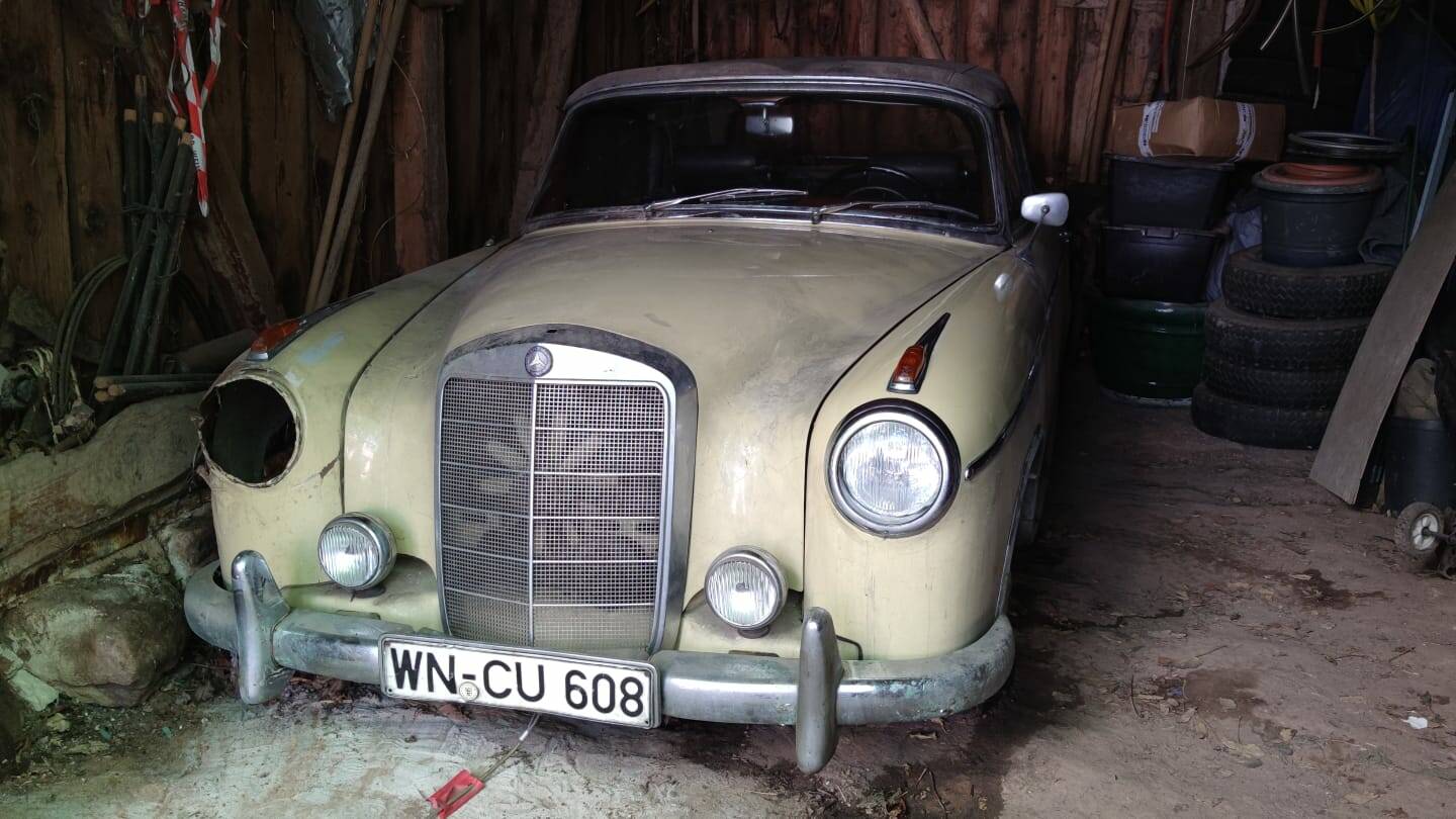 Das Fahrzeug "ruht" nun seit 1981. Der Rahmen ist gut konserviert und intakt. Bzgl. der Karosserie ist zu sagen, dass der rechte vordere Kotflügel einen leichten Unfallschaden aufweist (siehe Fotos) der gut repariert werden kann. Es gibt aber auch einen grundierten Ersatzkotflügel dazu. Der linke hintere Kotflügel wurde am Radlauf schon mal geschweißt, gespachtelt und ist teilweise abgeplatzt. Leder und Holz im Innenraum sind in einem guten Zustand. Der Motor hat nach einer Generalüberholung lediglich eine Laufstrecke von ca. 10 000 km gehabt und wurde mit Korrosionsschutzöl abgestellt. Dieser sollte nach der langen Standzeit auf jeden Fall mit Bedacht in Betrieb genommen werden. Getriebe und Differential waren beim Abstellen i.O.. Ergänzend ist zu sagen, dass es sich wahrscheinlich um das einzige 220S Cabriolet mit eingetragener Anhängerkupplung handelt (Sonderabnahme 1976, Anhängelast 1200Kg). Die Fotos zeigen das Fahrzeug ungewaschen und ungeschönt wie 1981 abgestellt, bzw. früher im Betrieb.