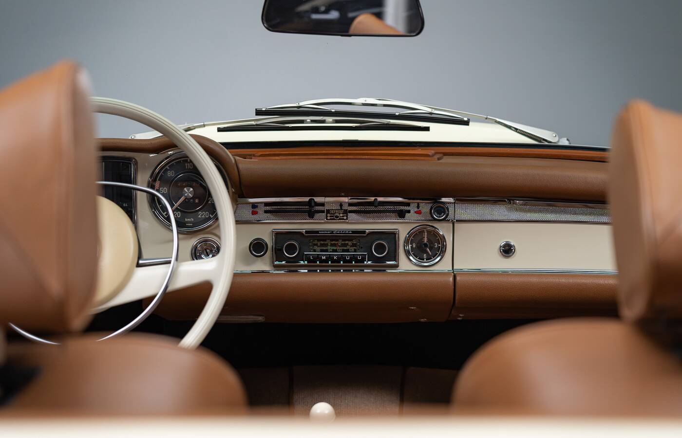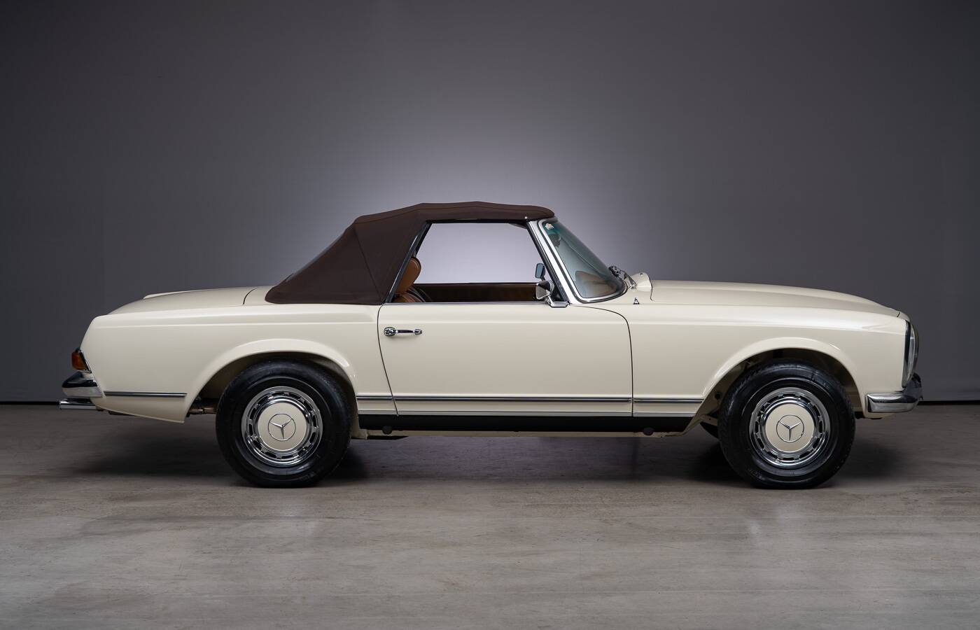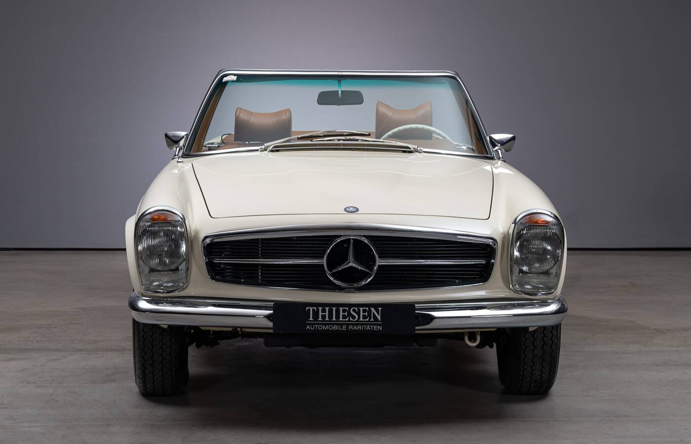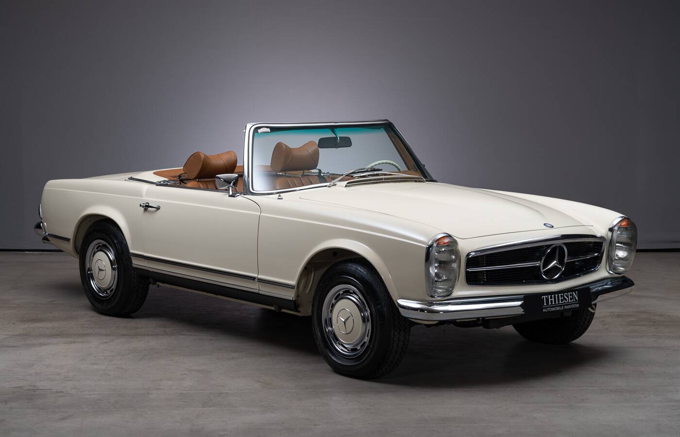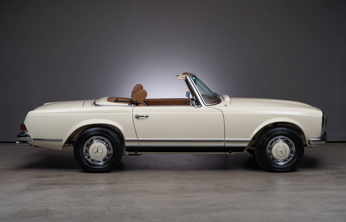 The Mercedes-Benz 280 SL offered here was imported from the United States to Germany several years ago and subsequently underwent a complete restoration under the supervision of its current owner, who is the proprietor of a Mercedes-Benz dealership. During the restoration, the car was visually converted to European specifications. The stamped engine number and the attractive Light Ivory colour correspond to the original delivery specification.