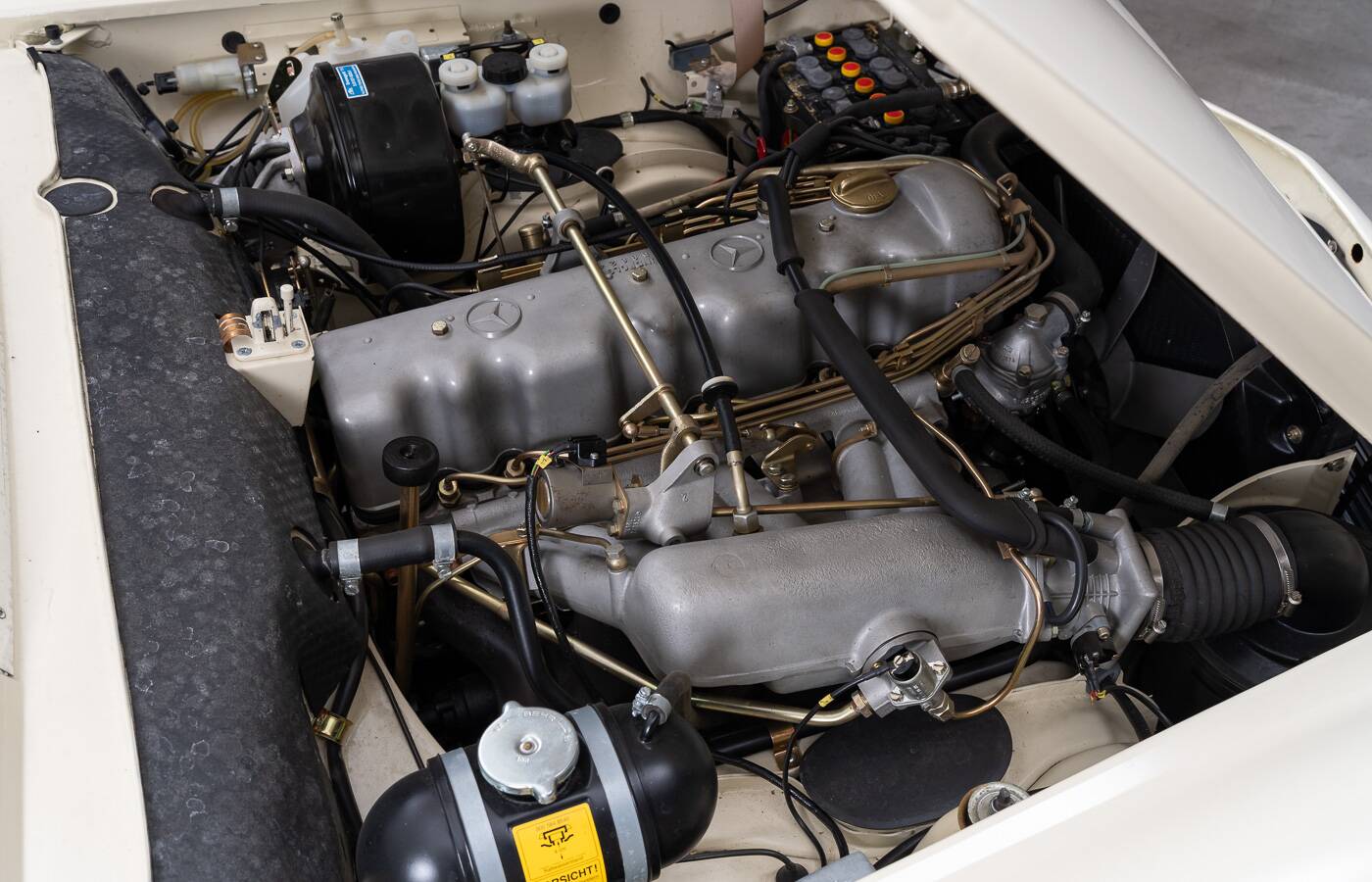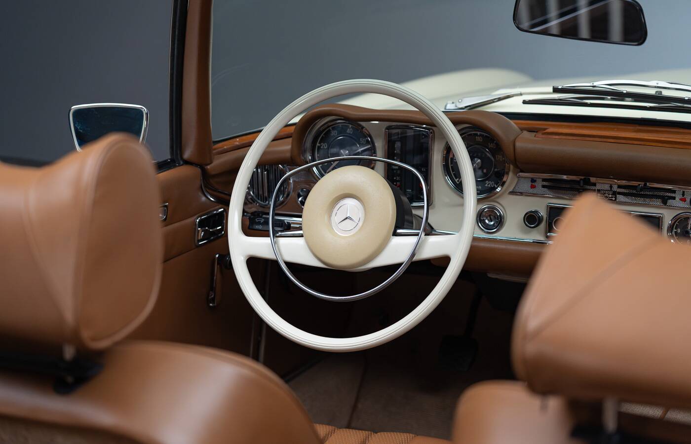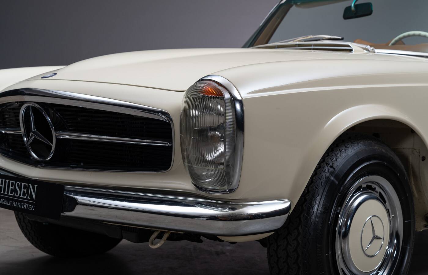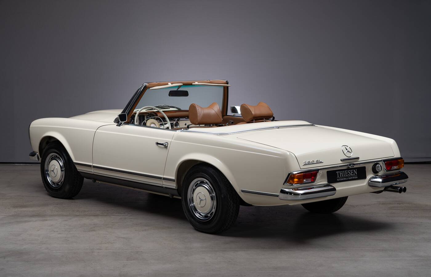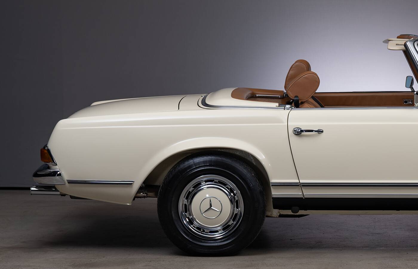 The Mercedes-Benz 280 SL offered here was imported from the United States to Germany several years ago and subsequently underwent a complete restoration under the supervision of its current owner, who is the proprietor of a Mercedes-Benz dealership. During the restoration, the car was visually converted to European specifications. The stamped engine number and the attractive Light Ivory colour correspond to the original delivery specification.