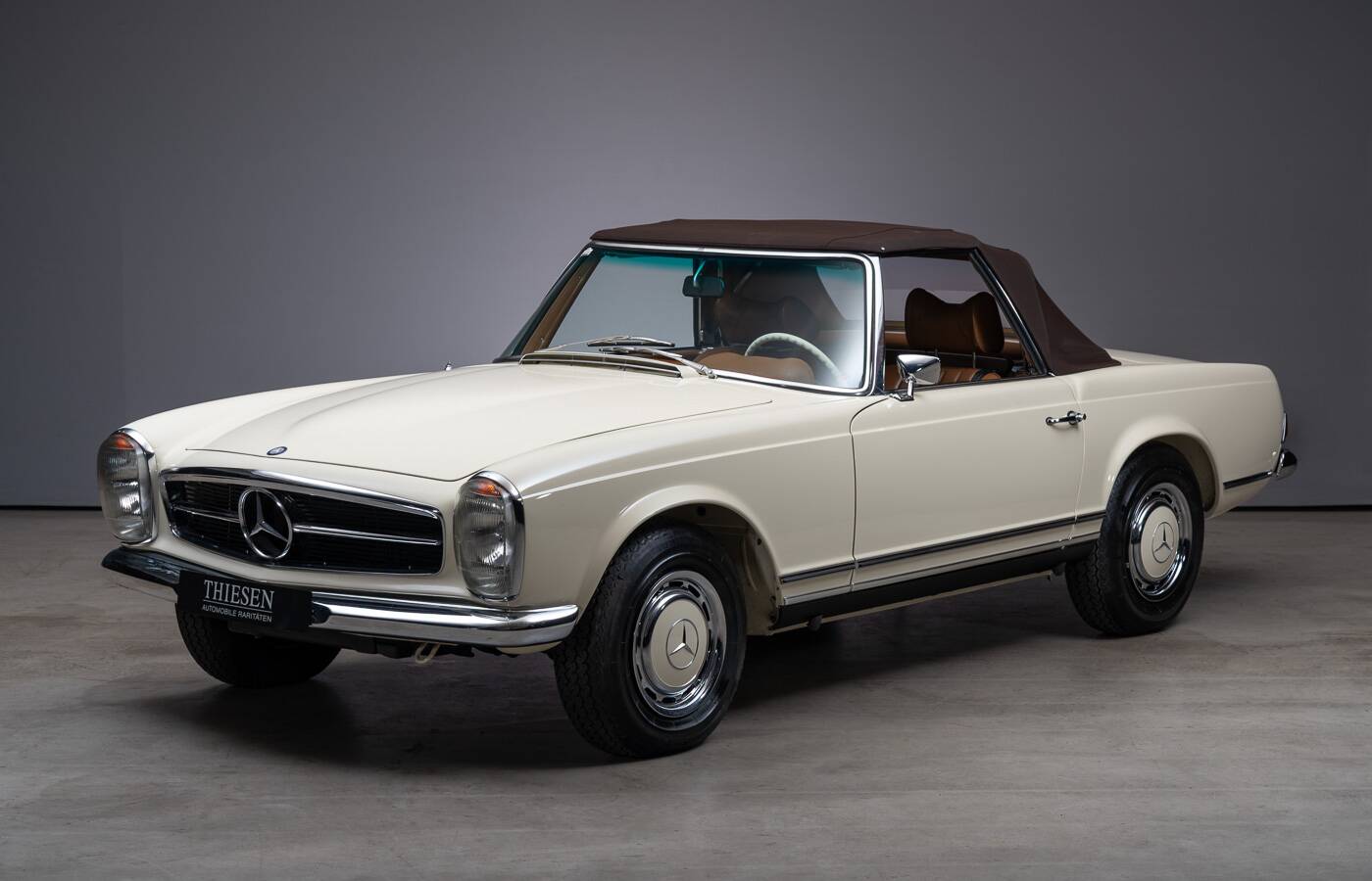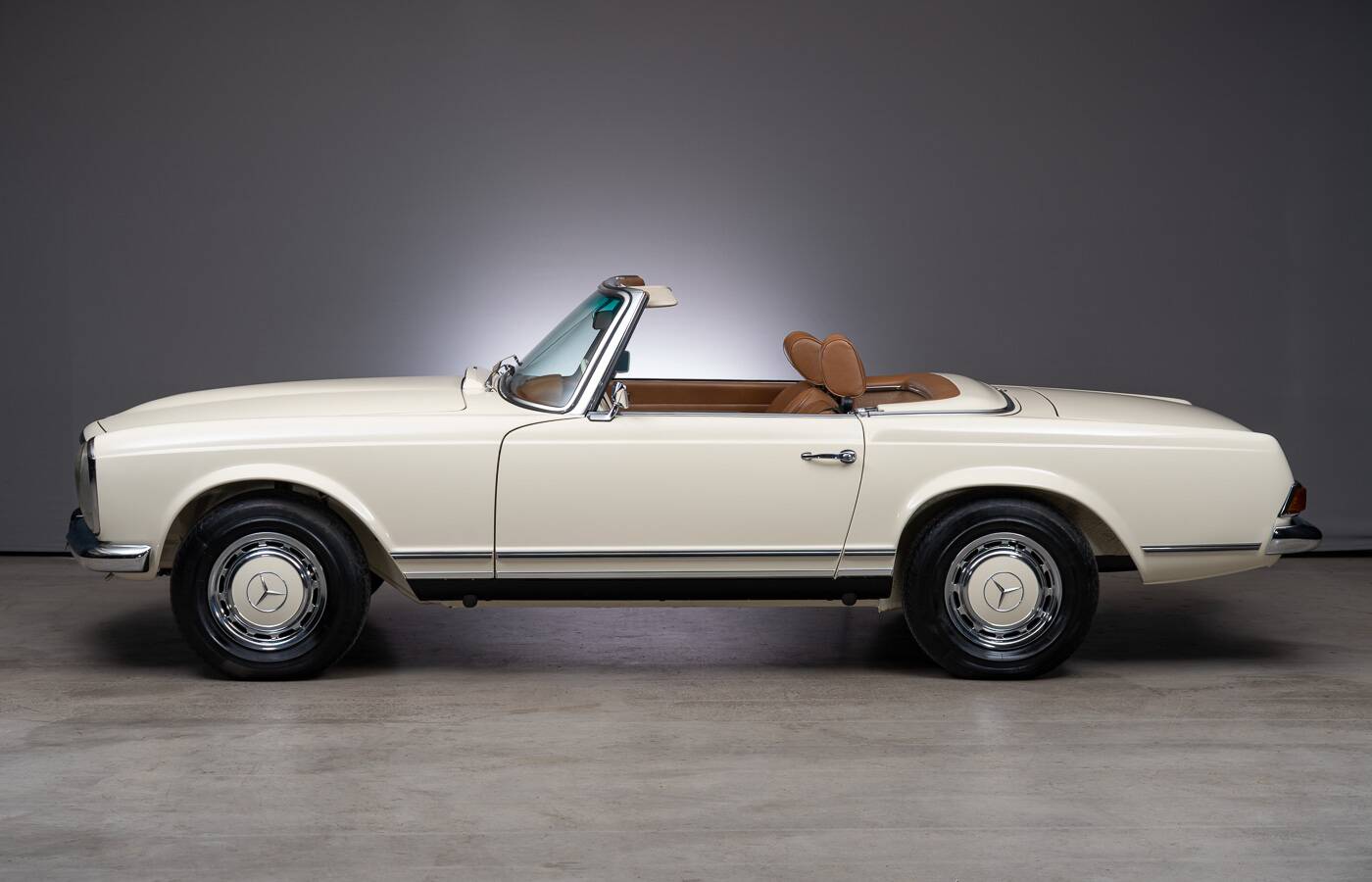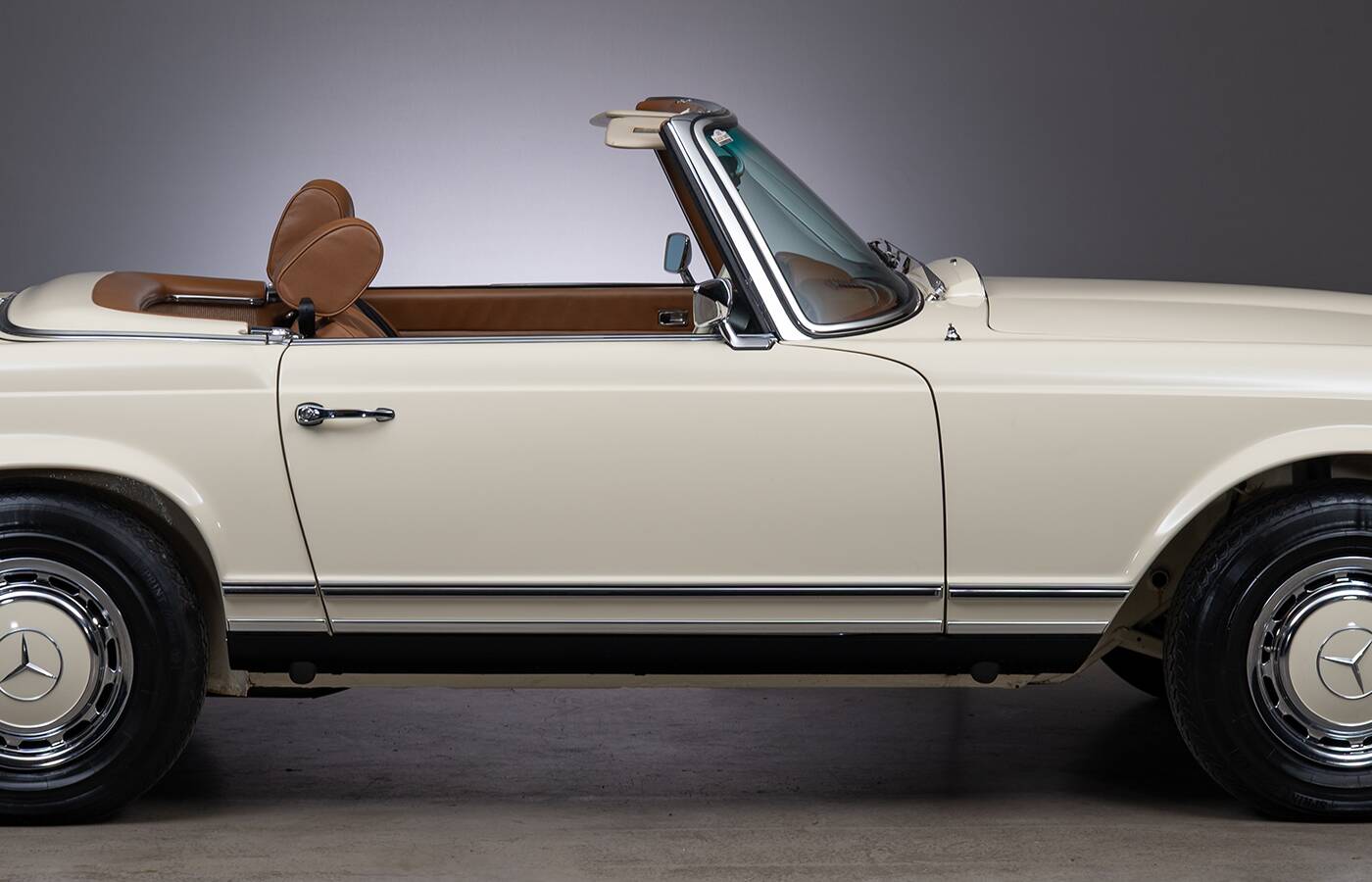 Mercedes-Benz introduced the W113 model at the Geneva Motor Show in March 1963 as the successor to two models at once: the 300 SL and the 190 SL. The new roadster, commonly known as the “Pagoda” due to the distinctive shape of its removable hardtop, replaced both. The W113 was the first SL to feature a safety body structure. Its floorpan, suspension and steering were largely derived from the contemporary S-Class (W111). Between 1963 and 1971, a total of 48,912 examples were produced.