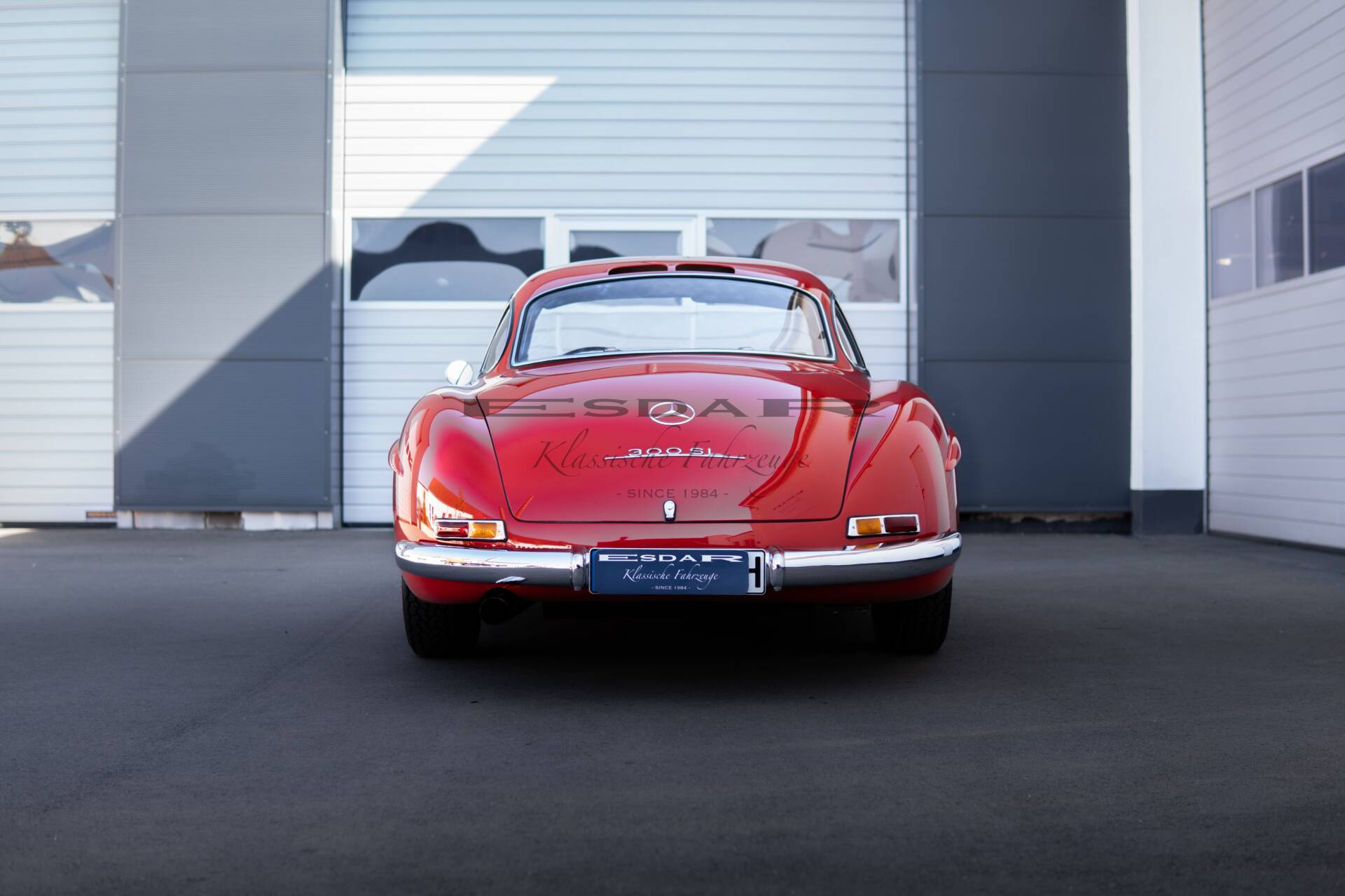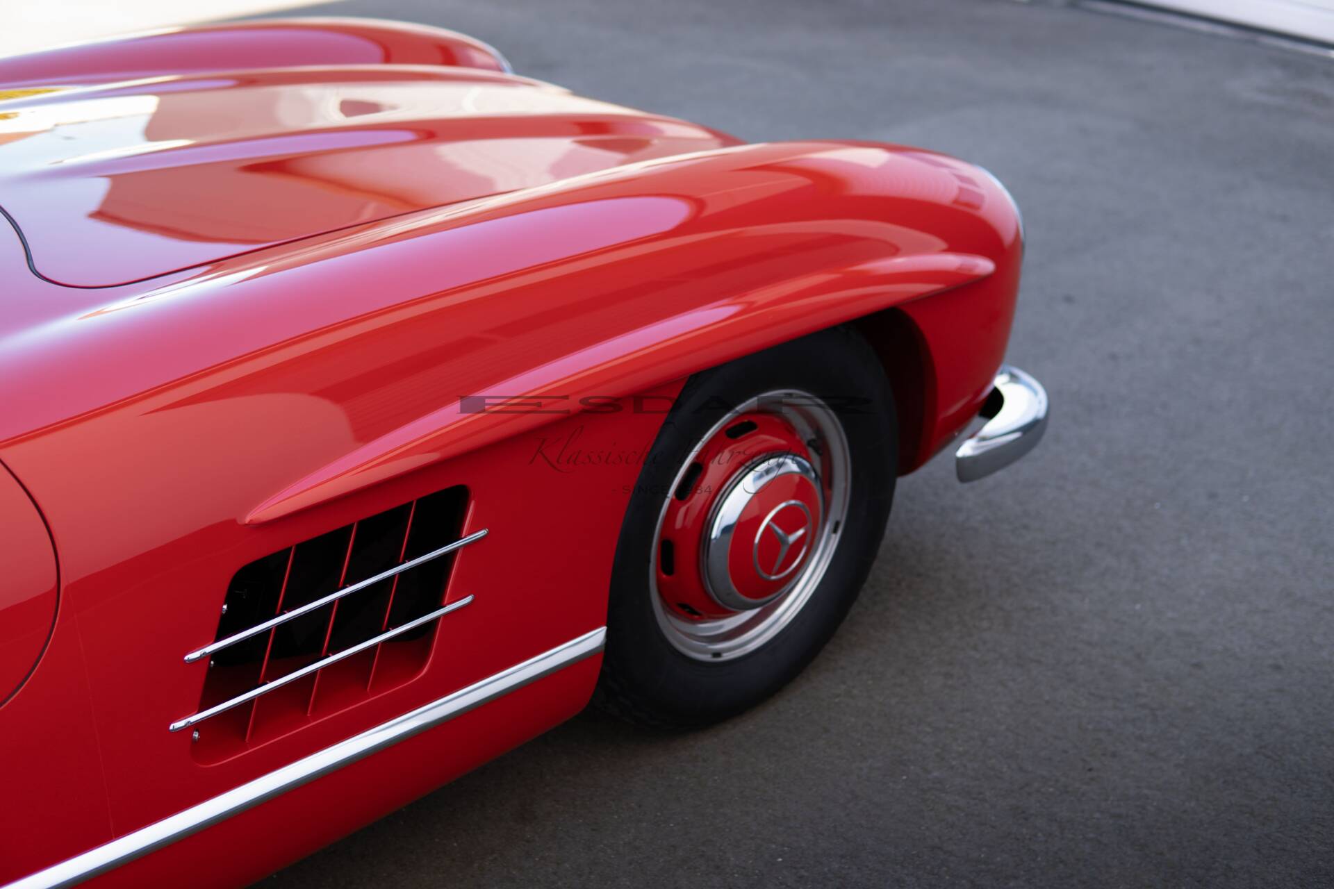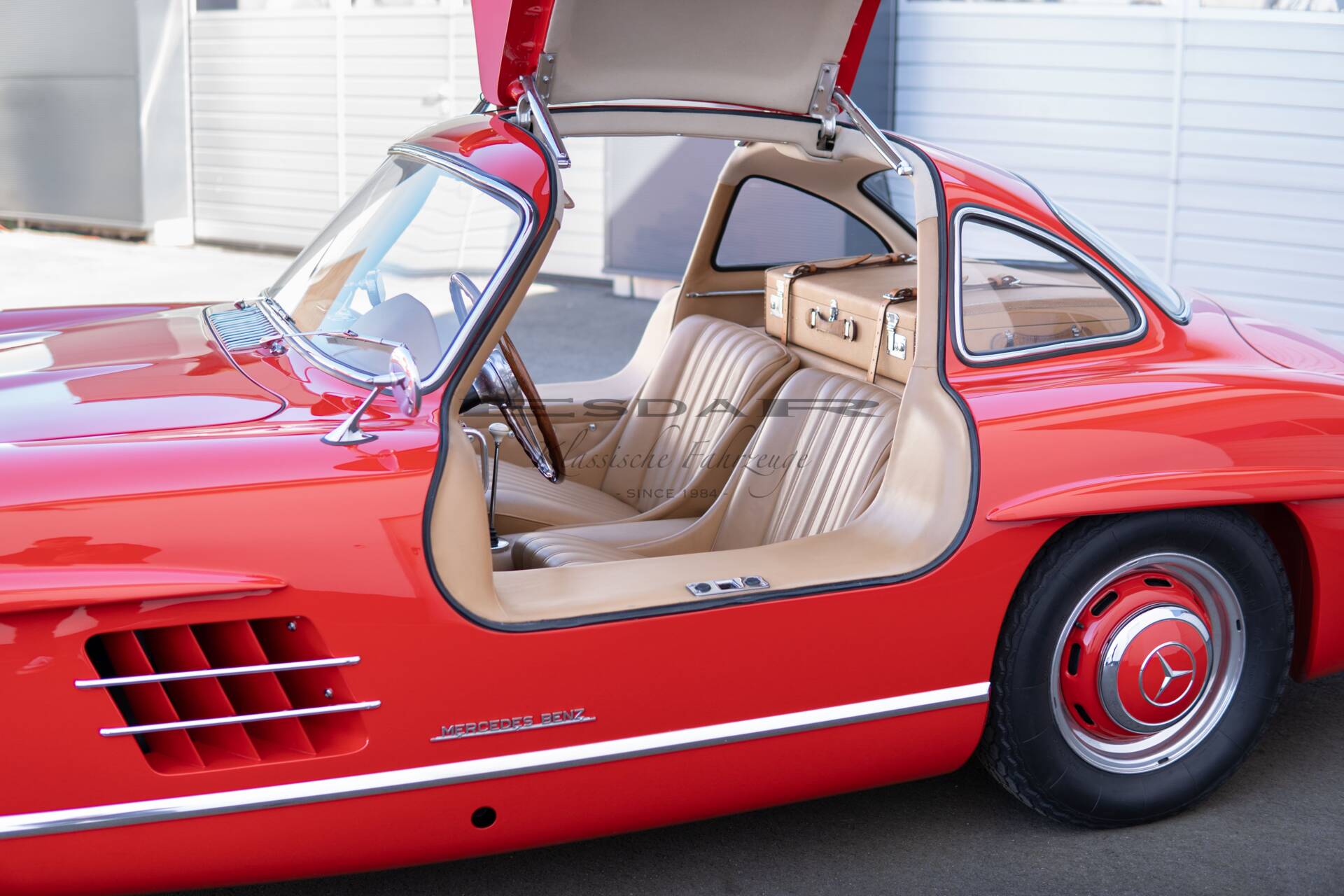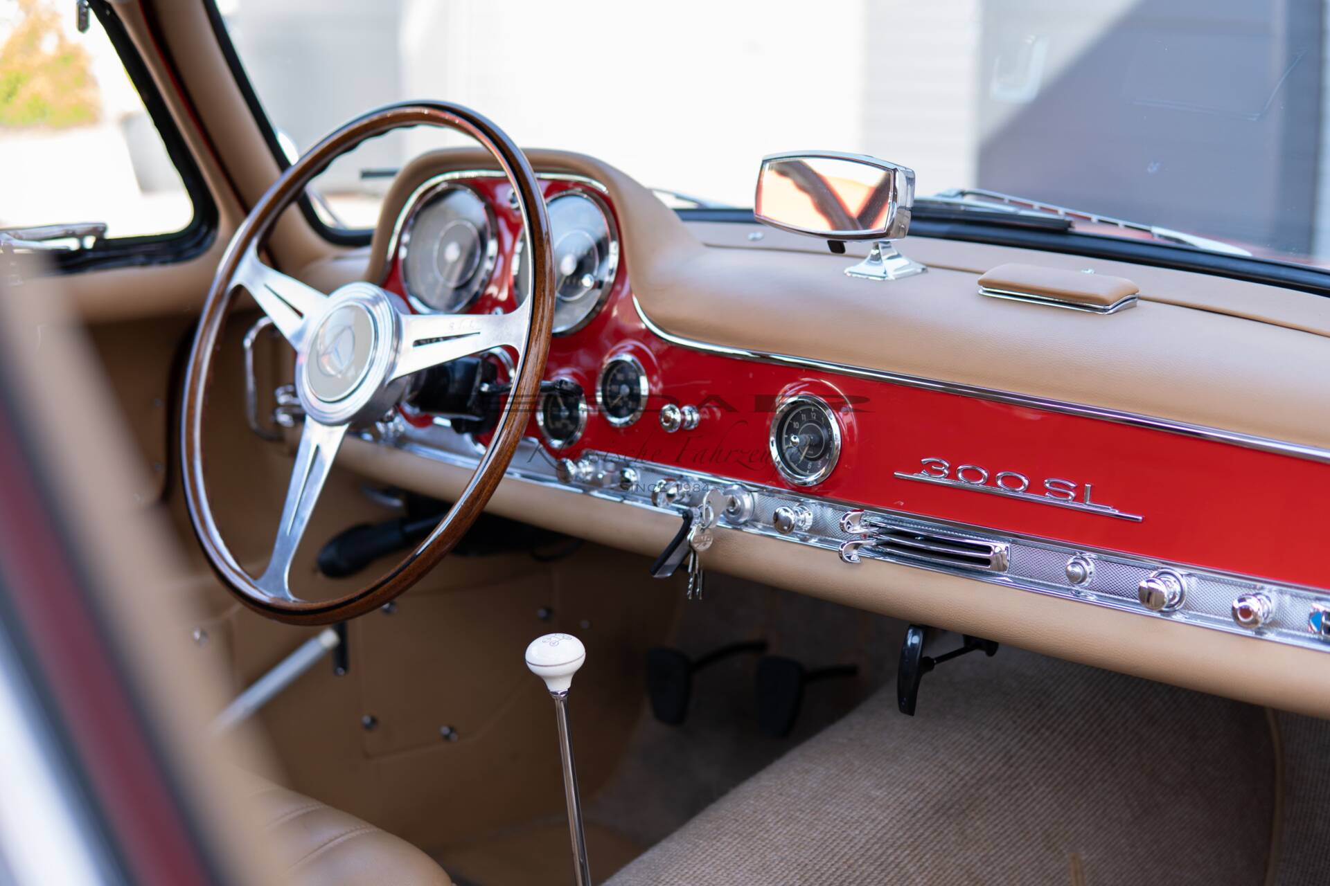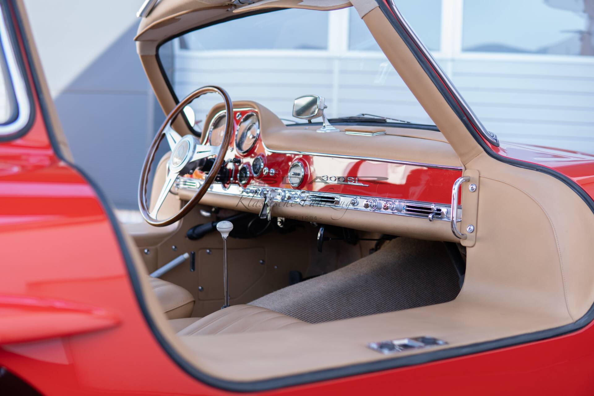 Ausgeliefert wurde der 300 SL in der seltenen Farbkombination DB 534 Feuerwehrrot mit einer Innenausstattung in L2 MB-Tex Beige. Damit entspricht das Fahrzeug sowohl technisch als auch optisch weitgehend dem Originalzustand. Lediglich 158 Exemplare wurden in dieser Außenfarbe produziert.