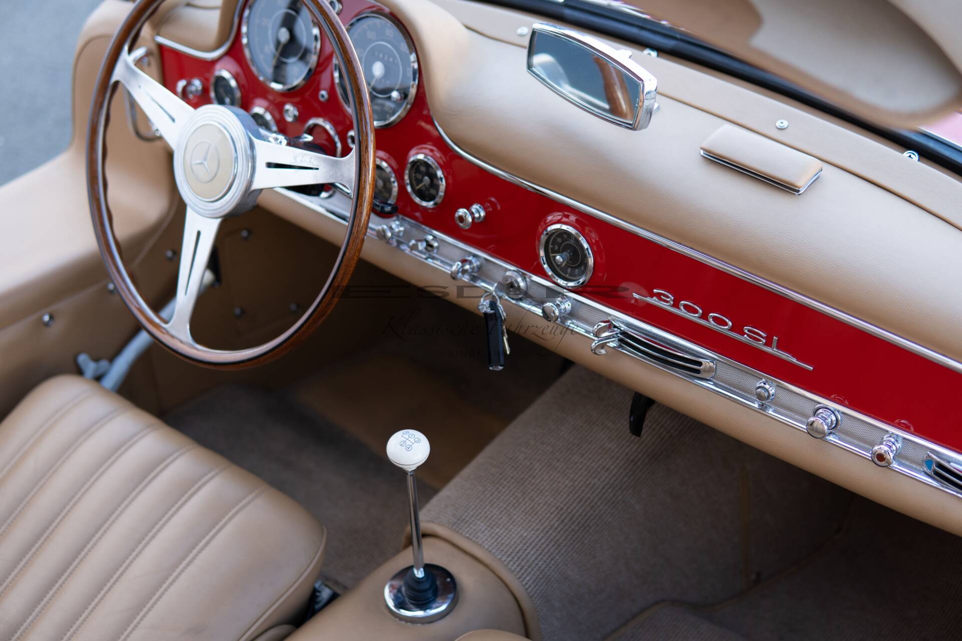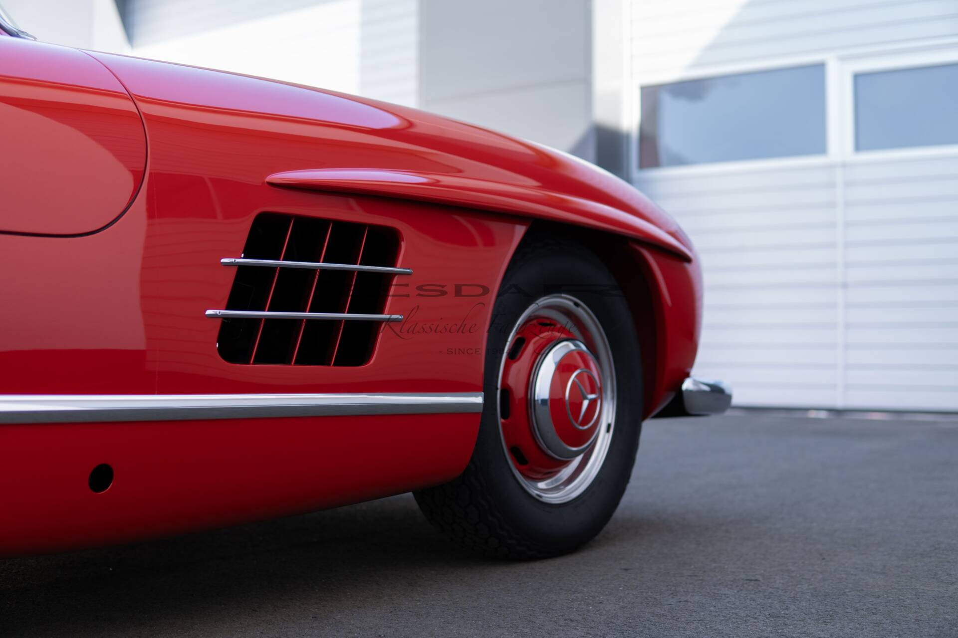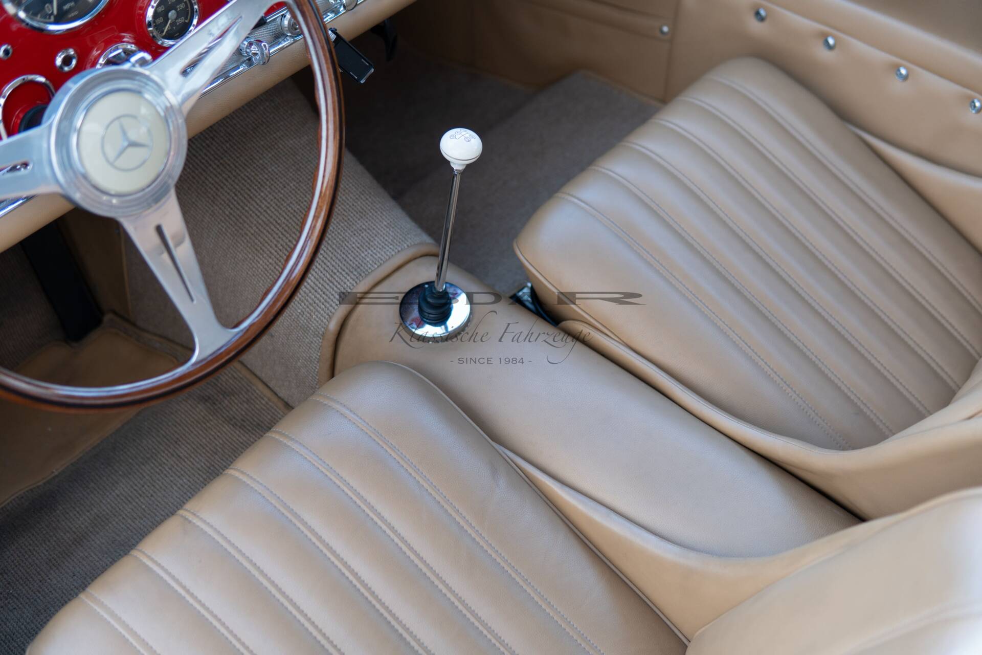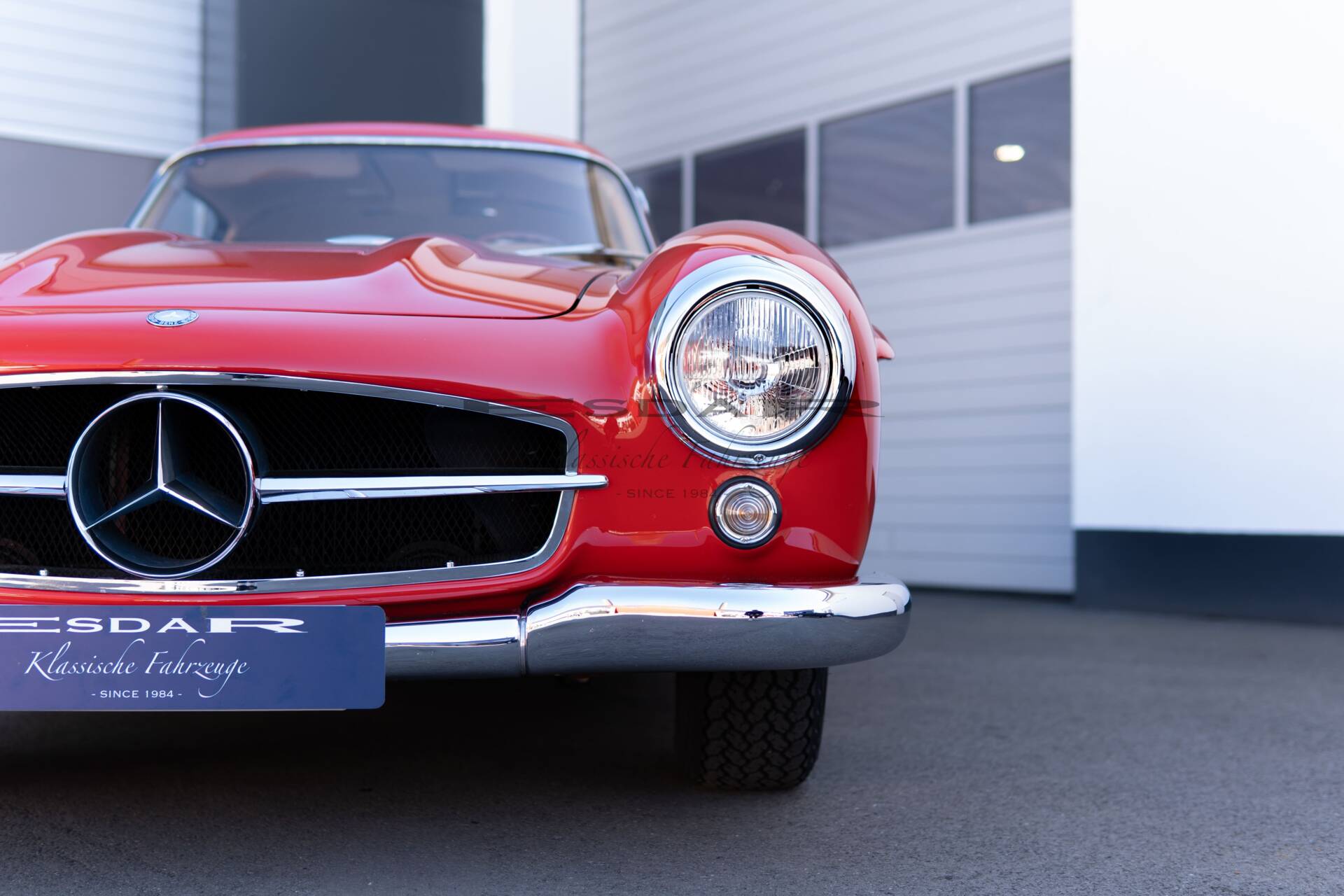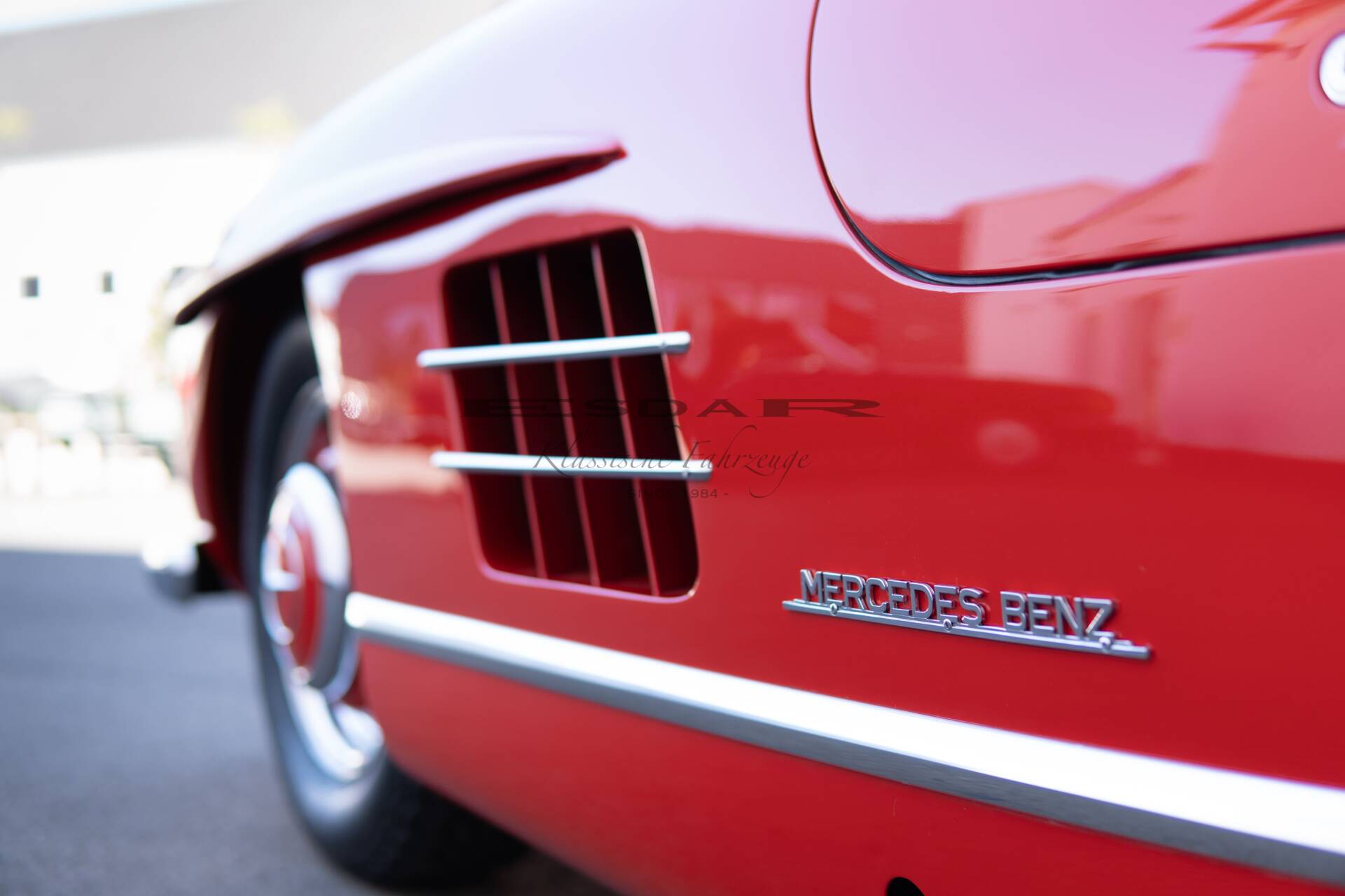 Ausgeliefert wurde der 300 SL in der seltenen Farbkombination DB 534 Feuerwehrrot mit einer Innenausstattung in L2 MB-Tex Beige. Damit entspricht das Fahrzeug sowohl technisch als auch optisch weitgehend dem Originalzustand. Lediglich 158 Exemplare wurden in dieser Außenfarbe produziert.