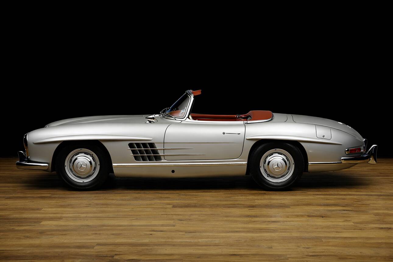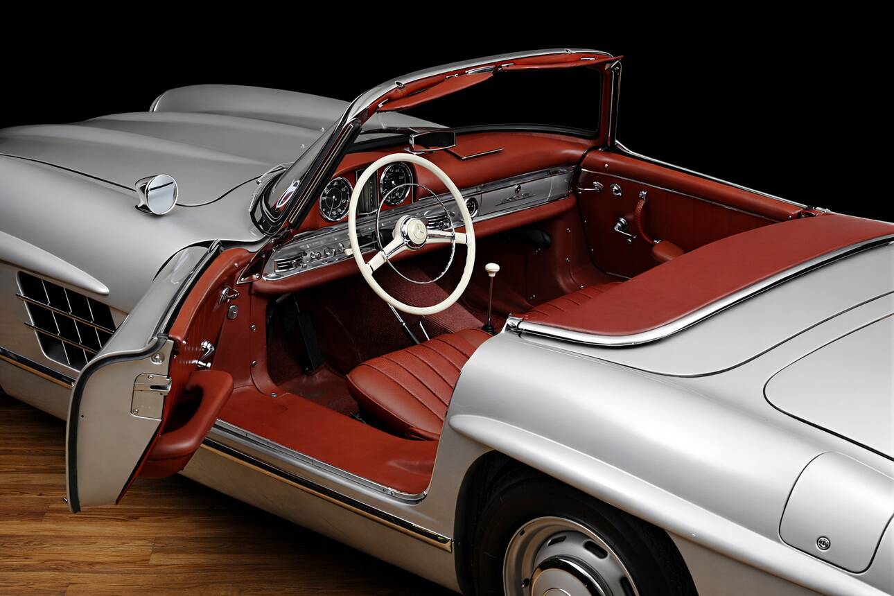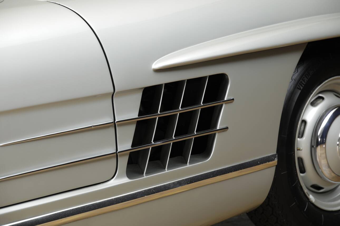 This example impresses with its very solid overall condition and good degree of originality, still featuring its original leather interior with patina. In terms of technical originality, the 300 SL offers matching numbers for the engine, gearbox, front axle and rear axle. Over time, however, the paintwork has been renewed and changed to silver metallic. A look into the light wells of the front headlights gives an indication of the good substance and quality of the bodywork, and the compression diagram testifies to a robust engine on all six cylinders. All type plates are original and in the correct place.
