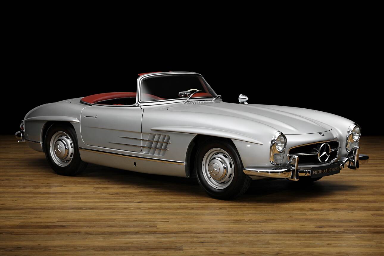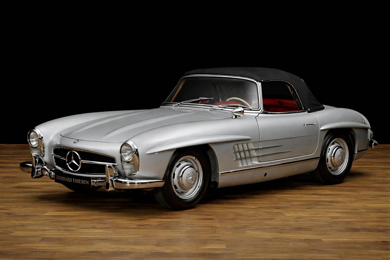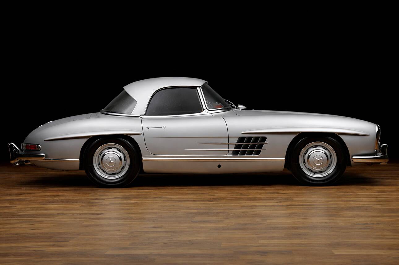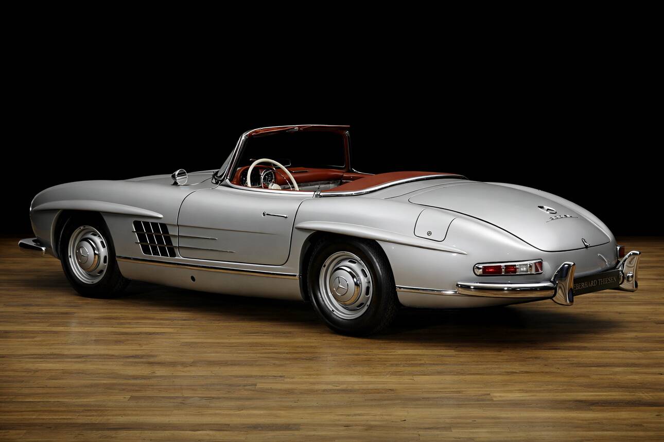 This example impresses with its very solid overall condition and good degree of originality, still featuring its original leather interior with patina. In terms of technical originality, the 300 SL offers matching numbers for the engine, gearbox, front axle and rear axle. Over time, however, the paintwork has been renewed and changed to silver metallic. A look into the light wells of the front headlights gives an indication of the good substance and quality of the bodywork, and the compression diagram testifies to a robust engine on all six cylinders. All type plates are original and in the correct place.