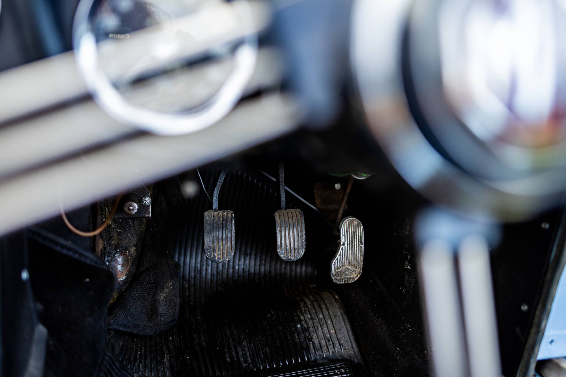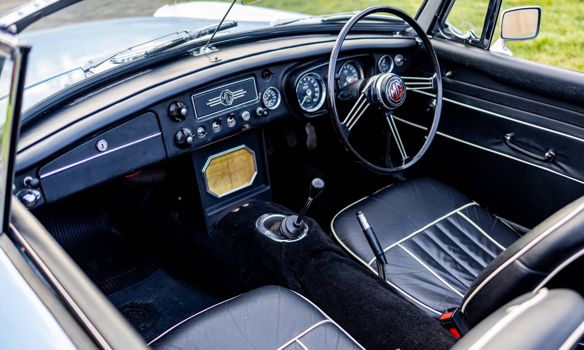 This very original, three-owners-from-new example, is presented in Iris Blue, its original colour, and has a black leather interior. The seats have been retrimmed with white piping in circa 2017 when the current owner purchased the car from a 38-year previous ownership. It comes with a black hood, and a stainless steel fitted luggage rack on the rear boot lid. Being an early MGB, it is powered by the preferable and rare three-bearing 1,798 cc B-Series engine, which sounds great! It sits on wire wheels which are in good condition and interestingly, this example comes with its original buff logbook confirming that the chassis and engine are indeed original from factory. Much work has been carried out to this great British classic (full list in the history file) which includes two new front and rear inner wings, two front and rear wings, two new sills, new rear springs, fuel tank, new windscreen and quarter lights, new tyres/wheels and new radiator, to name a few items, resulting in a sound car mechanically and one that drives well according to our vendor, who has covered minimum mileage since work was carried out. This is certainly a MGB which can be used regularly and still brings a smile to your face. Consigned by James Good