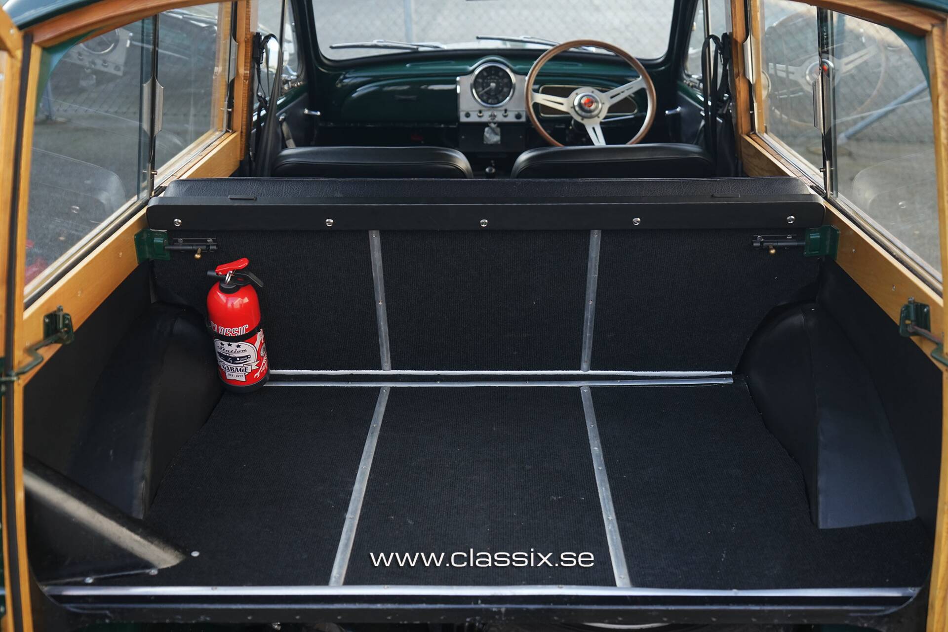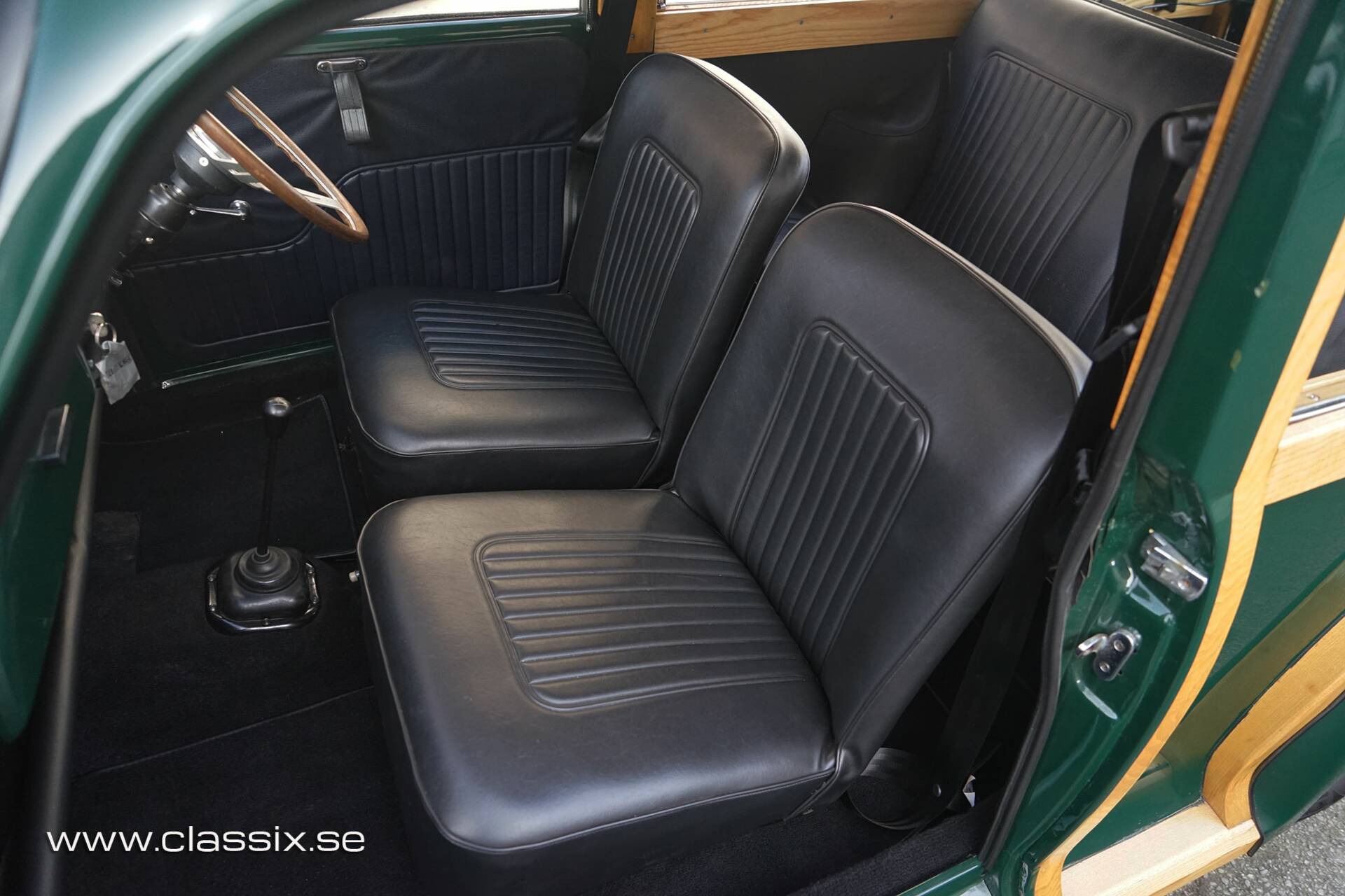 Interior: The interior is simple, functional, and very "period." You’ve got black vinyl seats and brand-new carpets that give the cabin a fresh, well-cared-for feel. The addition of a wood-rimmed steering wheel ties the interior to the exterior woodwork beautifully. Being a Traveller, it’s surprisingly practical—with the rear seats folded flat, you have a massive amount of cargo space, making it a classic you can actually use for more than just a Sunday drive.