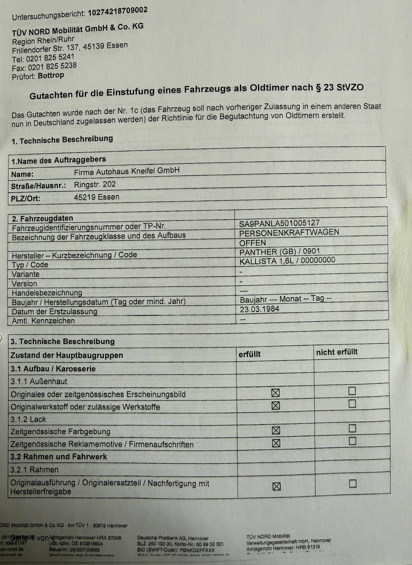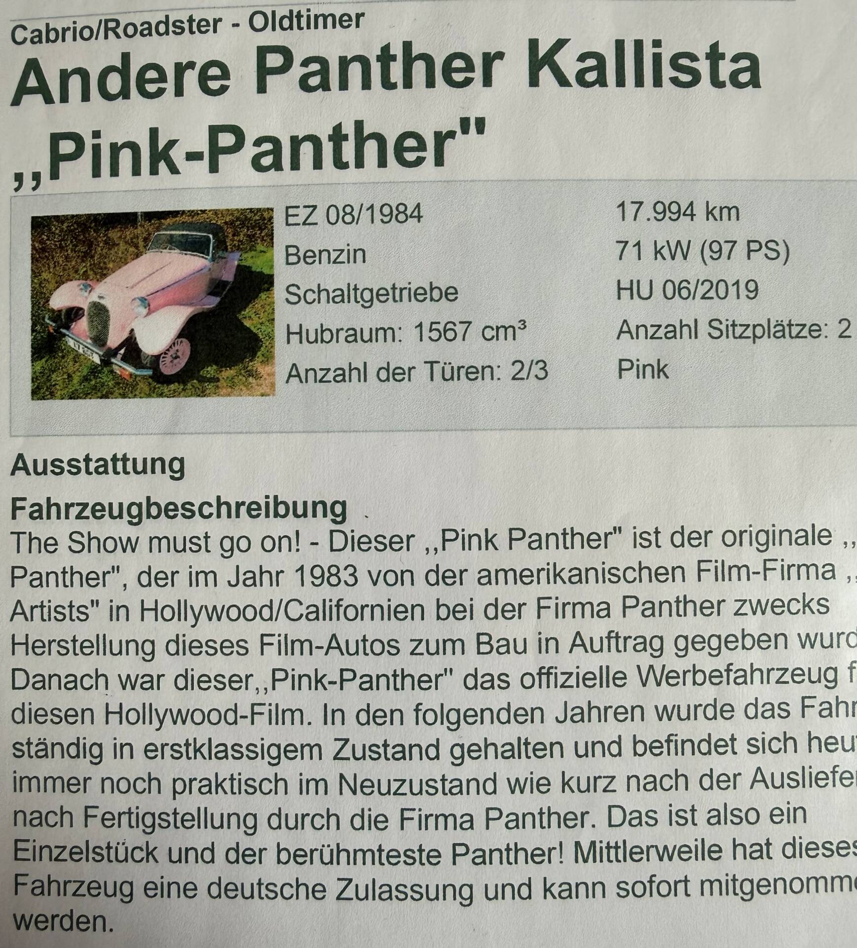 Der Sommer naht biete liebevoll gepflegtes Unikat Ford Kalista 1,6 l in der Orginal Farbe rosa. Dieses Fahrzeug wurde nur 1600 mal gebaut und unser Paulchen ist der einzige in der Unikat Farbe „pink“. Da er speziell für den Film „der rosarote Panter“ als Promotion Fahrzeug hergestellt wurde. Er besitzt eine deutsche Straßen Zulassung und neu TüV. Er ist ein Garagen und schön Wetter Fahrzeug. Er besitzt ein H Kennzeichen und ist mit seinen 43 Jahren ein echte Sensation auf der Straße.