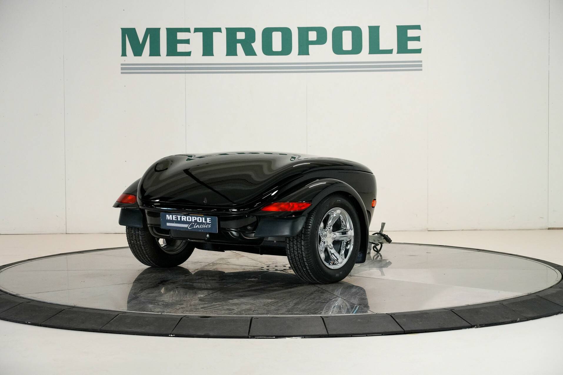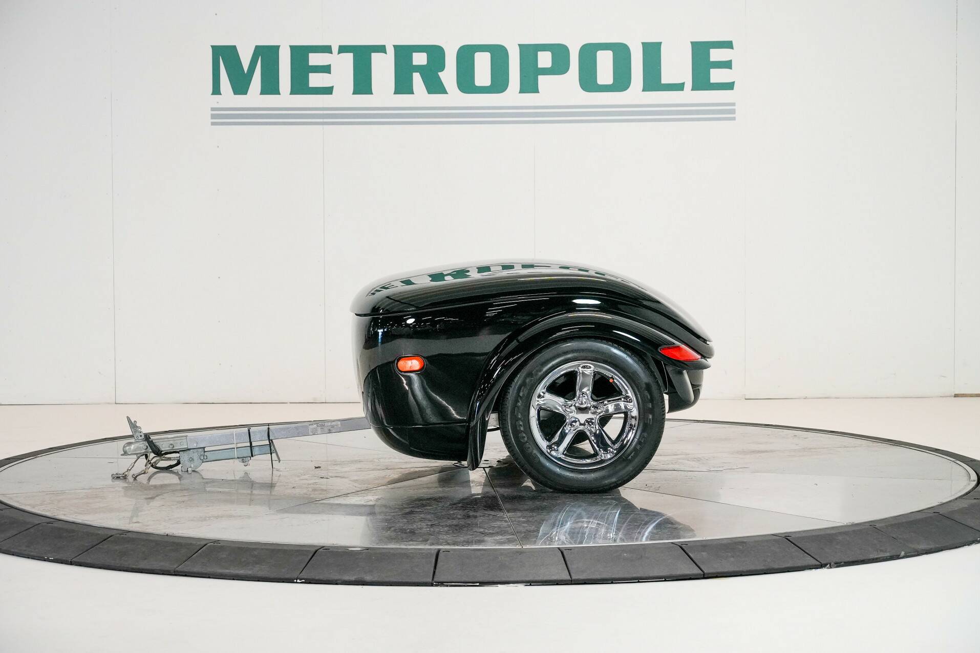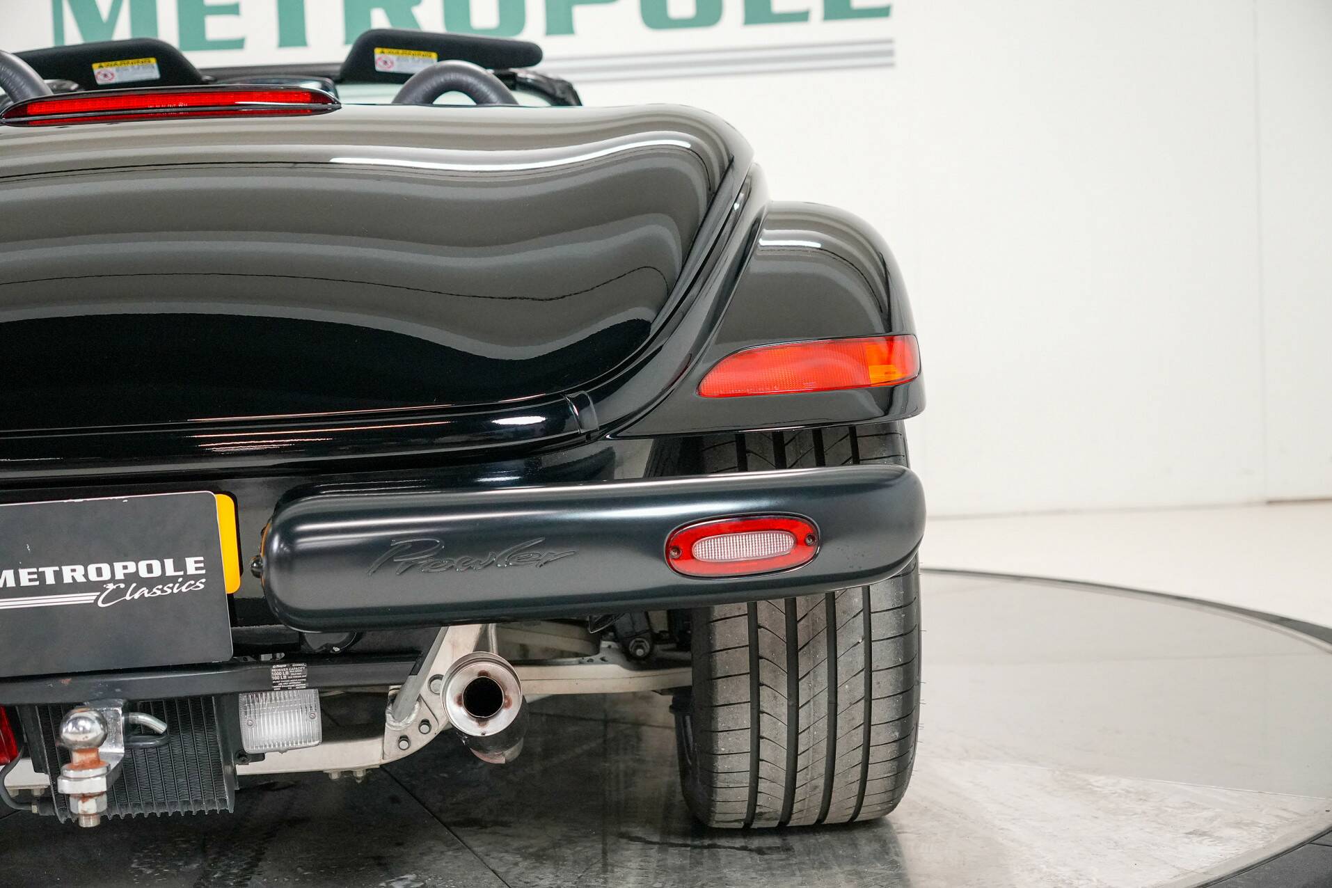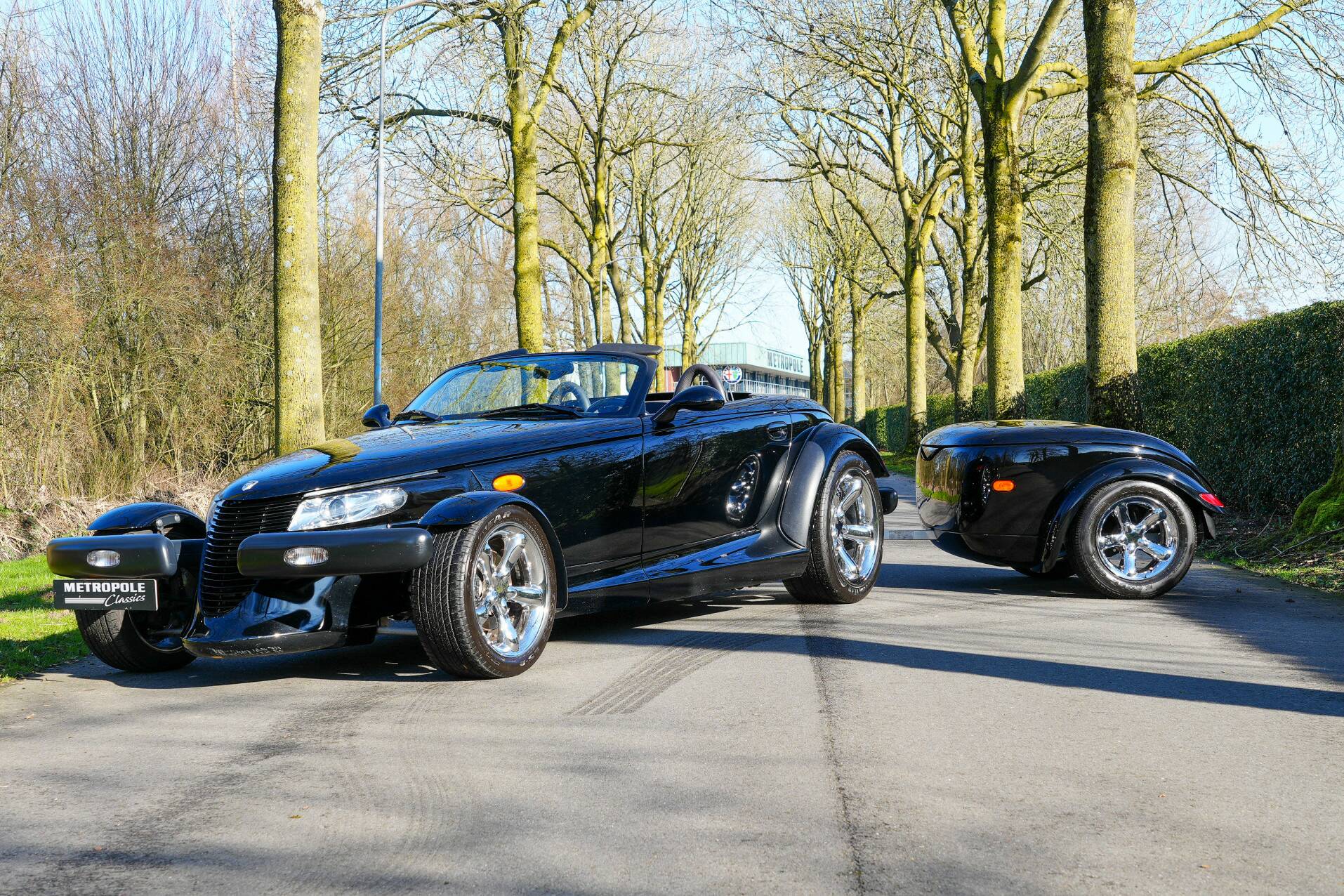 The car shown here is virtually unused and appears new. It is black with a black leather interior. White gauges are visible on the dashboard. It also features a 24-valve engine with a 3.5-liter displacement and 257 horsepower, providing ample power. It also comes with a matching trailer so you can carry suitcases or something similar. A truly special car for someone looking for something completely different than a regular car. You do need a certain amount of courage to venture out in a Plymouth Prowler.