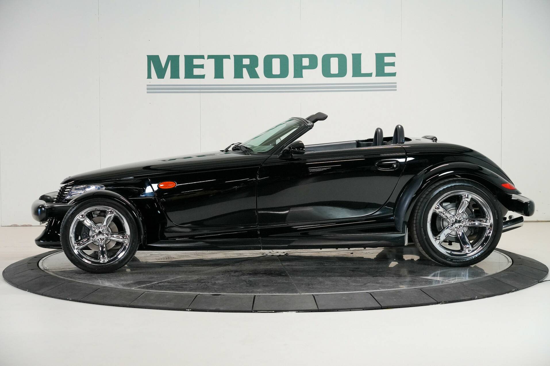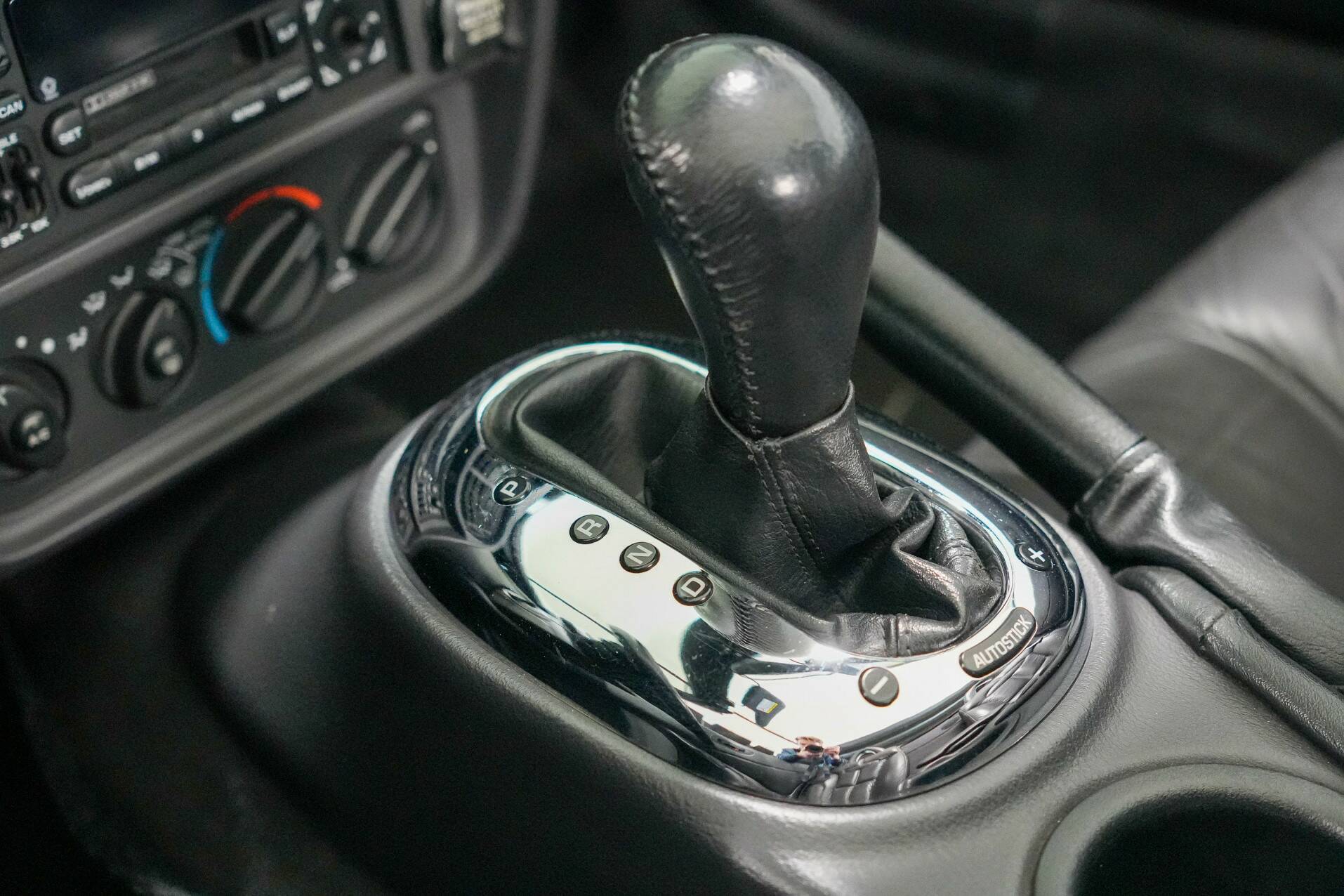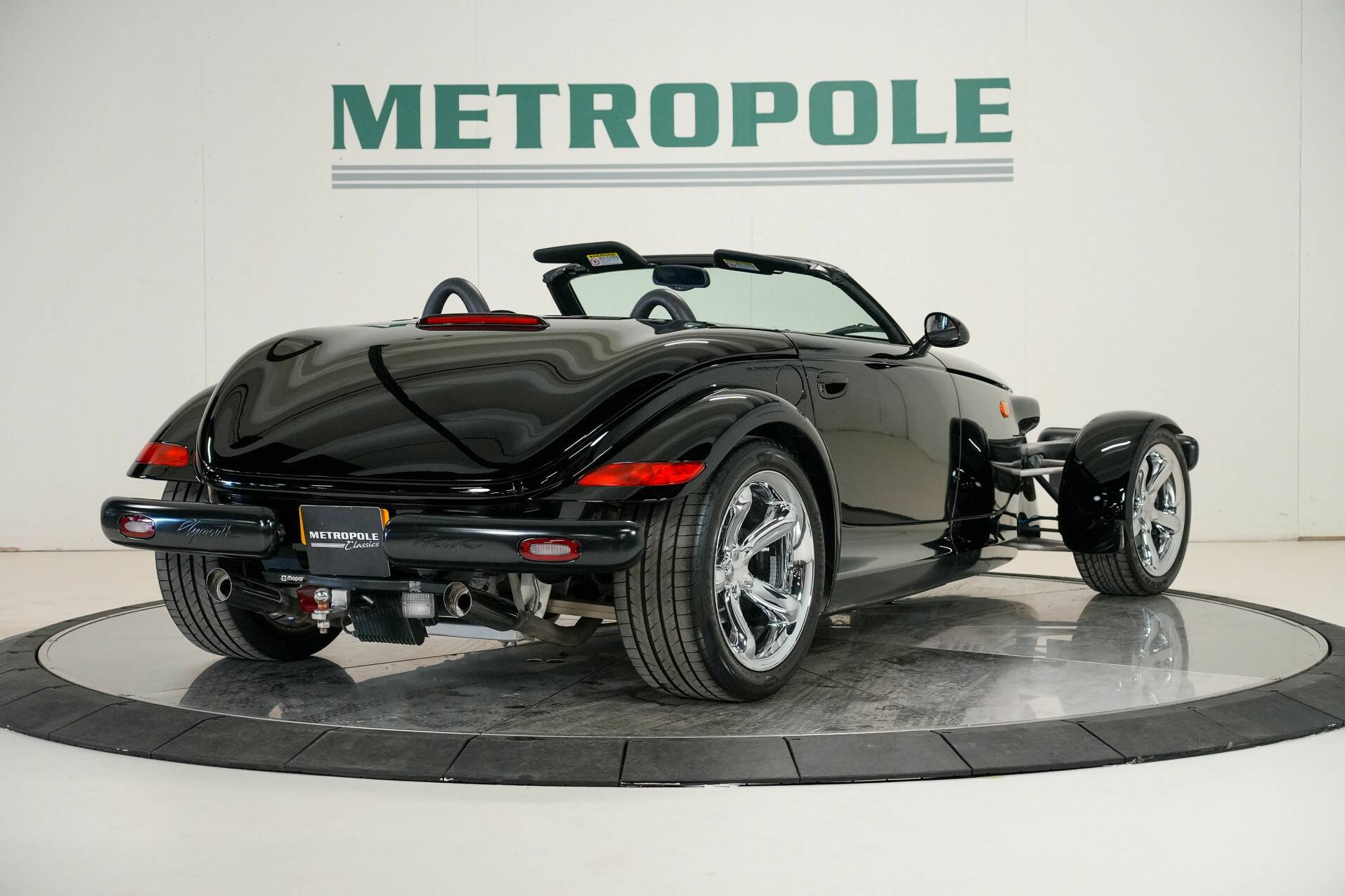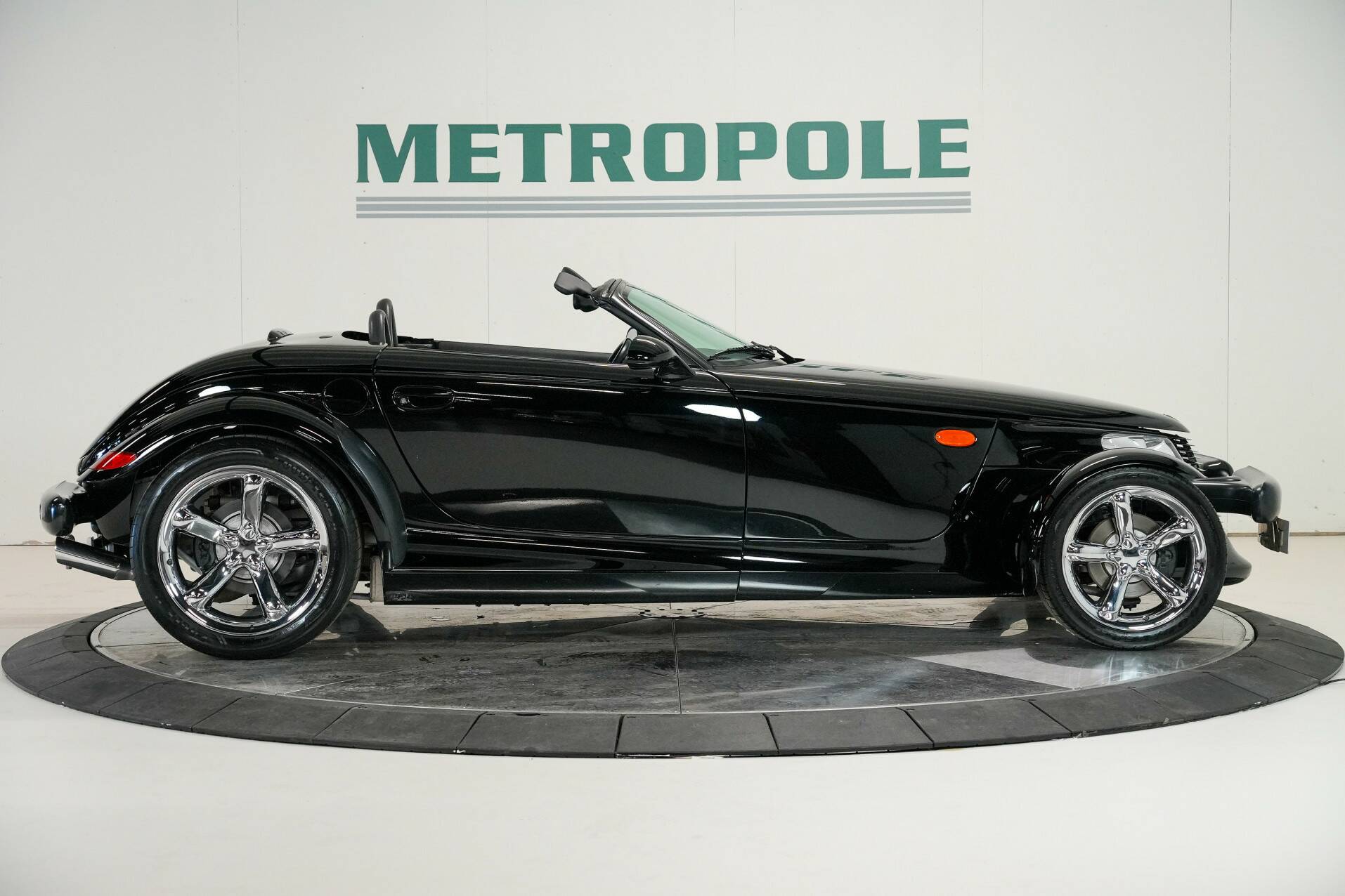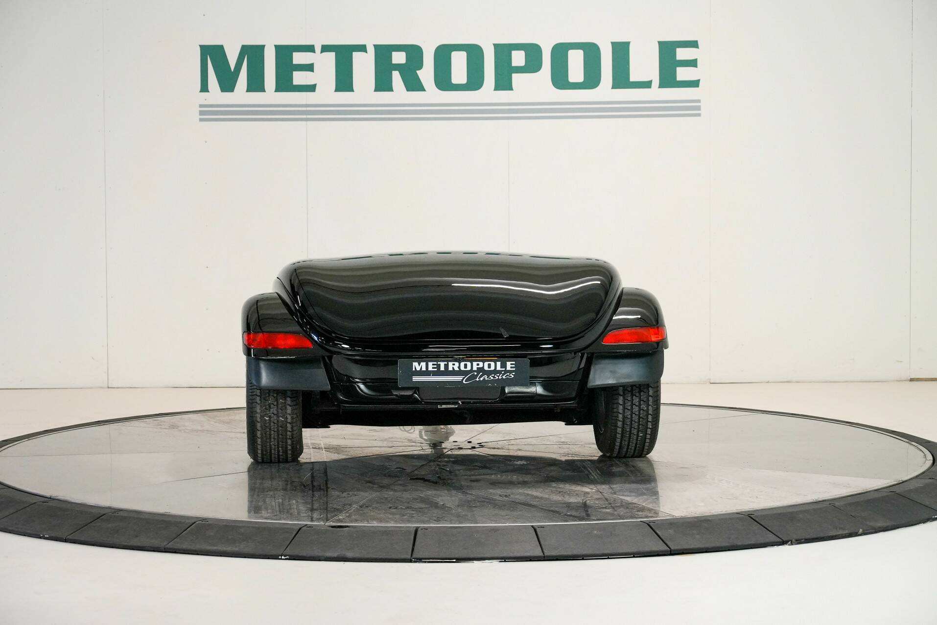 The car shown here is virtually unused and appears new. It is black with a black leather interior. White gauges are visible on the dashboard. It also features a 24-valve engine with a 3.5-liter displacement and 257 horsepower, providing ample power. It also comes with a matching trailer so you can carry suitcases or something similar. A truly special car for someone looking for something completely different than a regular car. You do need a certain amount of courage to venture out in a Plymouth Prowler.