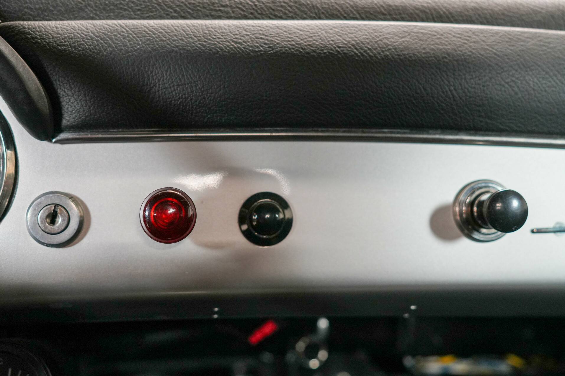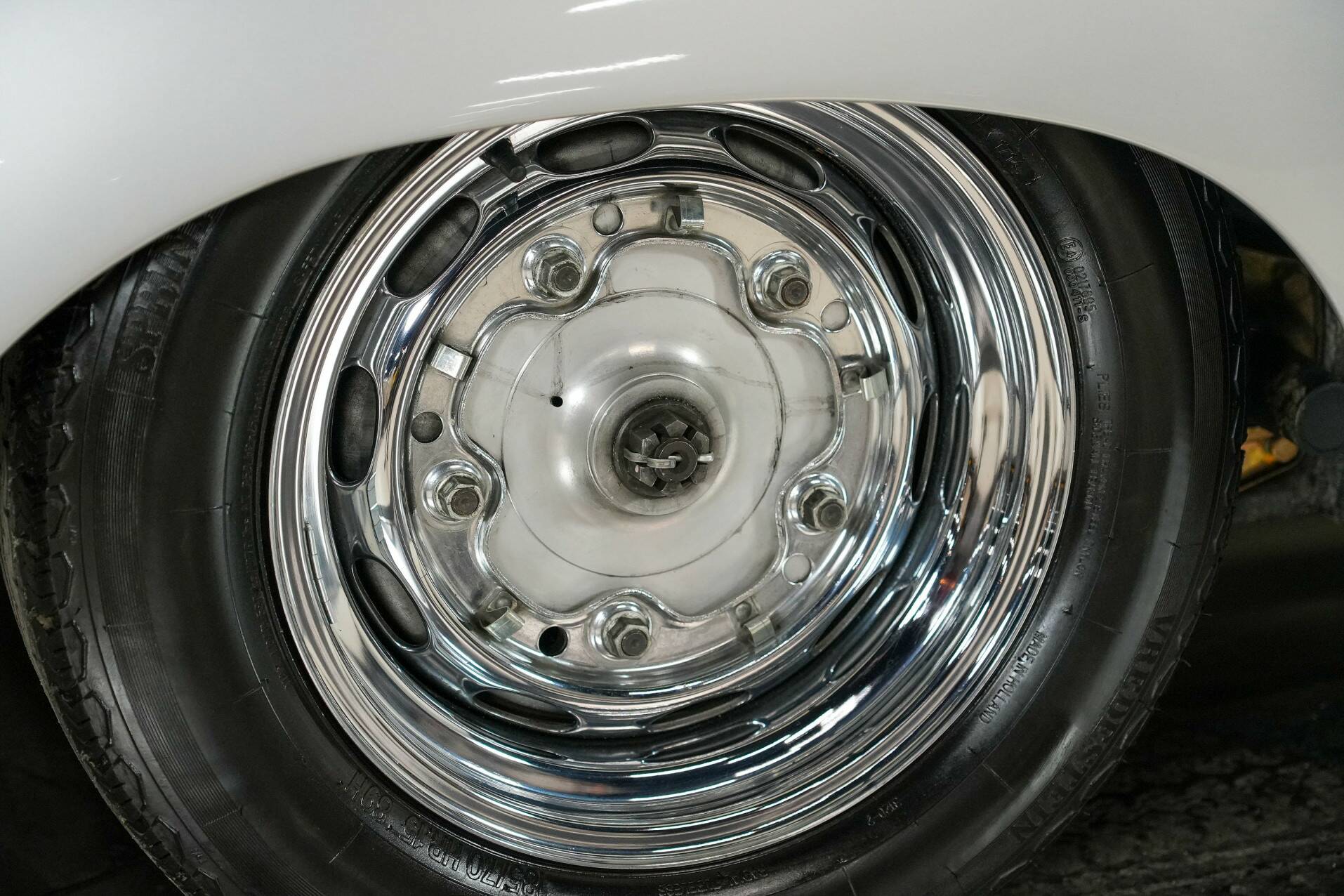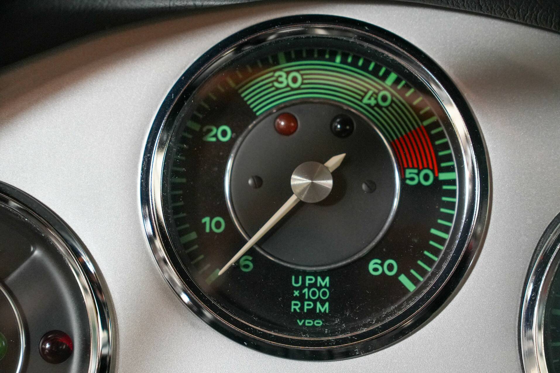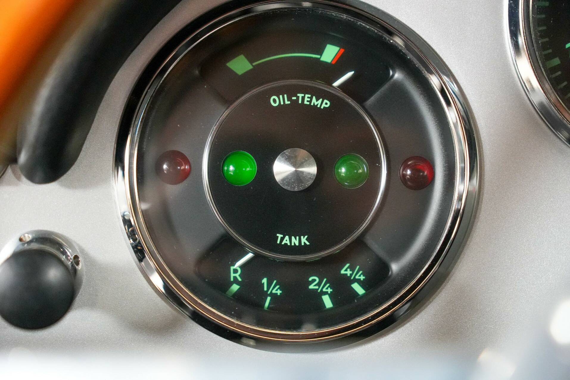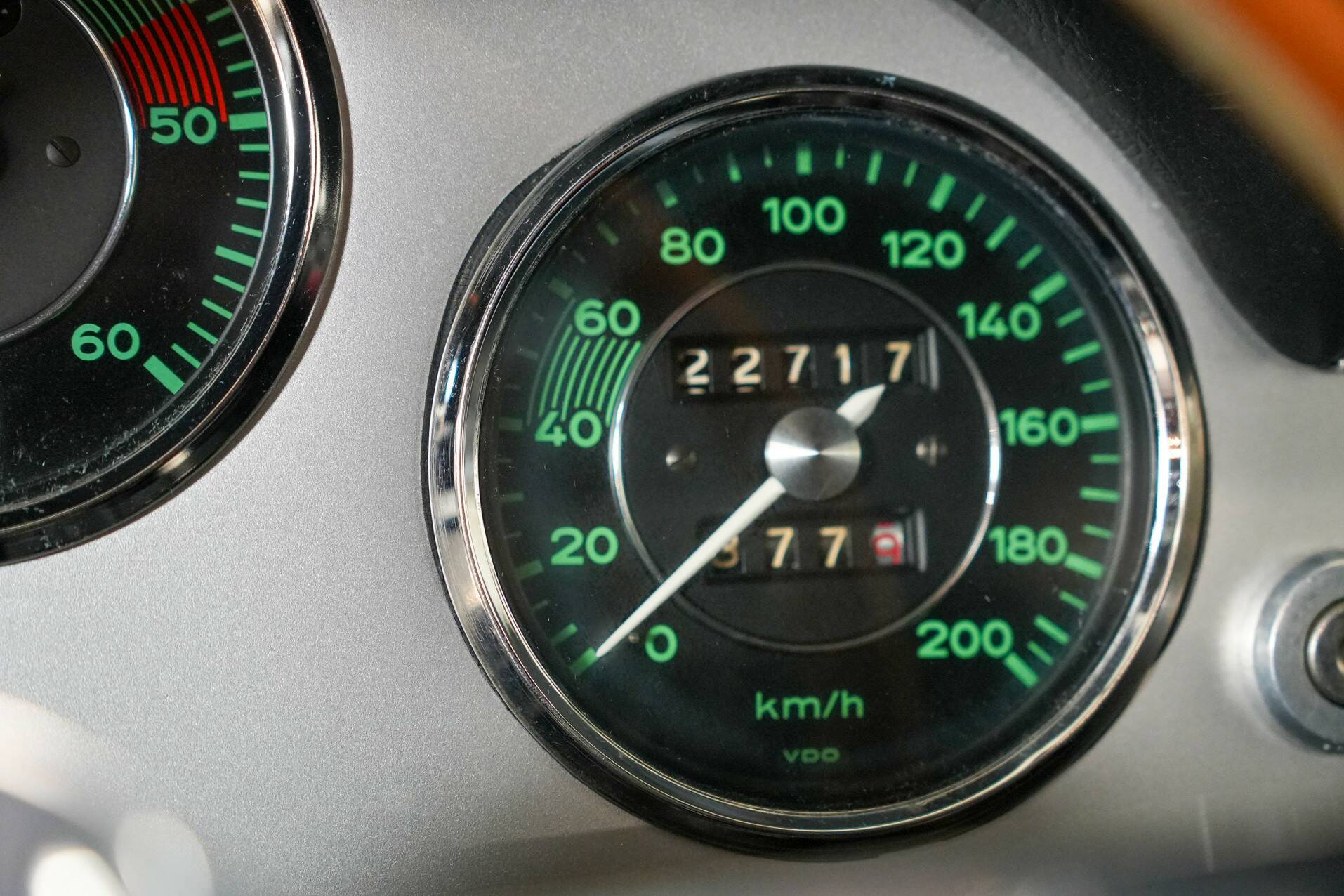 Further to emphasise the Speedster's sporty character, the bumpers were removed, the headlights fitted with protective grilles, and fog lights installed. The speedometer and rev counter are highlighted in green. In addition, an oil temperature gauge is installed beneath the dashboard, and a daily odometer on the right-hand side. The steering wheel is a three-spoke wooden item.