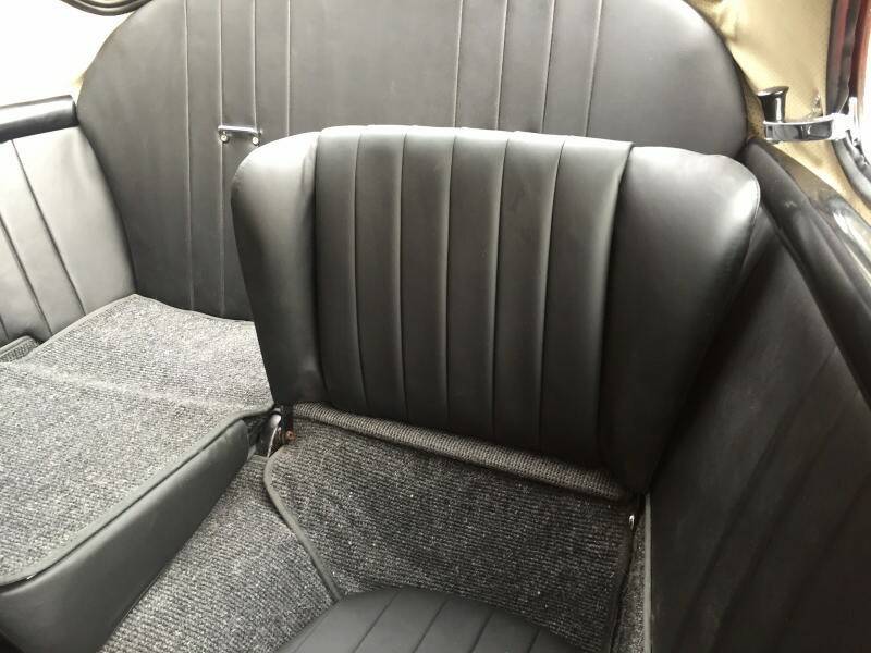 Der Innenraum wurde komplett erneuert, die Sitze haben neue Federkerne erhalten und wurden mit Leder (Schwarz) bezogen. Der Teppich Haargarn Bouclé (Grau) wurde neu eingepasst und auch der Himmel wurde erneuert.