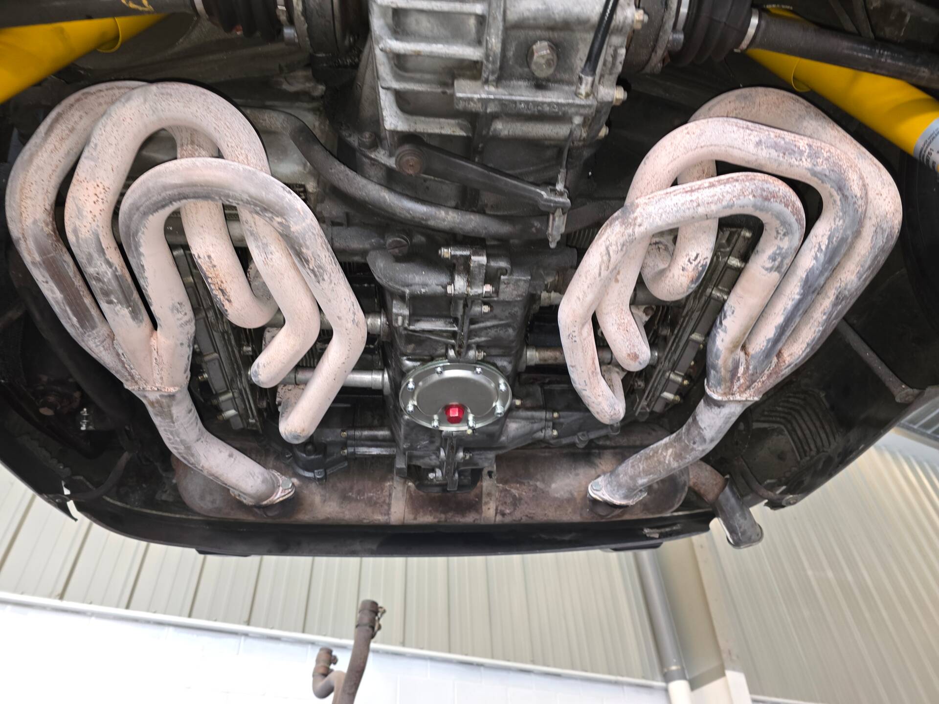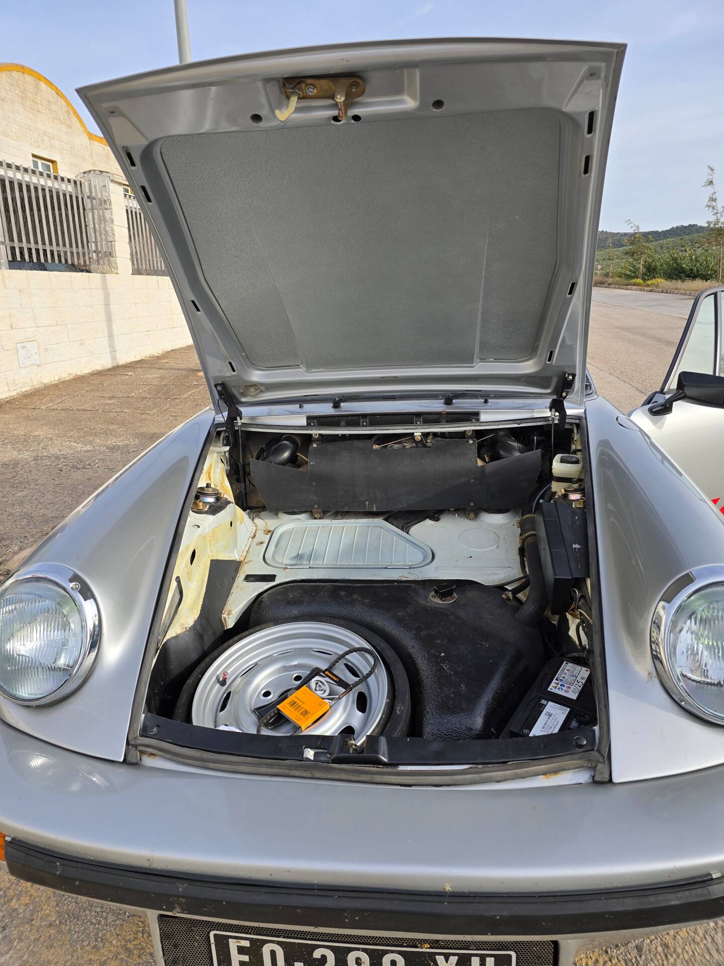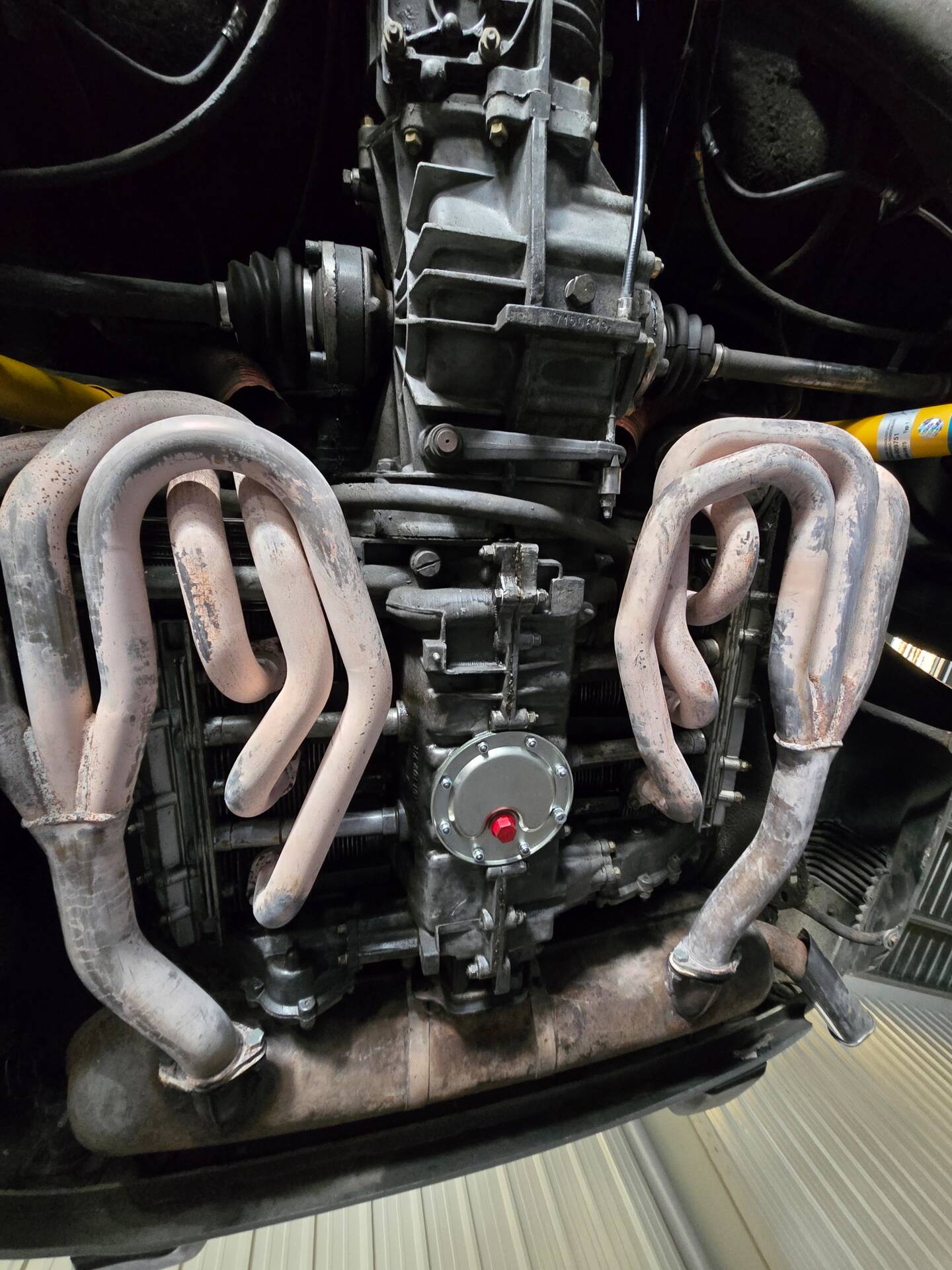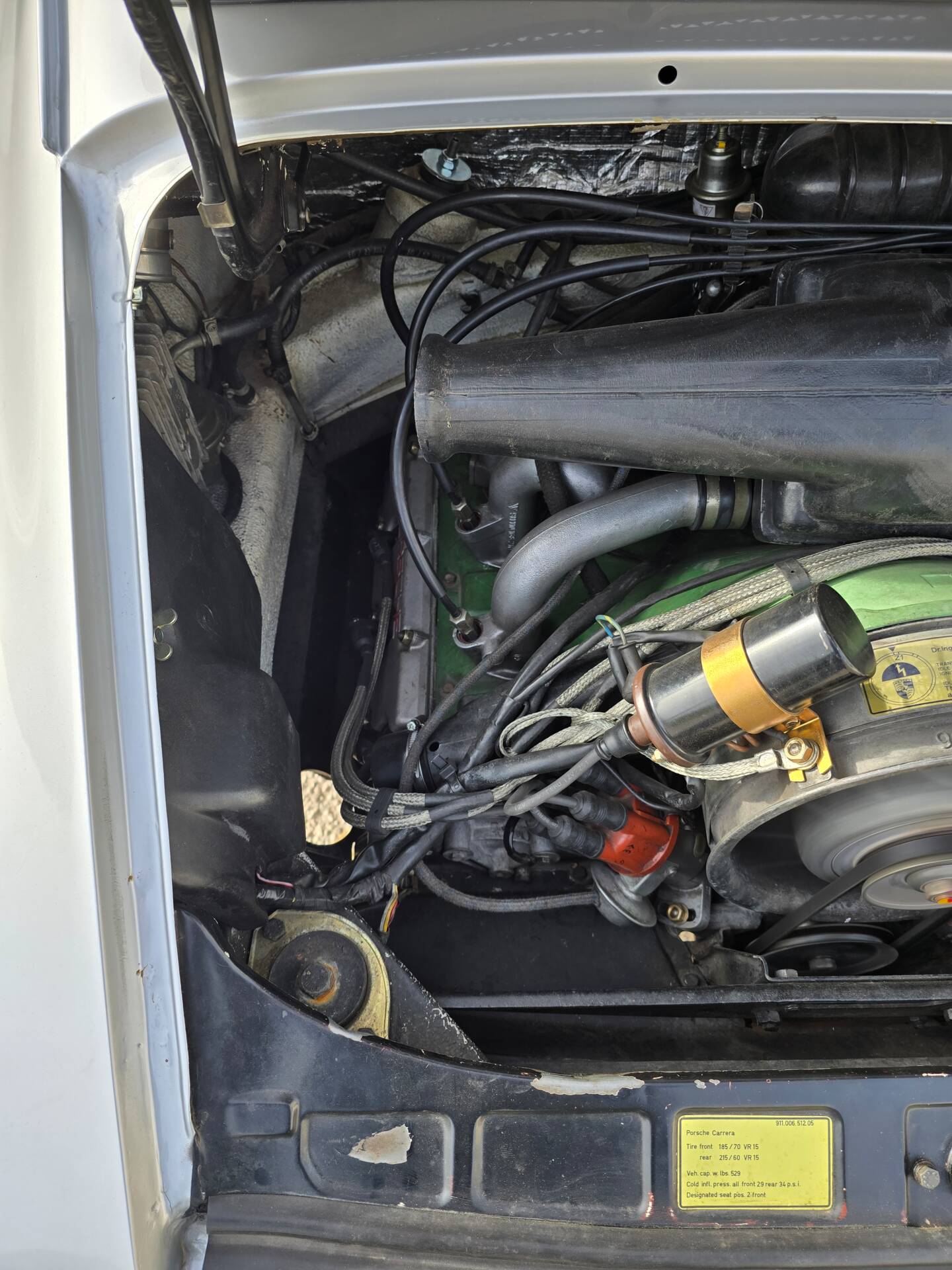 Der 2.7-Liter-Boxer wurde laut Vorbesitzer bereits überholt; belegbare Nachweise hierzu liegen jedoch nicht vor. Der Motorlauf wird als einwandfrei beschrieben, auch nach längeren Fahrten zeigt sich der Motor trocken und zuverlässig. Die jüngste große Wartung beim Porsche-Spezialisten (Mai 2025, ca. 3.500 EUR) umfasste eine umfassende Motorabstimmung, ergänzt durch frisches Porsche Classic Öl 20W50 sowie neue Zündkerzen, Mengenteiler-Check und Wechsel des Ölfilters. Die Bremsanlage erhielt einen neuen Hauptbremszylinder, neue Leitungen und Bremsflüssigkeit; die Stoßdämpfer (inkl. Domlager vorn) wurden ebenso wie alle vier Reifen erneuert. Die Vorderreifen stammen von Pirelli (DOT 2225), die Hinterreifen von Dunlop (DOT 2019). Verbaut sind PU-Buchsen für ein präzises, vibrationsarmes Fahrgefühl. Die originale Abgasanlage wurde durch eine Spaghettianlage ersetzt, die Wärmetauscher entfallen.