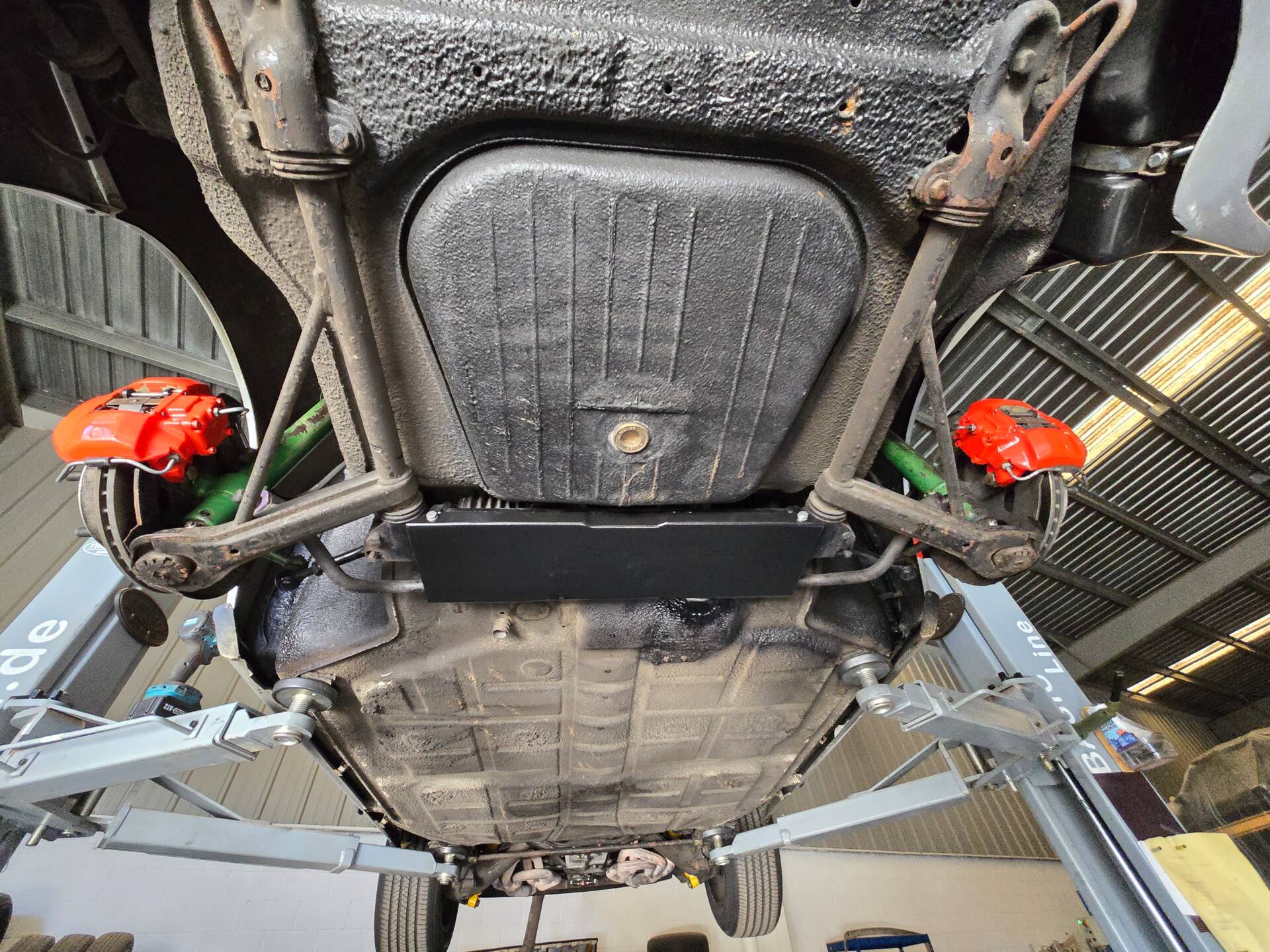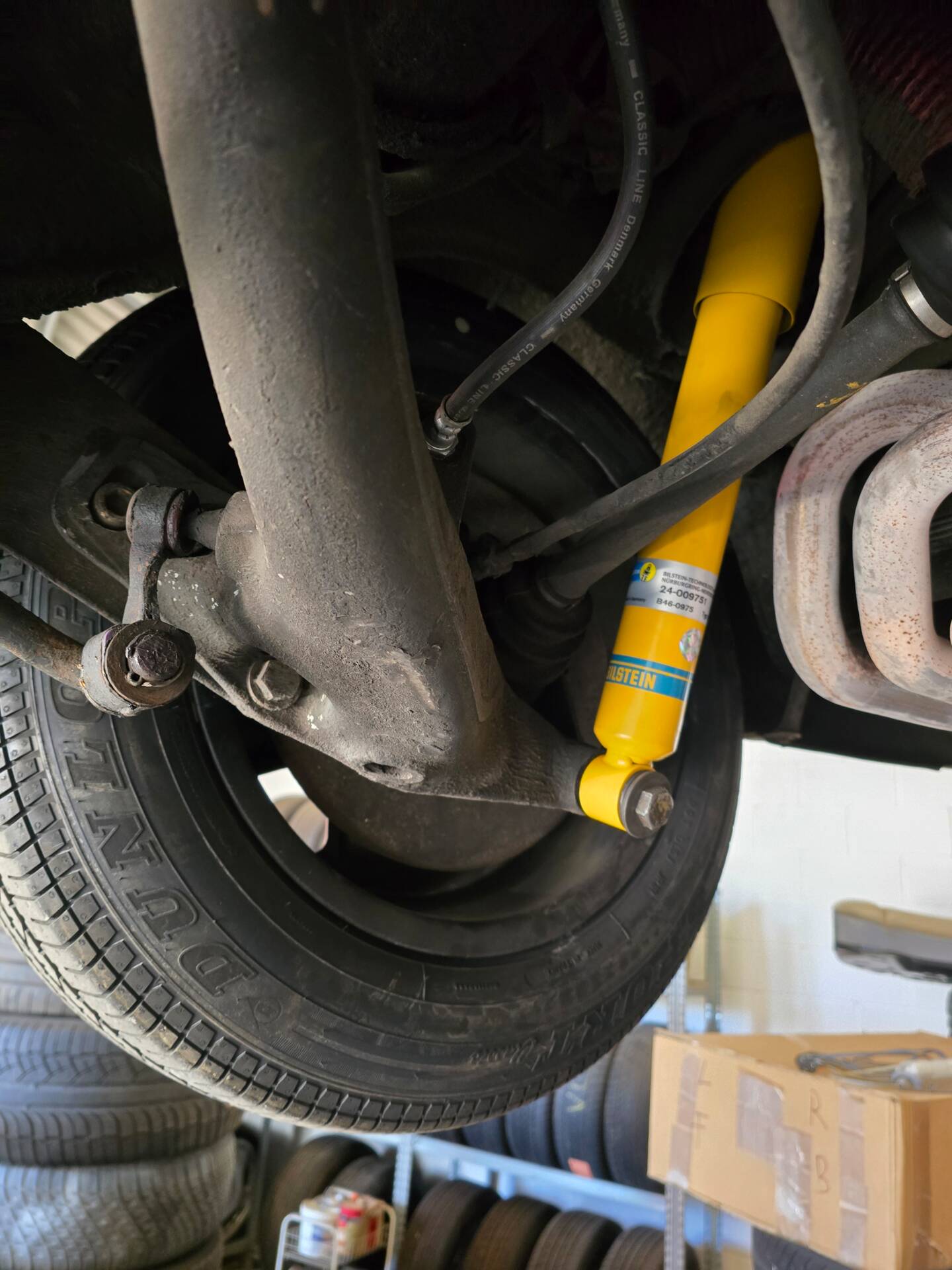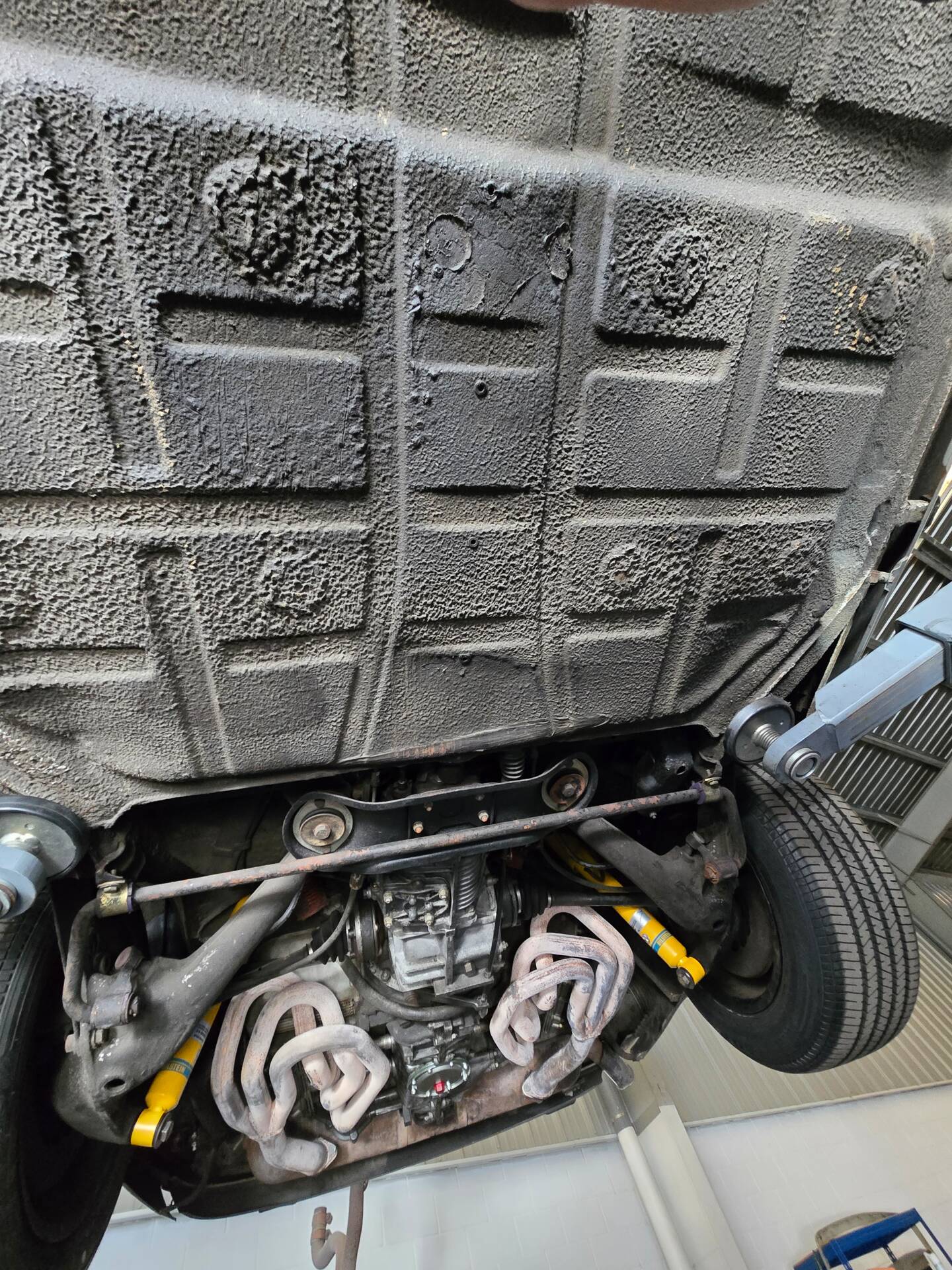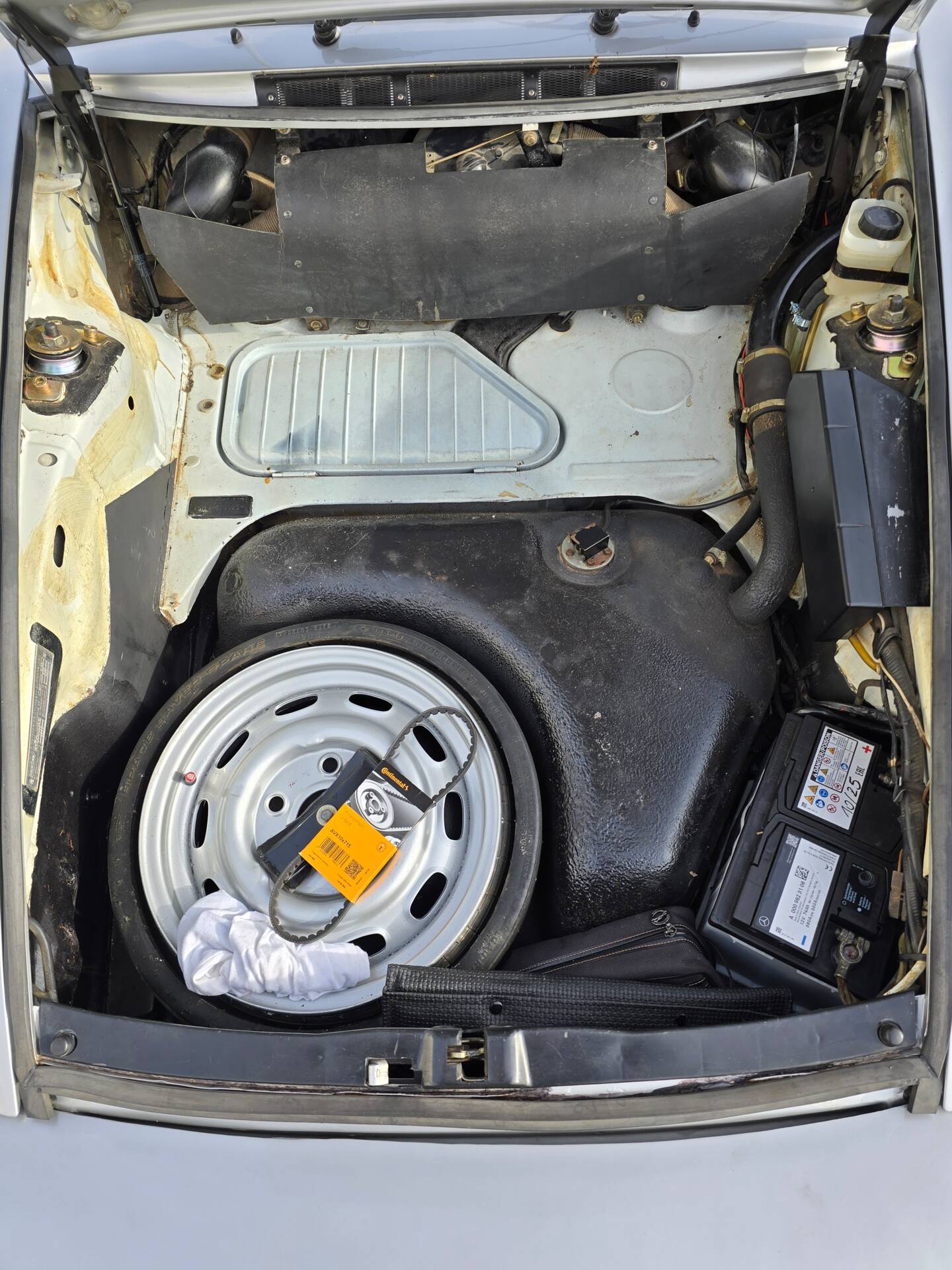 Der 2.7-Liter-Boxer wurde laut Vorbesitzer bereits überholt; belegbare Nachweise hierzu liegen jedoch nicht vor. Der Motorlauf wird als einwandfrei beschrieben, auch nach längeren Fahrten zeigt sich der Motor trocken und zuverlässig. Die jüngste große Wartung beim Porsche-Spezialisten (Mai 2025, ca. 3.500 EUR) umfasste eine umfassende Motorabstimmung, ergänzt durch frisches Porsche Classic Öl 20W50 sowie neue Zündkerzen, Mengenteiler-Check und Wechsel des Ölfilters. Die Bremsanlage erhielt einen neuen Hauptbremszylinder, neue Leitungen und Bremsflüssigkeit; die Stoßdämpfer (inkl. Domlager vorn) wurden ebenso wie alle vier Reifen erneuert. Die Vorderreifen stammen von Pirelli (DOT 2225), die Hinterreifen von Dunlop (DOT 2019). Verbaut sind PU-Buchsen für ein präzises, vibrationsarmes Fahrgefühl. Die originale Abgasanlage wurde durch eine Spaghettianlage ersetzt, die Wärmetauscher entfallen.