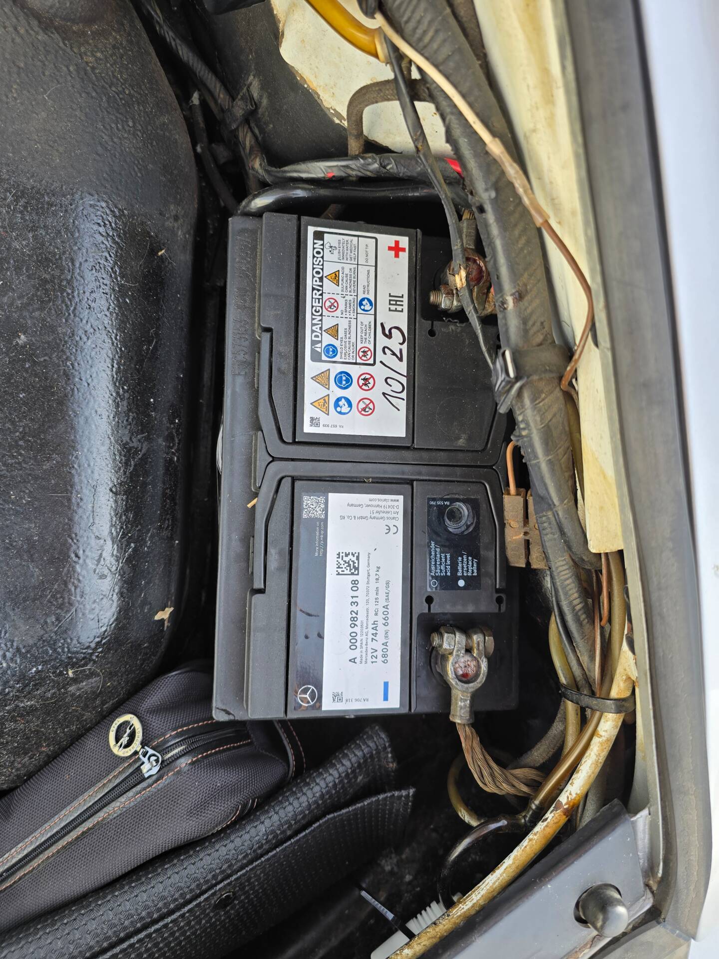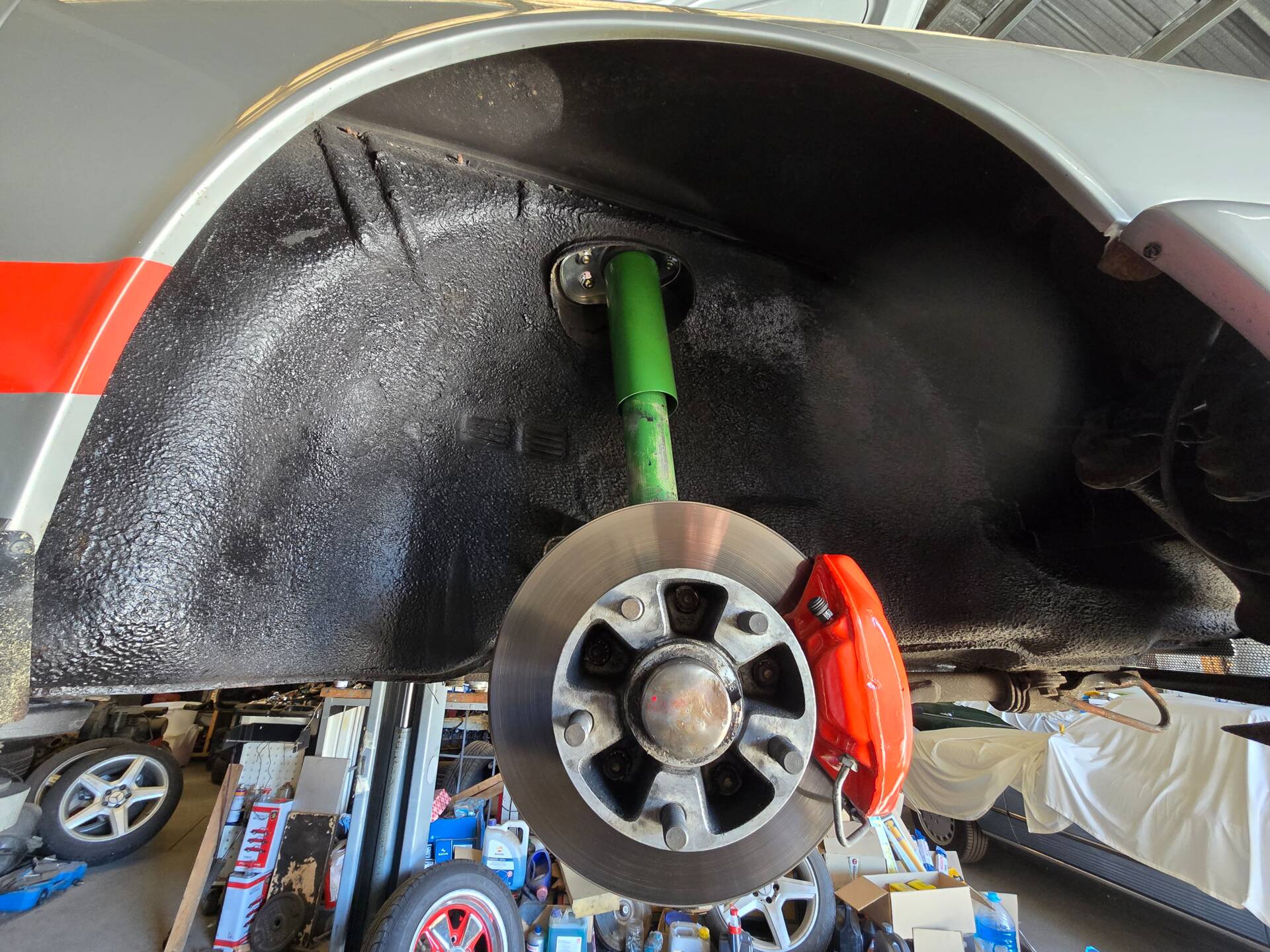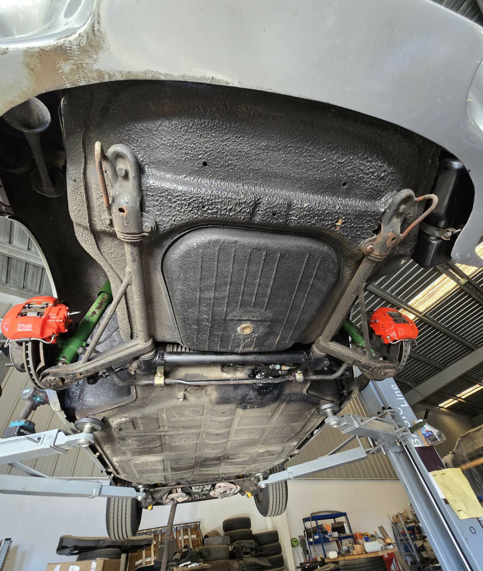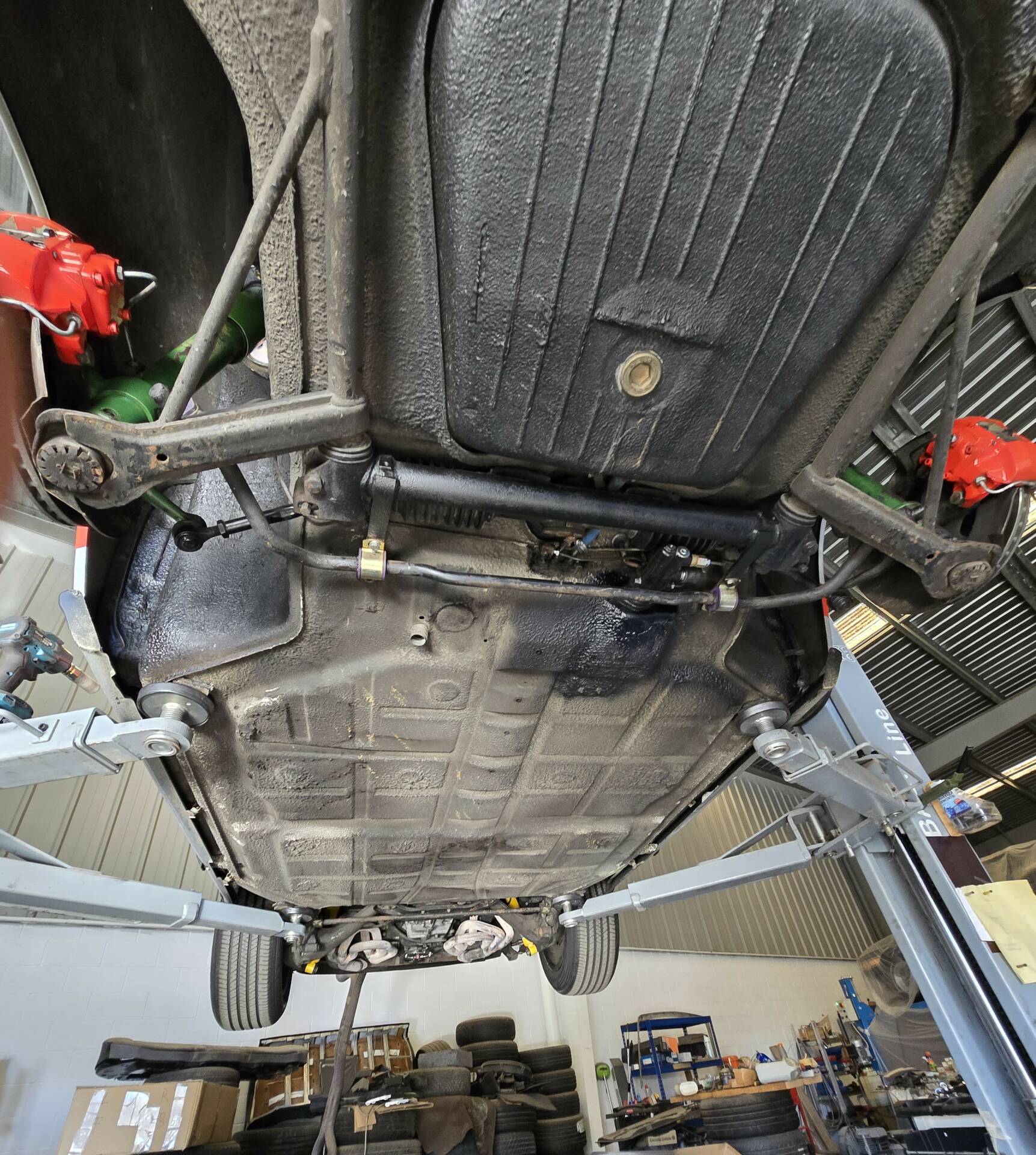 Der 2.7-Liter-Boxer wurde laut Vorbesitzer bereits überholt; belegbare Nachweise hierzu liegen jedoch nicht vor. Der Motorlauf wird als einwandfrei beschrieben, auch nach längeren Fahrten zeigt sich der Motor trocken und zuverlässig. Die jüngste große Wartung beim Porsche-Spezialisten (Mai 2025, ca. 3.500 EUR) umfasste eine umfassende Motorabstimmung, ergänzt durch frisches Porsche Classic Öl 20W50 sowie neue Zündkerzen, Mengenteiler-Check und Wechsel des Ölfilters. Die Bremsanlage erhielt einen neuen Hauptbremszylinder, neue Leitungen und Bremsflüssigkeit; die Stoßdämpfer (inkl. Domlager vorn) wurden ebenso wie alle vier Reifen erneuert. Die Vorderreifen stammen von Pirelli (DOT 2225), die Hinterreifen von Dunlop (DOT 2019). Verbaut sind PU-Buchsen für ein präzises, vibrationsarmes Fahrgefühl. Die originale Abgasanlage wurde durch eine Spaghettianlage ersetzt, die Wärmetauscher entfallen.