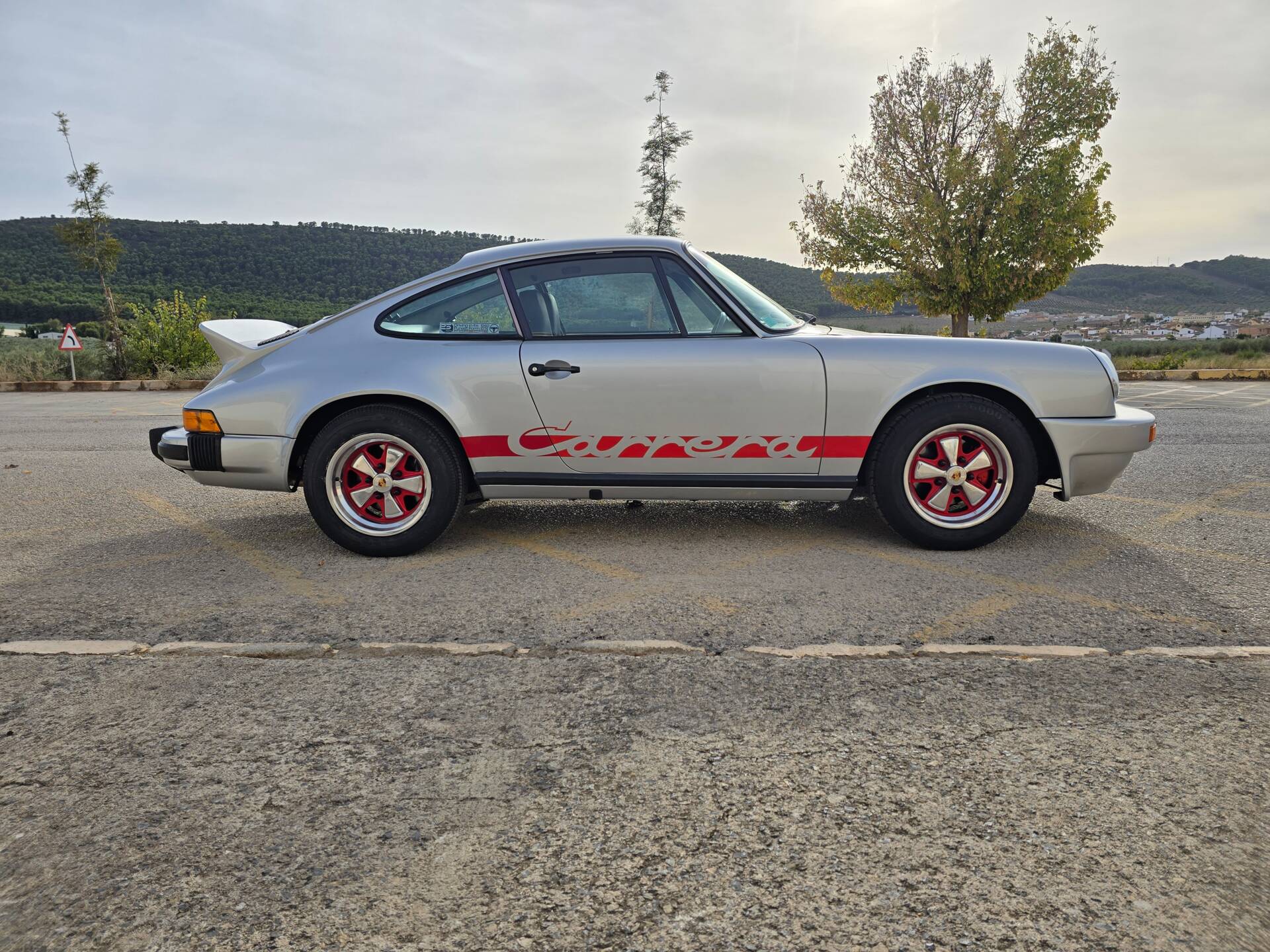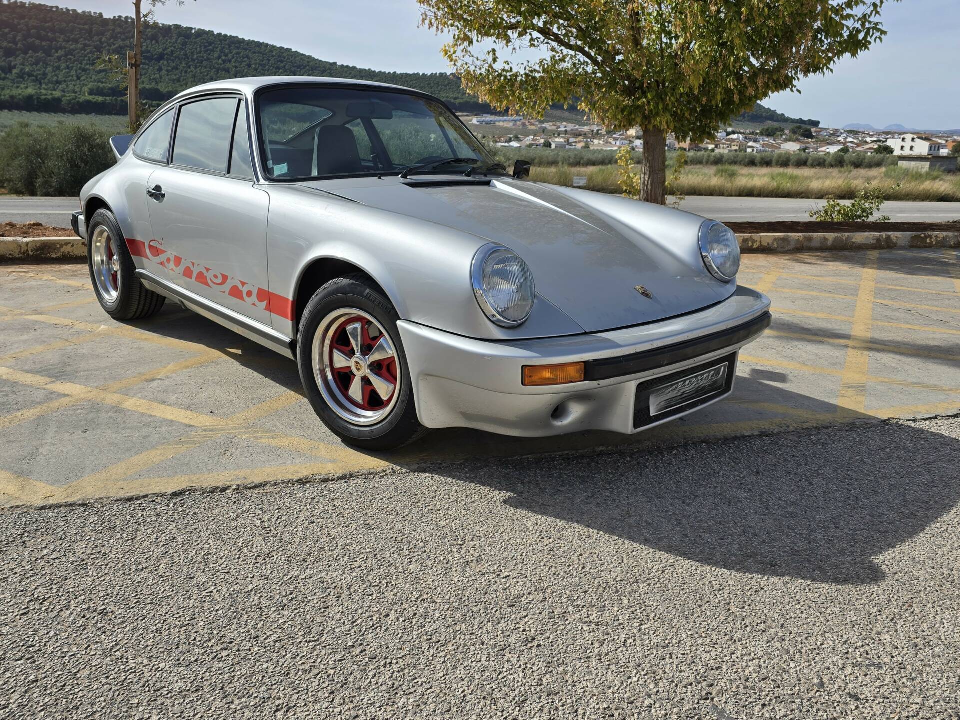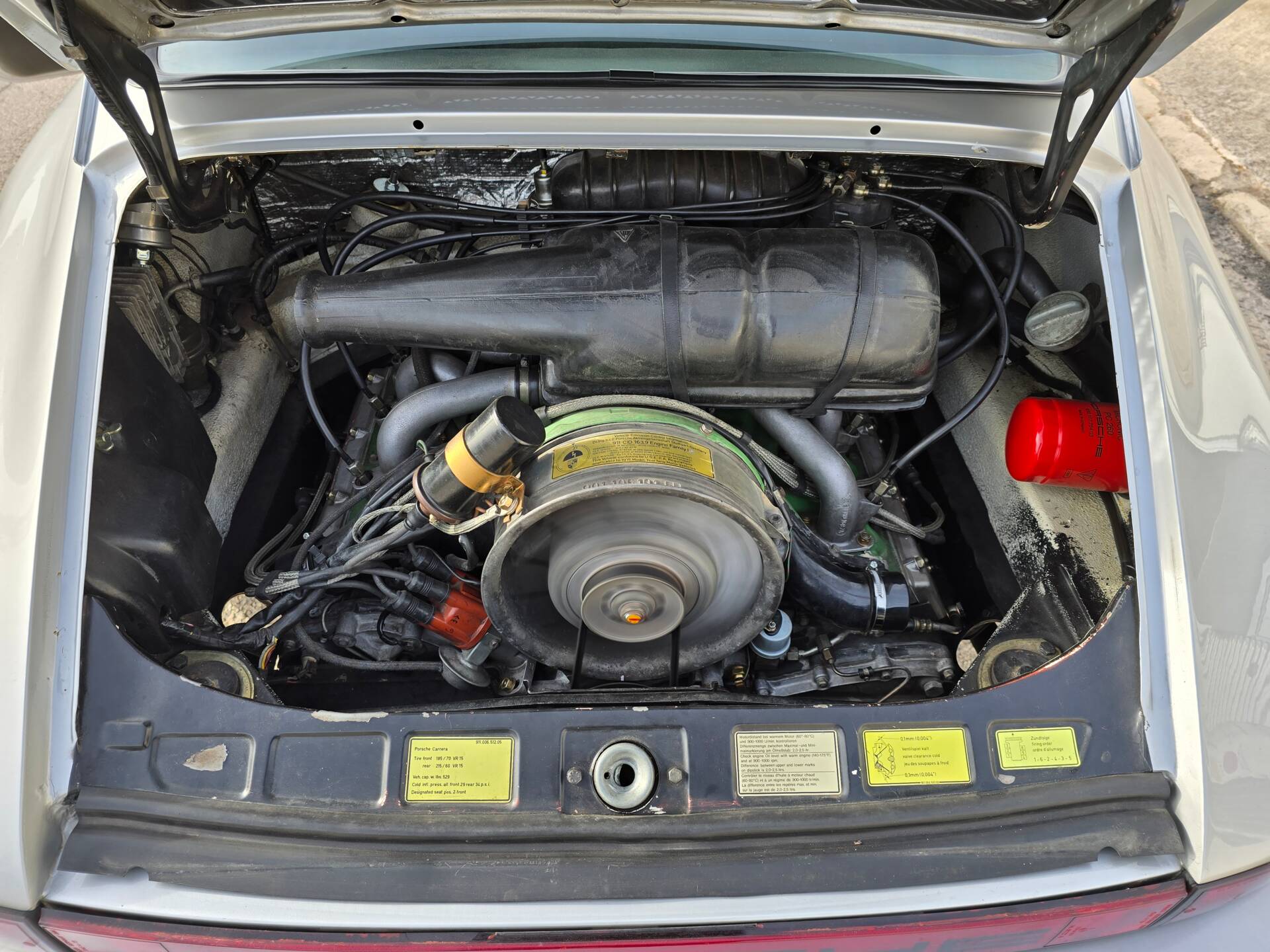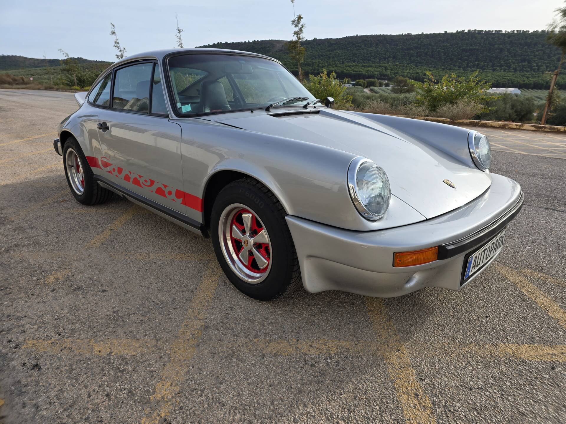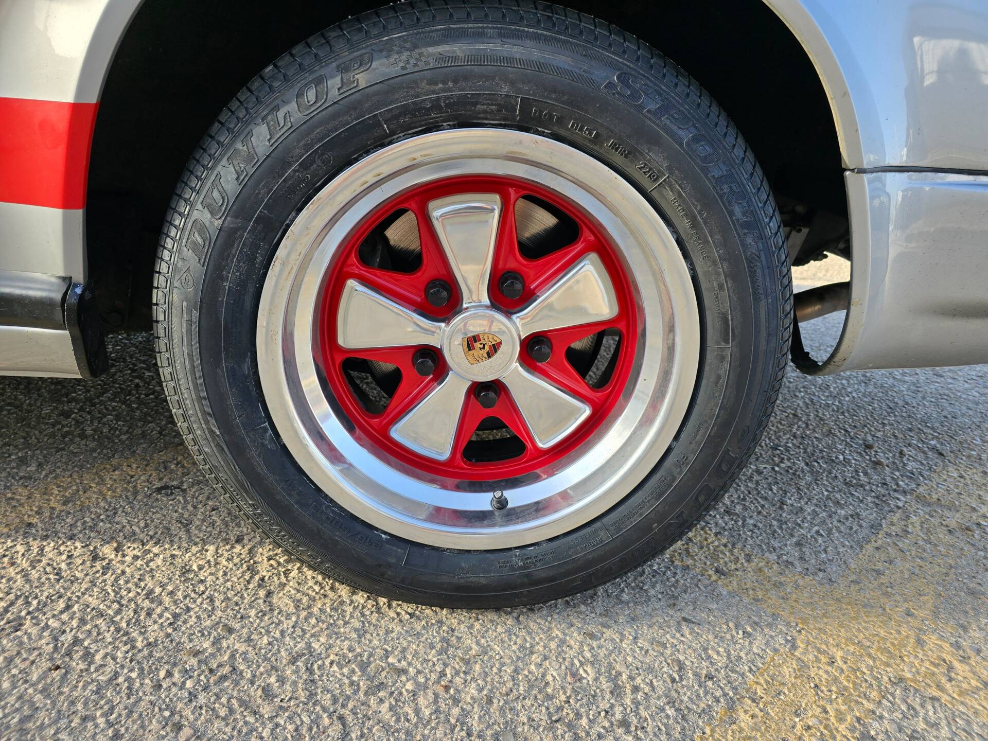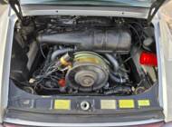 Der Wagen wurde ab Werk in Grandprix-Weiß ausgeliefert und im Zuge einer früheren Restaurierung in ein klassisches Porsche Silber umlackiert. Die aktuelle Farbkombination harmoniert mit den rot lackierten Fuchsfelgen im RS-Stil (Maxilite) und verleiht dem Coupé eine eigenständige, sportliche Optik. Der originale „Entenbürzel“ ist ebenso vorhanden wie die ab Werk montierten elektrischen Fensterheber und Colorverglasung. Die H4-Scheinwerfer wurden auf offiziell zugelassene LED-Birnen von Philips umgerüstet, um den zeitgenössischen Charakter mit verbesserter Alltagstauglichkeit zu verbinden. Optisch zeigen sich Front- und Heckpartie stimmig, die Lackqualität wird vom aktuellen Besitzer als sehr gut beschrieben.