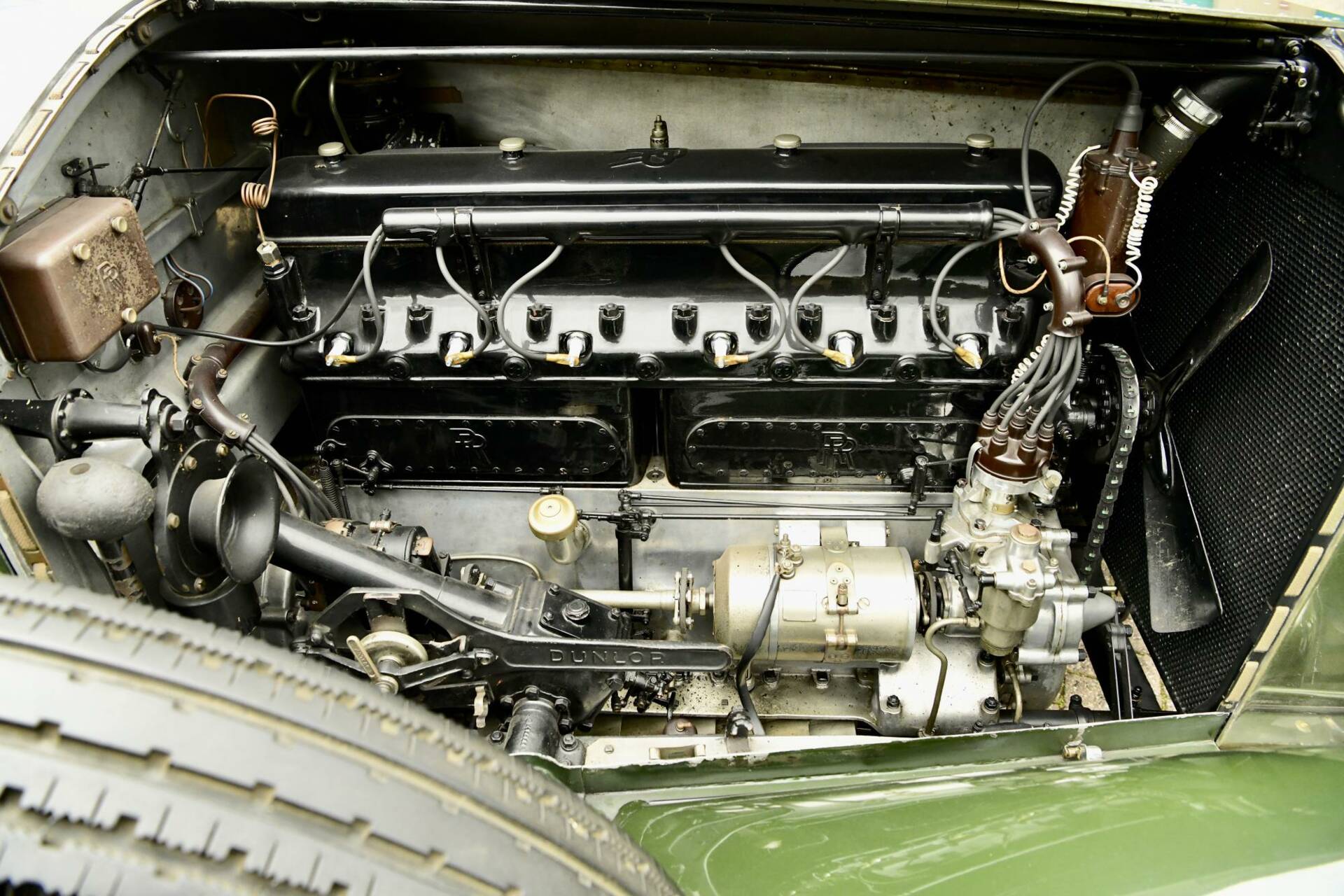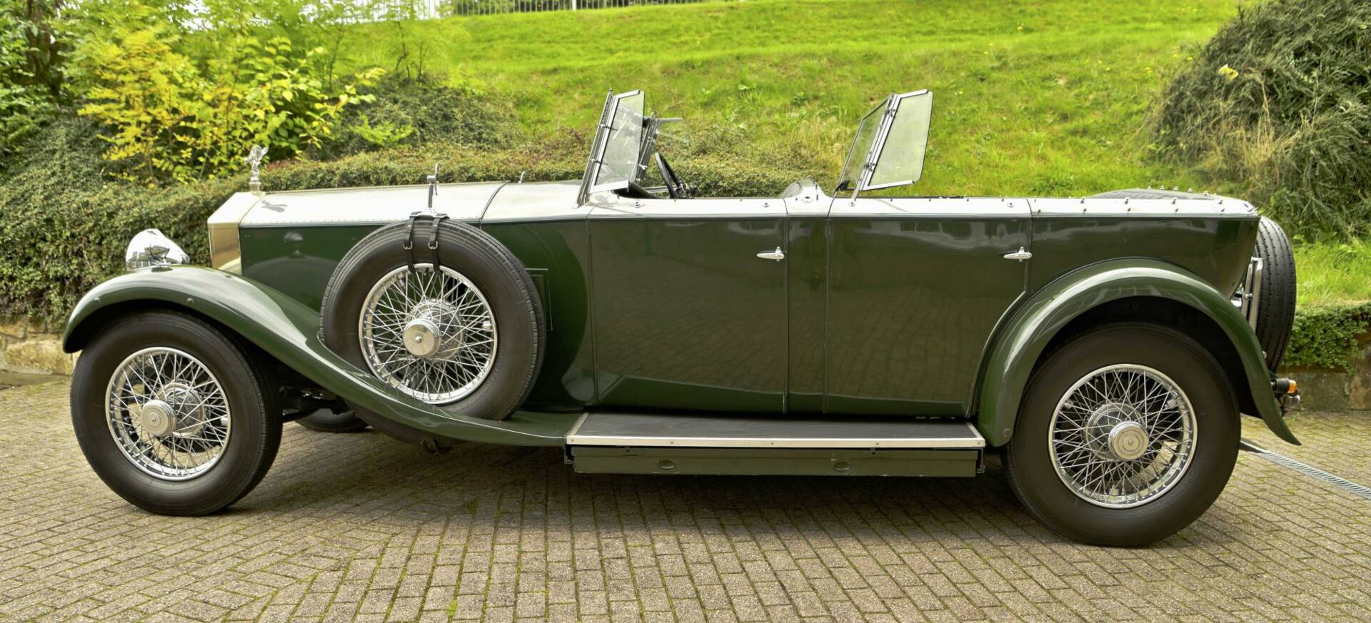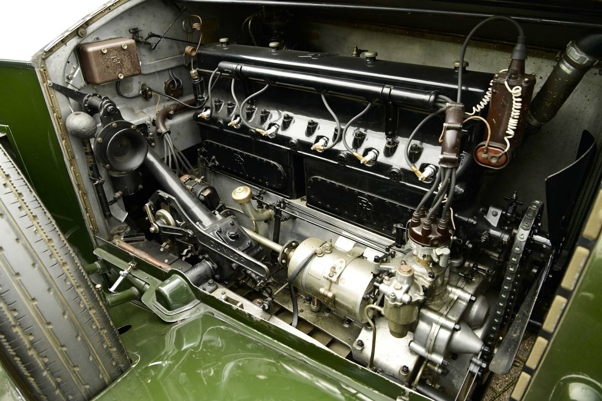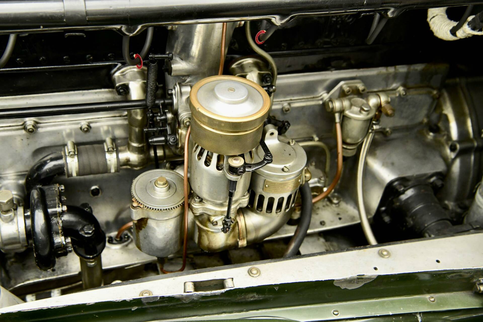 Coachwork is by noted coach builder Park Ward & takes the form of an open torpedo style tourer with twin windscreens to protect front & rear occupants alike. The bonnet top & upper surfaces of the body are of polished aluminium with the lower sections being a mid green in colour.