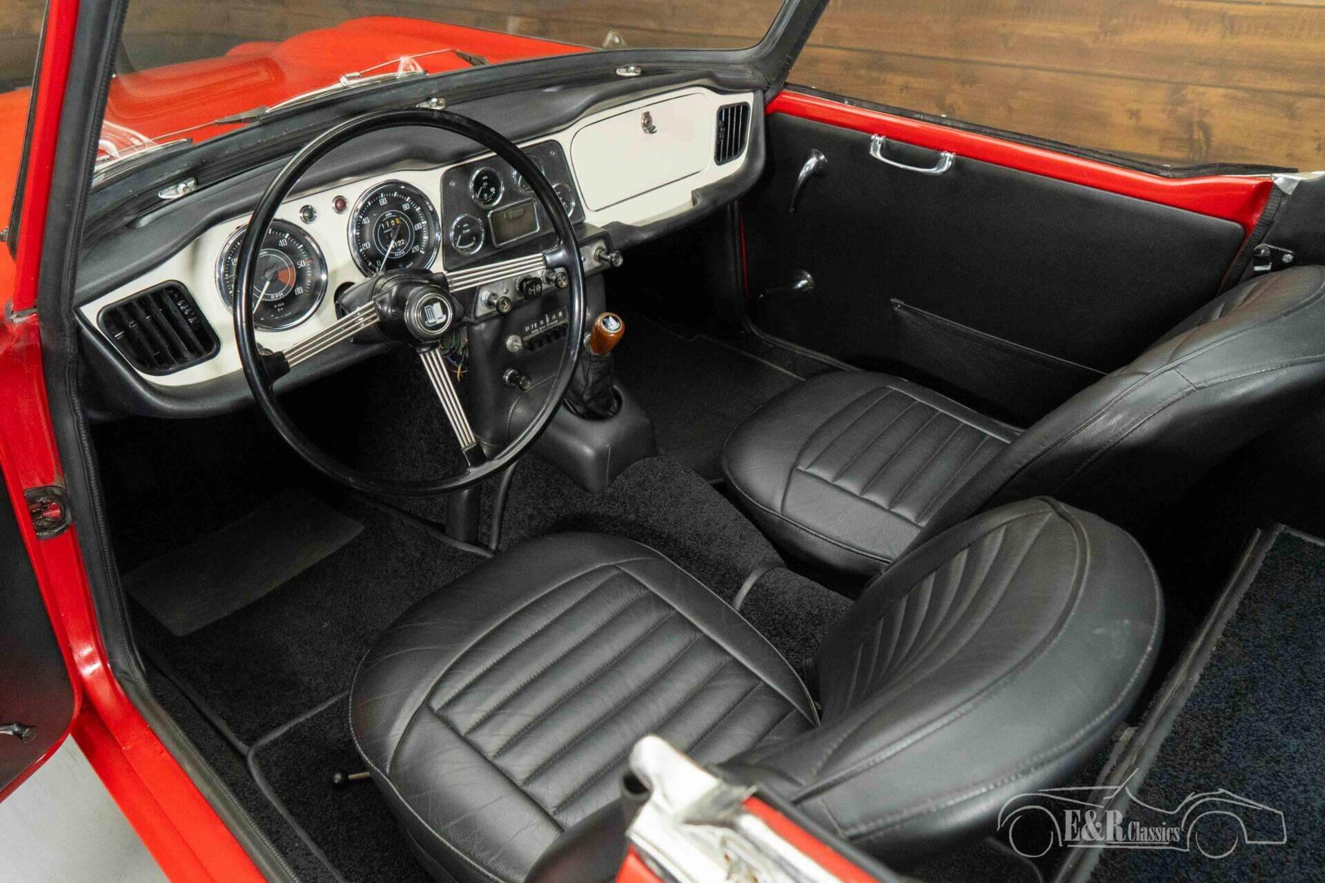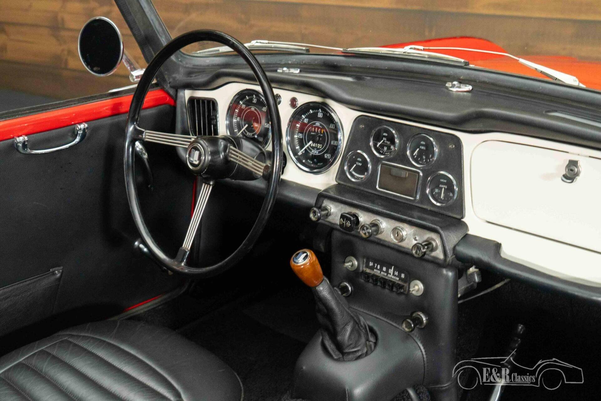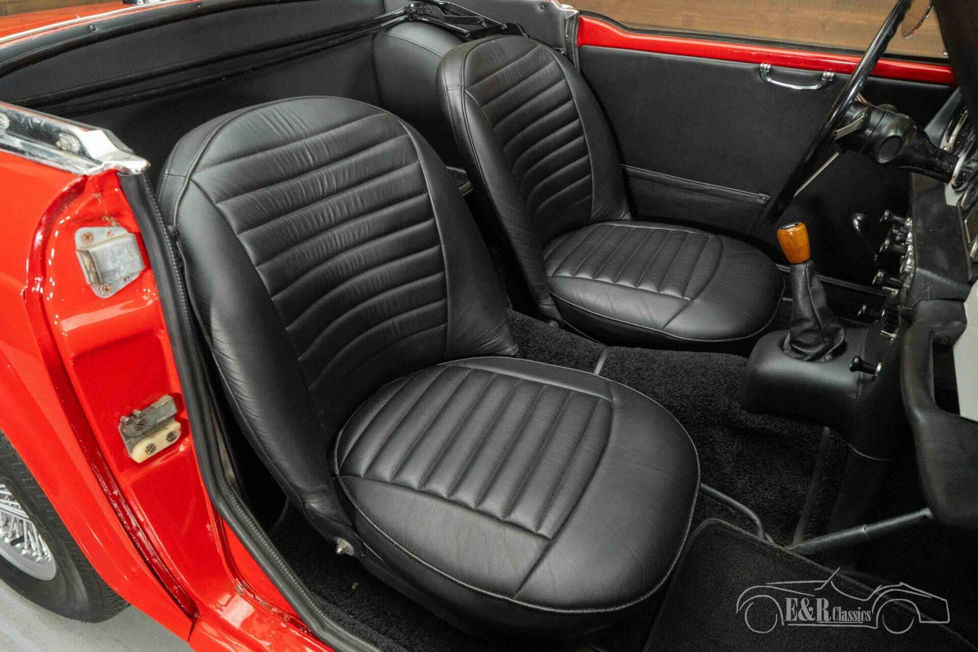 The exterior features stylish red paintwork that contrasts beautifully with the painted wire wheels and chrome details. The black soft top complements the timeless lines of the bodywork and makes this TR4 suitable for both open and closed-top driving. Inside, you'll find a well-maintained interior with black upholstery and a characteristic white dashboard, which together create a fresh, classic look. The interplay of the red exterior and the black-and-white interior gives this Triumph a sporty yet elegant appearance, perfectly in keeping with its British roots.