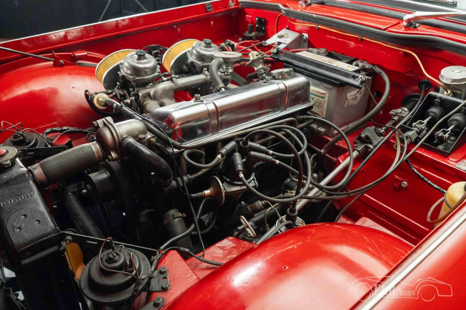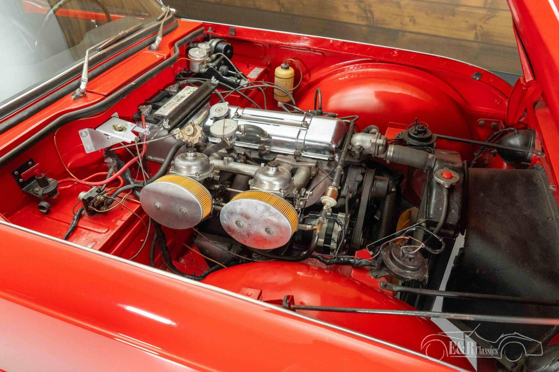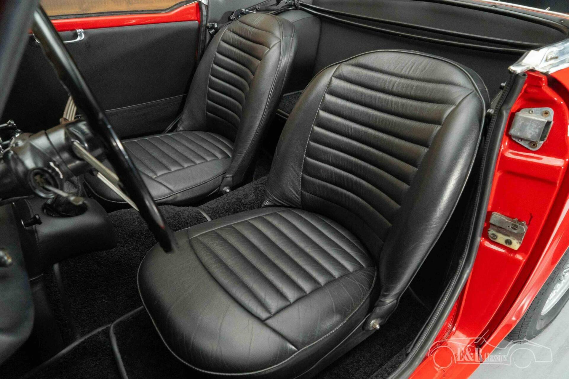 The exterior features stylish red paintwork that contrasts beautifully with the painted wire wheels and chrome details. The black soft top complements the timeless lines of the bodywork and makes this TR4 suitable for both open and closed-top driving. Inside, you'll find a well-maintained interior with black upholstery and a characteristic white dashboard, which together create a fresh, classic look. The interplay of the red exterior and the black-and-white interior gives this Triumph a sporty yet elegant appearance, perfectly in keeping with its British roots.